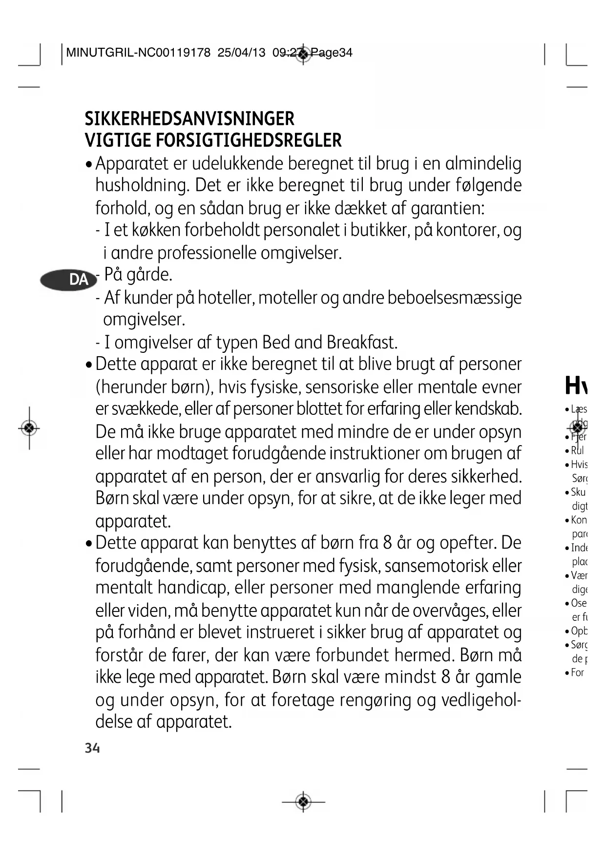 Dette apparat kan benyttes af børn fra 8 år og opefter. De forudgående, samt personer med fysisk, sansemotorisk eller mentalt handicap, eller personer med manglende erfaring eller viden, må benytte apparatet kun når de overvåges, eller på forhånd er blevet instrueret i sikker brug af apparatet og forstår de farer, der kan være forbundet hermed. Børn må ikke lege med apparatet. Børn skal være mindst 8 år gamle og under opsyn, for at foretage rengøring og vedligehol- delse af apparatet.