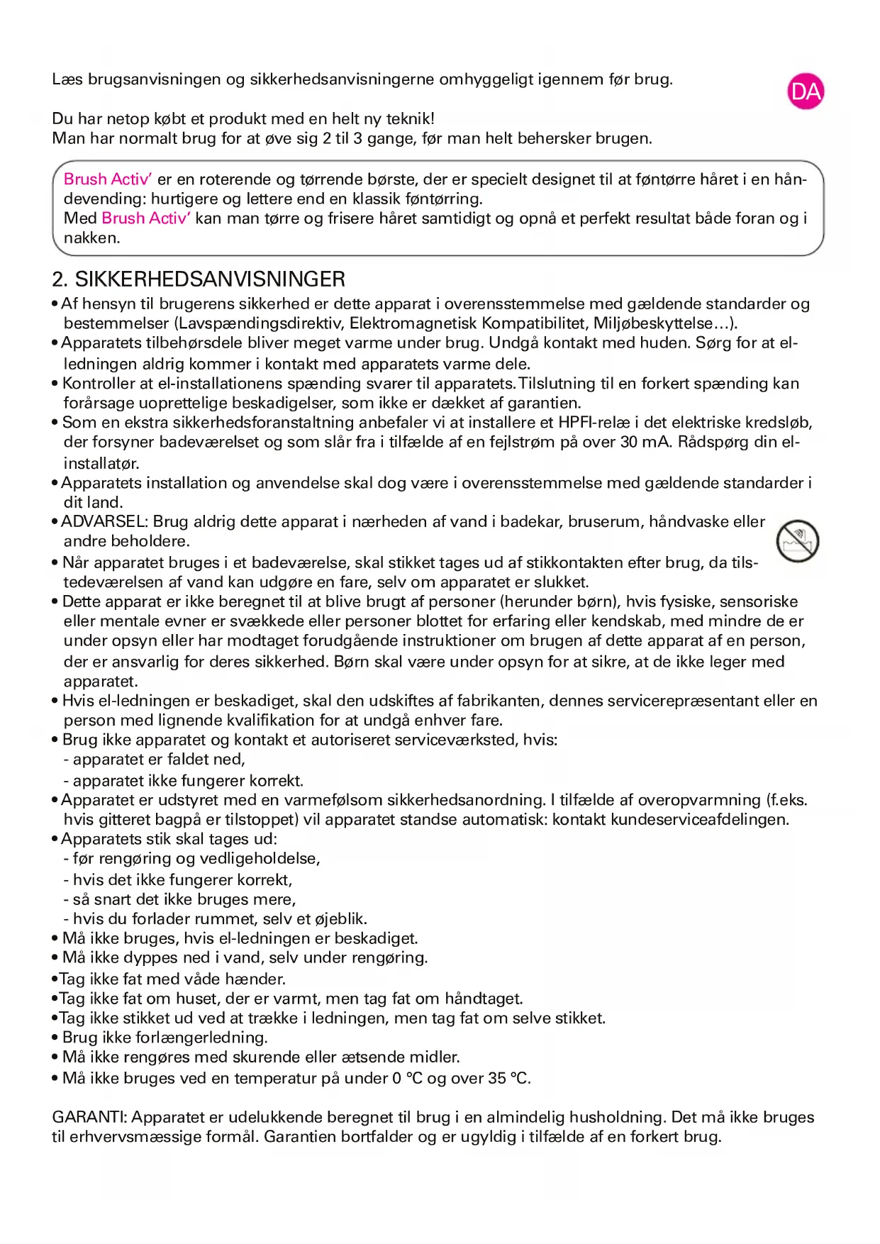 Læs brugsanvisningen og sikkerhedsanvisningerne omhyggeligt igennem før brug. Du har netop købt et produkt med en helt ny teknik! Man har normalt brug for at øve sig 2 til 3 gange, før man helt behersker brugen. Brush Activ’ er en roterende og tørrende børste, der er specielt designet til at føntørre håret i en hån- devending: hurtigere og lettere end en klassik føntørring. Med Brush Activ’ kan man tørre og frisere håret samtidigt og opnå et perfekt resultat både foran og i nakken.