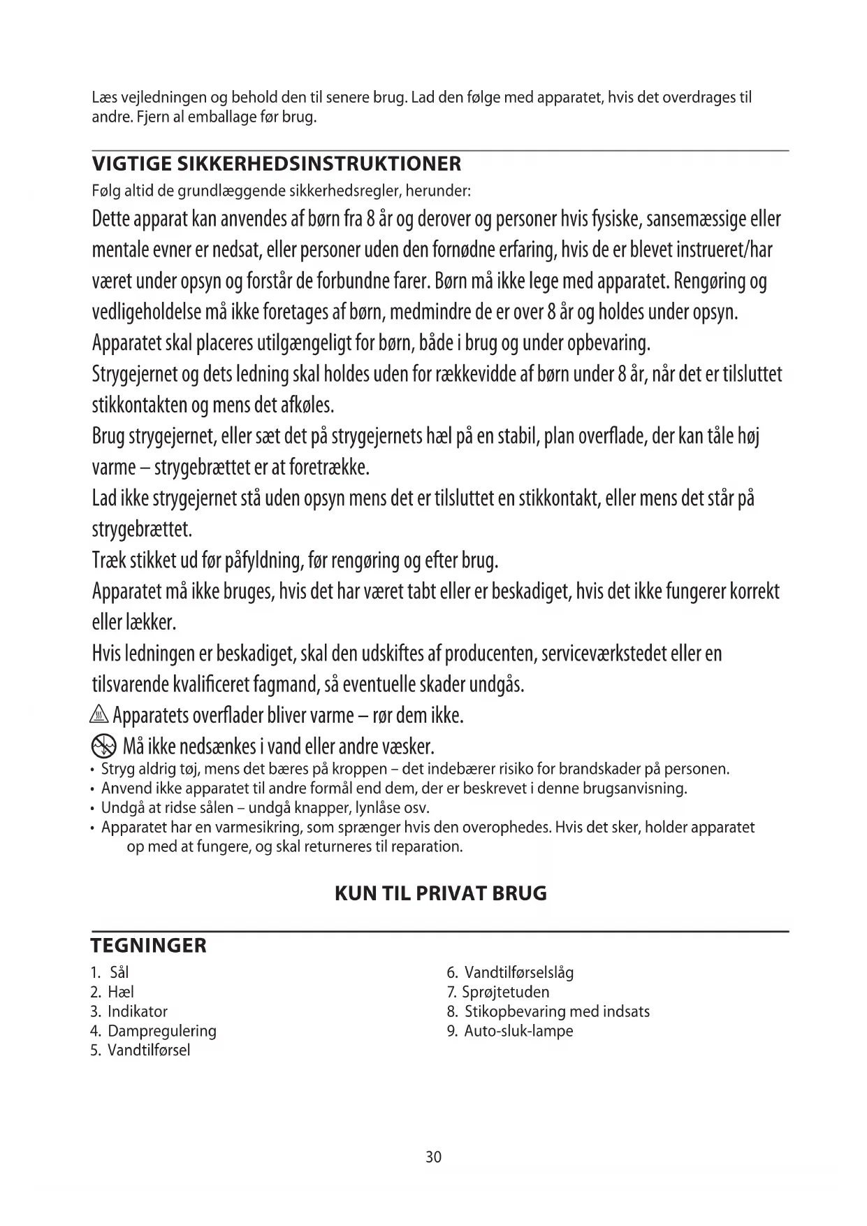 AE30 Læs vejledningen og behold den til senere brug. Lad den følge med apparatet, hvis det overdrages til andre. Fjern al emballage før brug. VIGTIGE SIKKERHEDSINSTRUKTIONER Følg altid de grundlæggende sikkerhedsregler, herunder: Dette apparat kan anvendes af børn fra 8 år og derover og personer hvis fysiske, sansemæssige eller mentale evner er nedsat, eller personer uden den fornødne erfaring, hvis de er blevet instrueret/har været under opsyn og forstår de forbundne farer. Børn må ikke lege med apparatet. Rengøring og vedligeholdelse må ikke foretages af børn, medmindre de er over 8 år og holdes under opsyn. Apparatet skal placeres utilgængeligt for børn, både i brug og under opbevaring. Strygejernet og dets ledning skal holdes uden for rækkevidde af børn under 8 år, når det er tilsluttet stikkontakten og mens det afkøles. Brug strygejernet, eller sæt det på strygejernets hæl på en stabil, plan overflade, der kan tåle høj varme – strygebrættet er at foretrække. Lad ikke strygejernet stå uden opsyn mens det er tilsluttet en stikkontakt, eller mens det står på strygebrættet. Træk stikket ud før påfyldning, før rengøring og efter brug. Apparatet må ikke bruges, hvis det har været tabt eller er beskadiget, hvis det ikke fungerer korrekt eller lækker. Hvis ledningen er beskadiget, skal den udskiftes af producenten, serviceværkstedet eller en tilsvarende kvalificeret fagmand, så eventuelle skader undgås. h Apparatets overflader bliver varme – rør dem ikke.