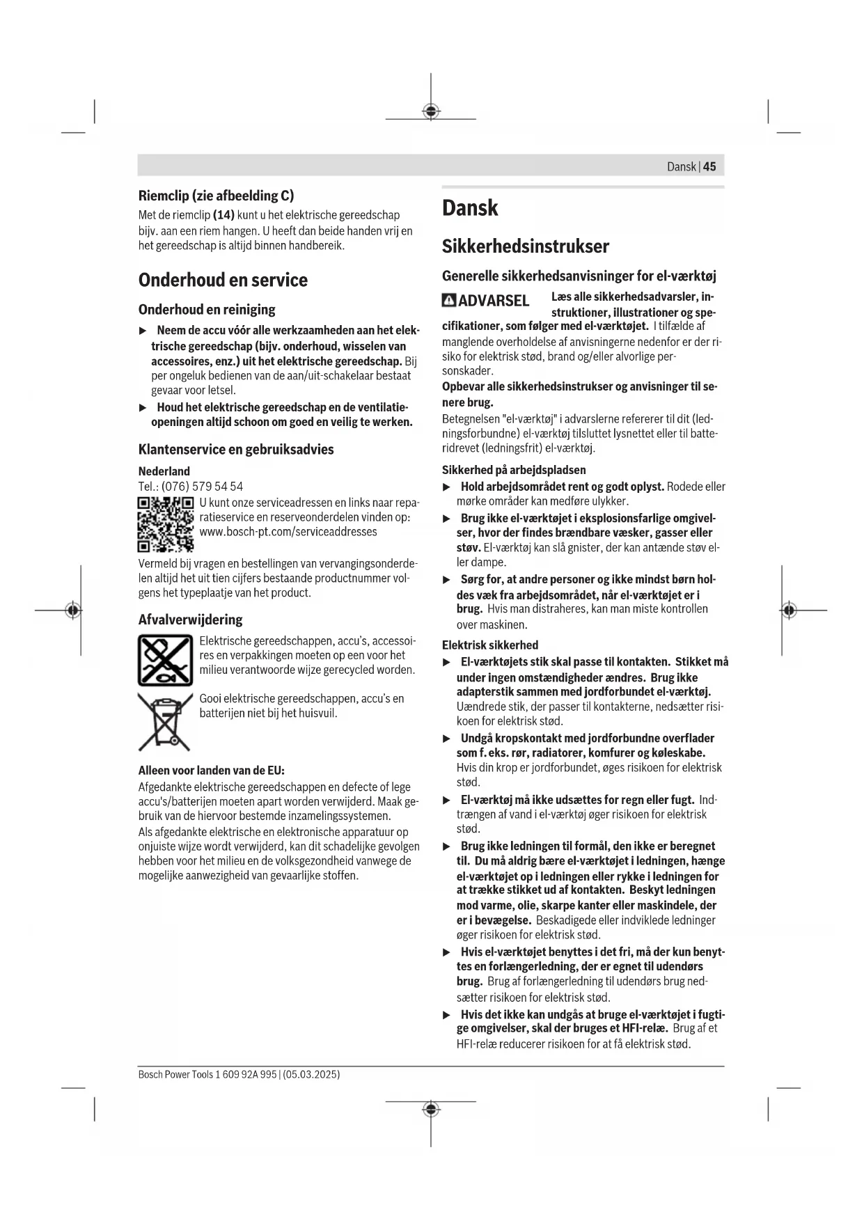 Drej muffen til den selvspændende borepatron (2) kraftigt i rotationsretningen ➋ med hånden. Borepatronen låses der- efter automatisk. 1 609 92A 995 | (05.03.2025) Bosch Power ToolsDansk | 49 Låsen løsnes igen, hvis du drejer muffen med uret, når du vil fjerne værktøjet. Støv-/spånudsugning Støv fra materialer som f.eks. blyholdig maling, nogle træ- sorter, mineraler og metal kan være sundhedsfarlige. Berø- ring eller indånding af støv kan føre til allergiske reaktioner og/eller åndedrætssygdomme hos brugeren eller personer, der opholder sig i nærheden af arbejdspladsen. Bestemt støv som f.eks. ege- eller bøgestøv gælder som kræftfremkaldende, især i forbindelse med ekstra stoffer til træbehandling (chromat, træbeskyttelsesmiddel). Asbest- holdigt materiale må kun bearbejdes af fagfolk. – Sørg for god udluftning af arbejdspladsen. – Det anbefales at bære åndeværn med filterklasse P2. Overhold forskrifterne, der gælder i dit land vedr. de materi- aler, der skal bearbejdes. u Undgå at der samler sig støv på arbejdspladsen. Støv kan let antænde sig selv. Brug Ibrugtagning Indstilling af rotationsretning (se billede B) Med retningsomskifteren (5) kan du ændre el-værktøjets drejeretning. Ved nedtrykket start-stop-kontakt (8) er dette imidlertid ikke muligt. Højreløb: Ved boring og iskruning af skruer skal du skubbe drejeretningsomskifteren (5) til venstre til anslag. Venstreløb: Ved løsnelse eller udskruning af skruer skal du skubbe retningsomskifteren (5) mod højre til anslag. Forvalg af drejningsmoment Med indstillingsringen til forvalg af drejningsmoment(3) kan du forvælge det nødvendige drejningsmoment i 20trin. Ved den korrekte indstilling standser indsatsværktøjet, så snart skruen er skruet ind, eller det indstillede drejningsmoment er nået. I positionen er beskyttelseskoblingen deakti- veret, f.eks. ved boring. Vælg eventuelt en højere indstilling ved udskruning af skru- er, eller indstil på symbolet . I positionen opnås det maksimale drejningsmoment til boring og skruning. Mekanisk gearvalg u Aktivér kun gearvælgeren (4), når elværktøjet står stille. u Skub altid gearvælgeren til anslag. Ellers kan el‑værktø- jet blive beskadiget. Med gearvælgeren (4) kan du forvælge 2 omdrejningstalom- råder. Position gearvælger (4) Omdrej- ningstal Drejnings- moment Anvendelsesområ-