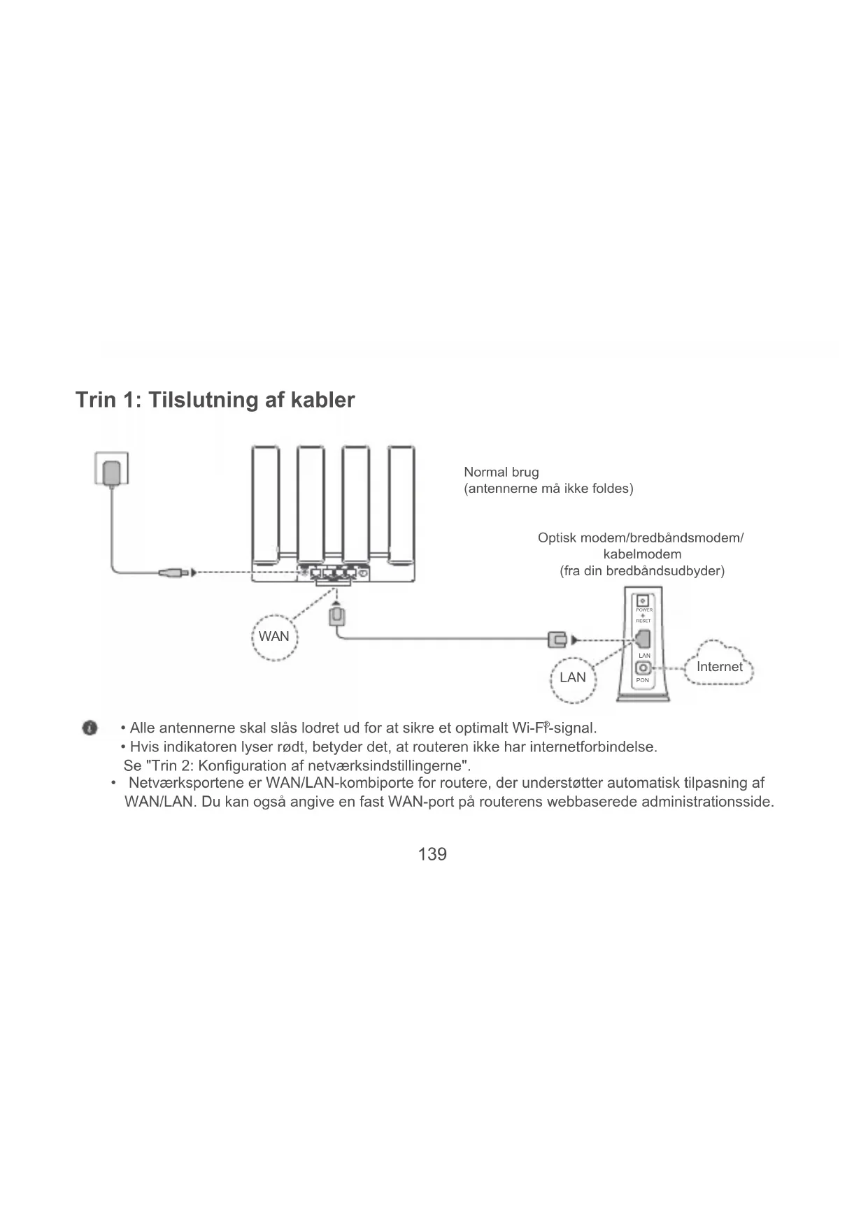 POWER LAN PON RESET Trin 1: Tilslutning af kabler WAN LAN Internet Optisk modem/bredbåndsmodem/ kabelmodem (fra din bredbåndsudbyder) Normal brug (antennerne må ikke foldes)