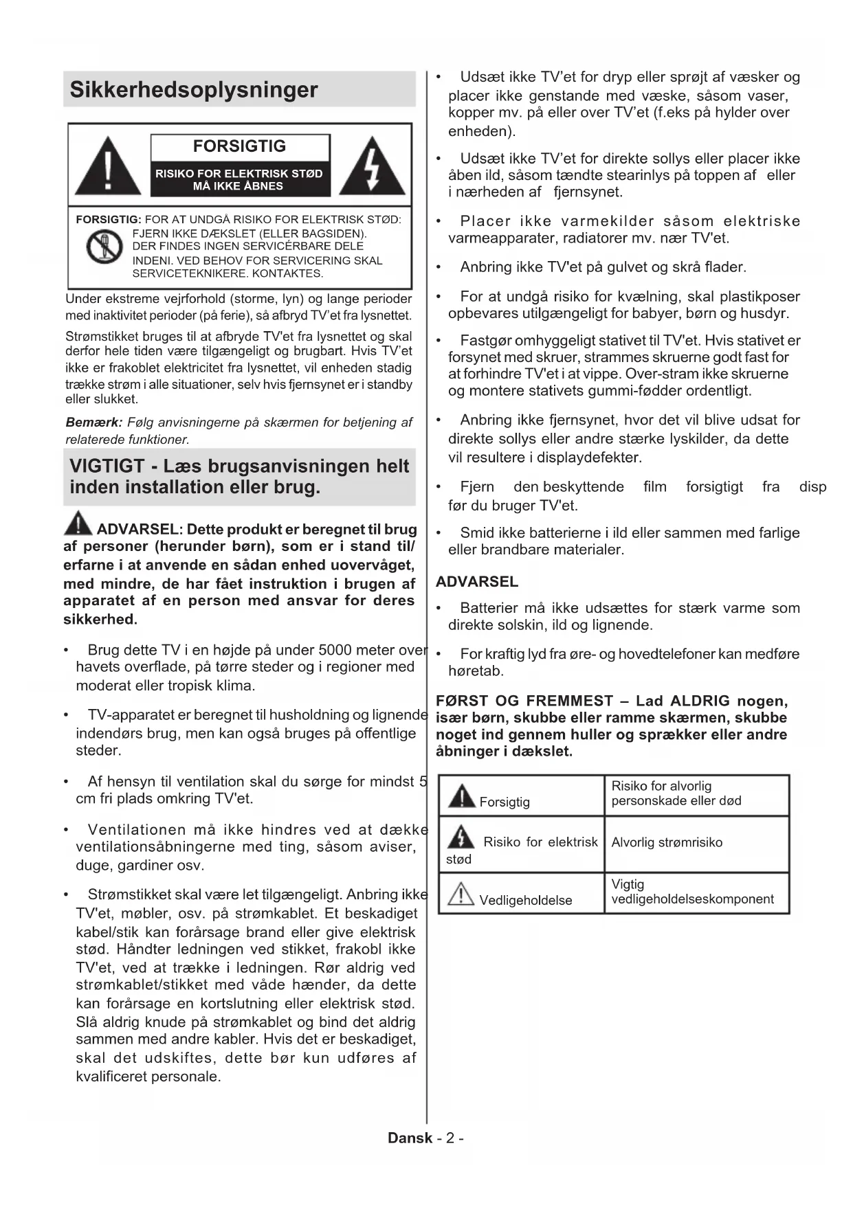 gelige driftsforhold. ADVARSEL Batteriet må ikke sluges. Giver risiko for kemiske ætsningsskader Dette produkt eller tilbehøret, som leveres sammen med produktet, kan indeholde et batteri i knapstørrelse. Hvis knapcellebatteriet sluges, kan det medføre alvorlige indre ætse-skader på bare 2 timer, hvilket kan være livsfarligt. Opbevar nye og brugte batterier utilgængeligt for børn. Hvis batteridækslet ikke lukker ordentligt, skal du stoppe med at bruge produktet og opbevare det utilgængeligt for børn. Hvis du har mistanke om at batterier kan være blevet slugt eller placeret inde i en del af kroppen, skal du straks søge lægehjælp. – – – – – – – – – – – – Et TV kan falde ned og forårsage alvorlig personskade eller død. Mange skader, især for børn, kan undgås ved at tage simple forholdsregler, såsom: Brug ALTID kabinetter stativer eller monteringsmetoder, der er anbefalet af producenten af fjernsynet. Brug ALTID møbler, der kan understøtte TV’et sikkert. Sørg ALTID for at TV’et ikke rager ud over kanten af støttemøblet. Lær ALTID børn om farerne ved at klatre op på møbler for at kunne nå TV'et eller dets kontrolknapper. Sæt ALTID ledninger og kabler, der er tilsluttet dit TV, så man ikke kan snuble, trække i dem eller gribe dem. Anbring ALDRIG et TV-apparat på et ustabilt sted. Anbring ALDRIG fjernsynet på høje møbler (f.eks. skabe eller bogreoler) uden at forankre både møbler og TV til en passende støtte. Anbring ALDRIG TV’et på stof eller andre materialer, der er placeret mellem TV’et og støttemøbler. Placer ALDRIG genstande, der kan friste børn til at klatre, såsom legetøj og fjernbetjeninger, på toppen af TV'et eller møblerne, som fjernsynet er placeret på.