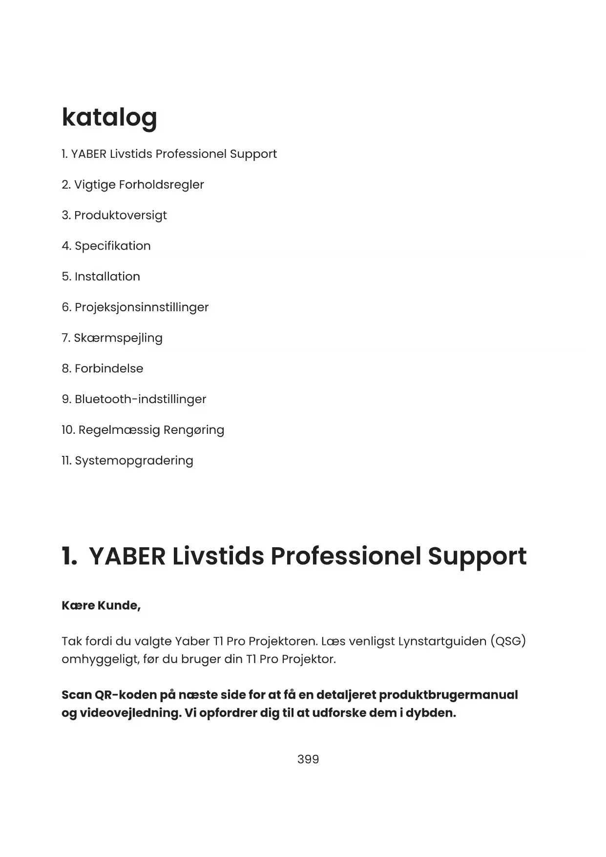 Kære Kunde, Tak fordi du valgte Yaber T1 Pro Projektoren. Læs venligst Lynstartguiden (QSG) omhyggeligt, før du bruger din T1 Pro Projektor. Scan QR-koden på næste side for at få en detaljeret produktbrugermanual og videovejledning. Vi opfordrer dig til at udforske dem i dybden.