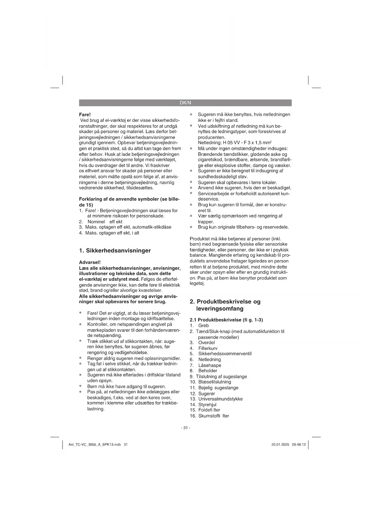 Advarsel! Inden produktet sluttes til strømforsy- ningsnettet, skal det kontrolleres, at angivelserne på mærkepladen svarer til strømforsyningsnettets data. Sugeren må kun tilsluttes en jordet stikdåse!