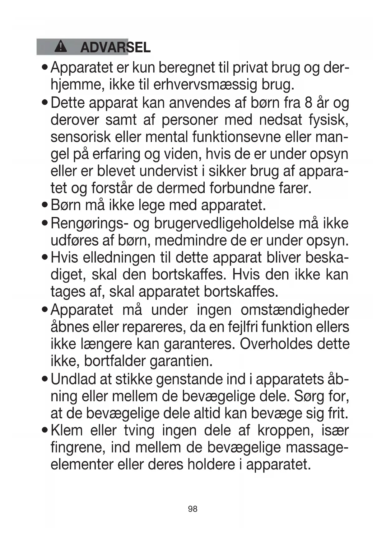 Klem eller tving ingen dele af kroppen, især fingrene, ind mellem de bevægelige massage- elementer eller deres holdere i apparatet.99