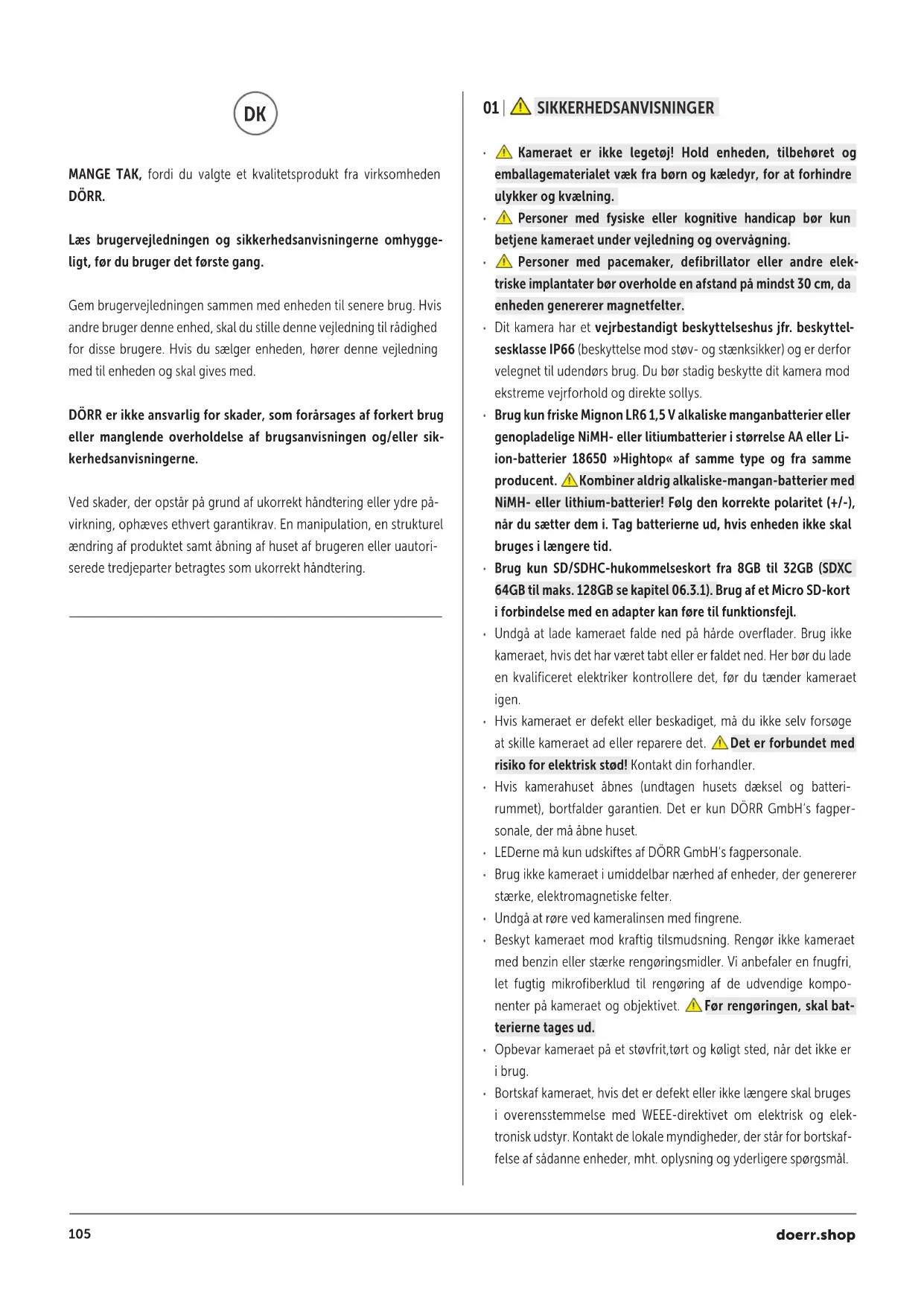 Rengør ikke kameraet med benzin eller skrappe rengøringsmidler. Vi anbefaler at bruge en fnugfri, let fugtig mikrofiberklud til at rengøre kameraets udvendige dele. Nedsænk aldrig kameraet i vand for at rengøre det. Tag batterierne ud før rengøring! Opbevar ka- meraet på et støvfrit, tørt og køligt sted, når det ikke er i brug. Kameraet er ikke legetøj - hold det uden for børns rækkevidde. Hold kameraet væk fra kæledyr. 12 | LEVERINGSOMFANGdoerr.shop