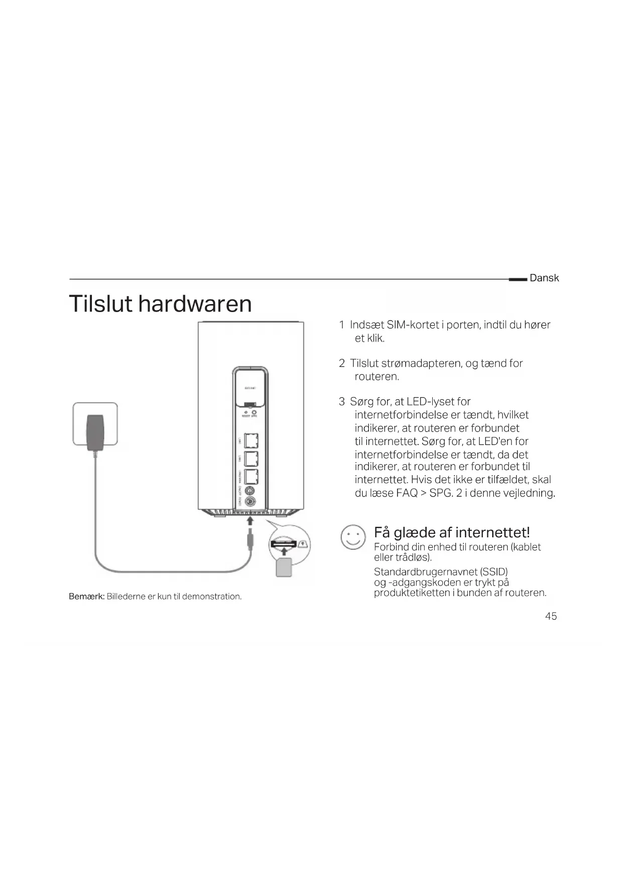 - Hvis det standard trådløse passordet har blitt endret, logg inn på ruterenes webadministrasjonsside og hent eller tilbakestill passordet ditt. Merk: For mer feilsøkingshjelp, vennligst se i FAQ på vår nettside: http://www.tp-link.com.45 Dansk Tilslut hardwaren 1 Indsæt SIM-kortet i porten, indtil du hører et klik. 2 Tilslut strømadapteren, og tænd for routeren. 3 Sørg for, at LED-lyset for internetforbindelse er tændt, hvilket indikerer, at routeren er forbundet til internettet. Sørg for, at LED'en for internetforbindelse er tændt, da det indikerer, at routeren er forbundet til internettet. Hvis det ikke er tilfældet, skal du læse FAQ > SPG. 2 i denne vejledning. Forbind din enhed til routeren (kablet eller trådløs). Standardbrugernavnet (SSID) og -adgangskoden er trykt på produktetiketten i bunden af routeren. Få glæde af internettet! Bemærk: Billederne er kun til demonstration.46 Dansk Kongurer din 5G/4G+ router 1 Sørg for, at din computer er forbundet til routeren (kablet eller trådløs). 2 Angiv http://tplinkmodem.net eller http://192.168.1.1 i adresselinjen i en webbrowser. Baseret på den faktiske loginside til webadministration: Brug standardoplysningerne "admin" som både brugernavn og adgangskode, eller opret en ny adgangskode for at logge ind. 3 Følg den trinvise vejledning på siden Hurtigopsætning for at færdiggøre den indledende konfiguration. Bemærk: Routeren kan også bruges (eller kongureres) i trådløs routertilstand til kablede forbindelser. Du kan få ere oplysninger i brugervejledningen på www.tp-link.com. Ofte stillede spørgsmål SPG1. Hvad skal jeg gøre, hvis jeg ikke kan tilgå webadministrationssiden?