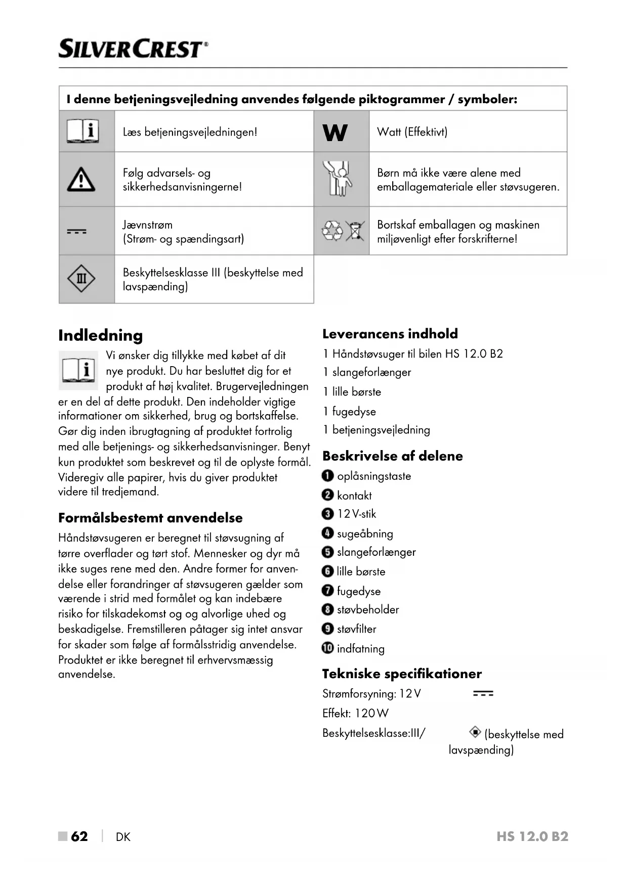 DK Indledning Vi ønsker dig tillykke med købet af dit nye produkt. Du har besluttet dig for et produkt af høj kvalitet. Brugervejledningen er en del af dette produkt. Den indeholder vigtige informationer om sikkerhed, brug og bortskaffelse. Gør dig inden ibrugtagning af produktet fortrolig med alle betjenings- og sikkerhedsanvisninger. Benyt kun produktet som beskrevet og til de oplyste formål. Videregiv alle papirer, hvis du giver produktet videre til tredjemand. Formålsbestemt anvendelse Håndstøvsugeren er beregnet til støvsugning af tørre overflader og tørt stof . Mennesker og dyr må ikke suges rene med den. Andre former for anven- delse eller forandringer af støvsugeren gælder som værende i strid med formålet og kan indebære risiko for tilskadekomst og og alvorlige uhed og beskadigelse. Fremstilleren påtager sig intet ansvar for skader som følge af formålsstridig anvendelse. Produktet er ikke beregnet til erhvervsmæssig anvendelse. Leverancens indhold 1 Håndstøvsuger til bilen HS 12 .0 B2 1 slangeforlænger 1 lille børste 1 fugedyse 1 betjeningsvejledning Beskrivelse af delene oplåsningstaste kontakt 12 V-stik sugeåbning slangeforlænger lille børste fugedyse støvbeholder støvfilter indfatning Tekniske specifikationer Strømforsyning: 12 V Effekt: 120 W Beskyttelsesklasse: III / (beskyttelse med lavspænding) I denne betjeningsvejledning anvendes følgende piktogrammer / symboler: Læs betjeningsvejledningen!