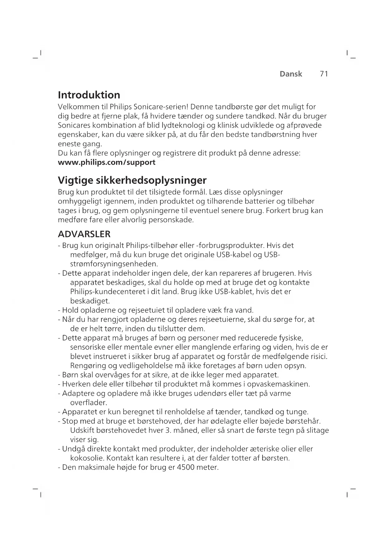 Dansk Introduktion Velkommen til Philips Sonicare-serien! Denne tandbørste gør det muligt for dig bedre at fjerne plak, få hvidere tænder og sundere tandkød. Når du bruger Sonicares kombination af blid lydteknologi og klinisk udviklede og afprøvede egenskaber, kan du være sikker på, at du får den bedste tandbørstning hver eneste gang. Du kan få flere oplysninger og registrere dit produkt på denne adresse: www.philips.com/support Vigtige sikkerhedsoplysninger Brug kun produktet til det tilsigtede formål. Læs disse oplysninger omhyggeligt igennem, inden produktet og tilhørende batterier og tilbehør tages i brug, og gem oplysningerne til eventuel senere brug. Forkert brug kan medføre fare eller alvorlig personskade. ADVARSLER - Brug kun originalt Philips-tilbehør eller -forbrugsprodukter. Hvis det medfølger, må du kun bruge det originale USB-kabel og USB- strømforsyningsenheden. - Dette apparat indeholder ingen dele, der kan repareres af brugeren. Hvis apparatet beskadiges, skal du holde op med at bruge det og kontakte Philips-kundecenteret i dit land. Brug ikke USB-kablet, hvis det er beskadiget. - Hold opladerne og rejseetuiet til opladere væk fra vand. - Når du har rengjort opladerne og deres rejseetuierne, skal du sørge for, at de er helt tørre, inden du tilslutter dem. - Dette apparat må bruges af børn og personer med reducerede fysiske, sensoriske eller mentale evner eller manglende erfaring og viden, hvis de er blevet instrueret i sikker brug af apparatet og forstår de medfølgende risici. Rengøring og vedligeholdelse må ikke foretages af børn uden opsyn. - Børn skal overvåges for at sikre, at de ikke leger med apparatet. - Hverken dele eller tilbehør til produktet må kommes i opvaskemaskinen. - Adaptere og opladere må ikke bruges udendørs eller tæt på varme overflader. - Apparatet er kun beregnet til renholdelse af tænder, tandkød og tunge. - Stop med at bruge et børstehoved, der har ødelagte eller bøjede børstehår. Udskift børstehovedet hver 3. måned, eller så snart de første tegn på slitage viser sig. - Undgå direkte kontakt med produkter, der indeholder æteriske olier eller kokosolie. Kontakt kan resultere i, at der falder totter af børsten. - Den maksimale højde for brug er 4500 meter.72 Dansk MEDICINSKE ADVARSLER - Stop med at bruge apparatet, og kontakt din tandlæge/læge, hvis der opstår kraftig blødning efter brug, hvis blødningen fortsætter efter 1 uges brug, eller hvis du oplever ubehag eller smerter. - Hvis du er blevet opereret i mund eller tandkød inden for de seneste 2 måneder, skal du spørge din tandlæge til råds, før du bruger apparatet. - Hvis du har en pacemaker eller andre implantater, skal du kontakte din læge eller producenten af implantatet inden brug. - Hvis du har helbredsproblemer, skal du spørge din læge til råds, før du begynder at bruge dette apparat. - Dette produkt er beregnet til personlig hjemmebrug og ikke til brug af et større antal patienter på tandlægeklinikker eller institutioner.