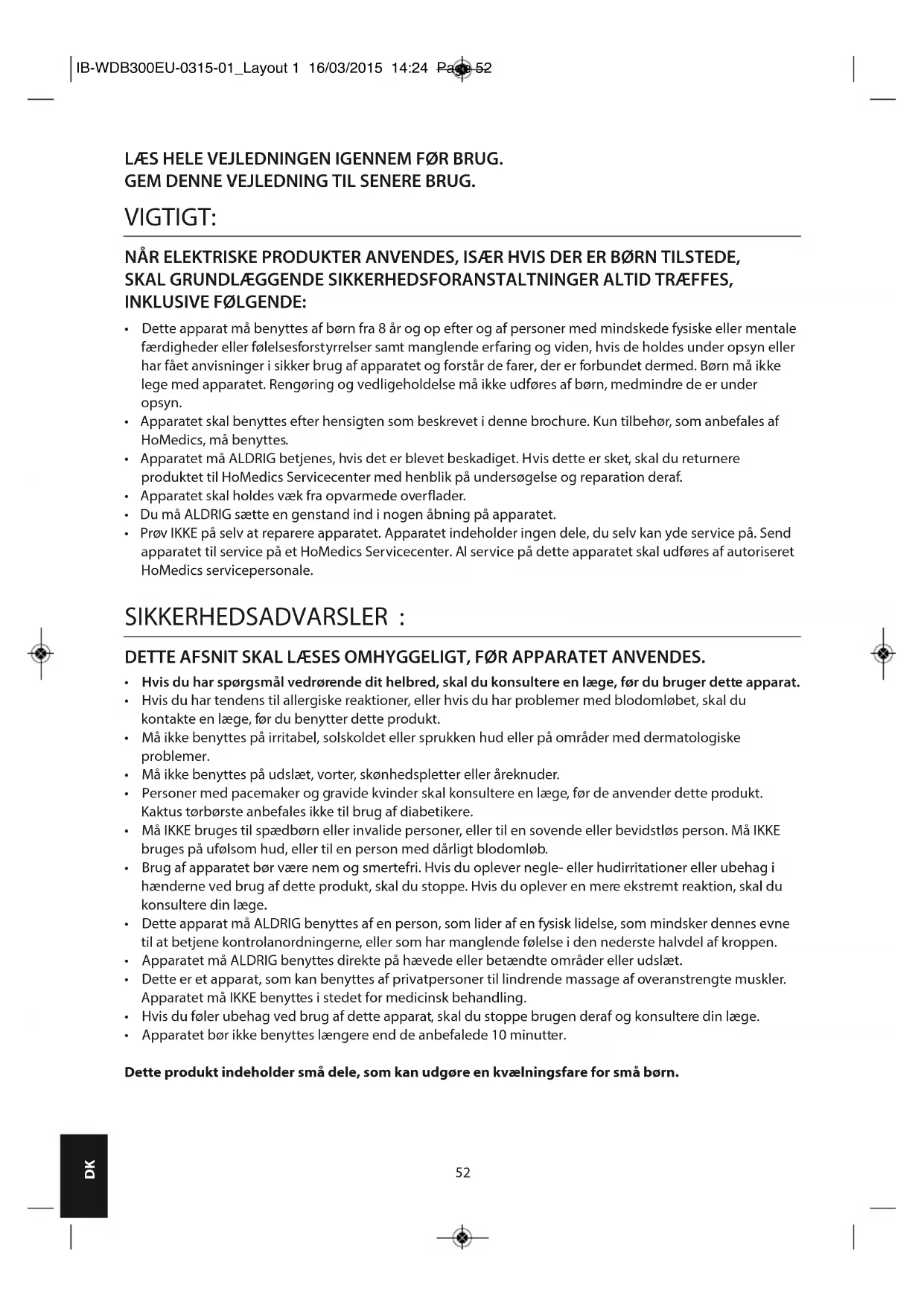 - Apparatet bør ikke benyttes længere end de anbefalede 10 minutter. Dette produkt indeholder små dele, som kan udgøre en kvælningsfare for små børn. IB-WDB300EU-0315-01_Layout 1 16/03/2015 14:24 Page 5253