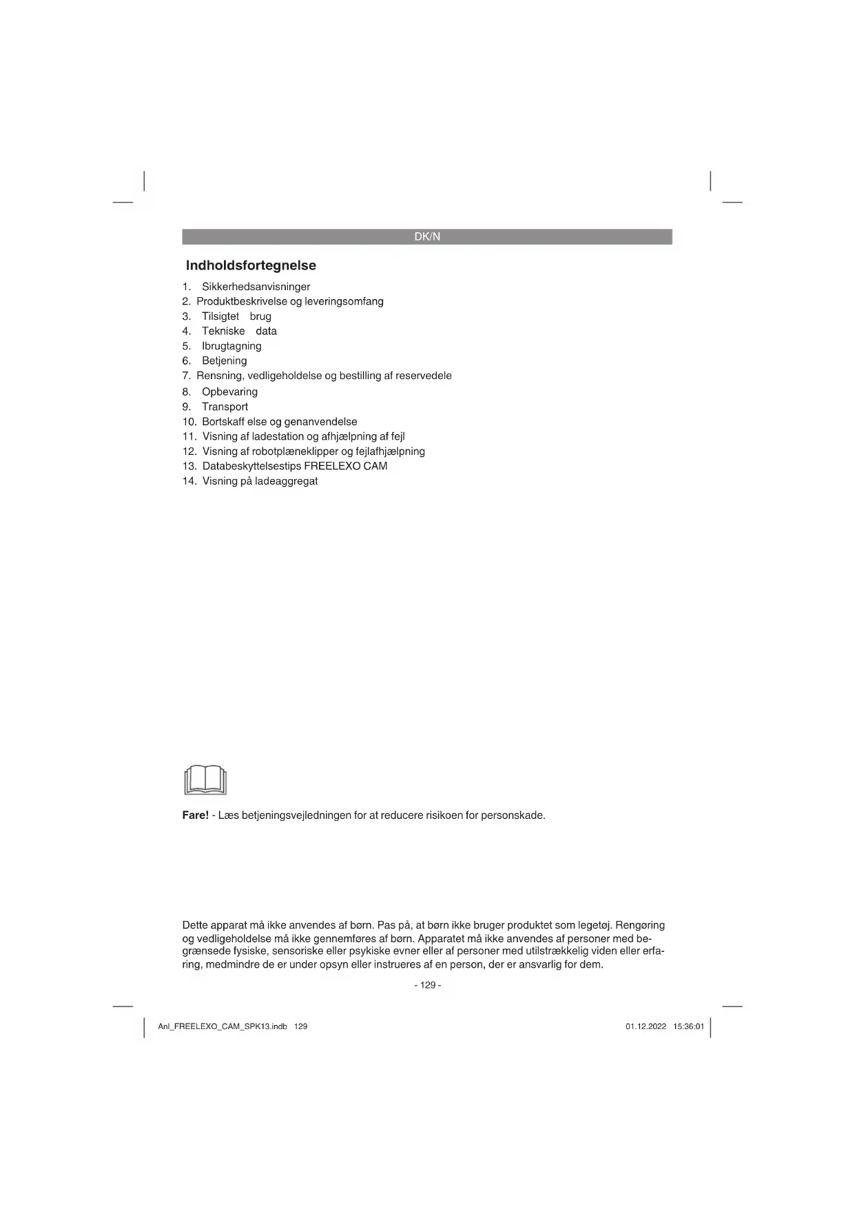 Fare! - Læs betjeningsvejledningen for at reducere risikoen for personskade. Dette apparat må ikke anvendes af børn. Pas på, at børn ikke bruger produktet som legetøj. Rengøring og vedligeholdelse må ikke gennemføres af børn. Apparatet må ikke anvendes af personer med be- grænsede fysiske, sensoriske eller psykiske evner eller af personer med utilstrækkelig viden eller erfa- ring, medmindre de er under opsyn eller instrueres af en person, der er ansvarlig for dem. Anl_FREELEXO_CAM_SPK13.indb 129Anl_FREELEXO_CAM_SPK13.indb 129 01.12.2022 15:36:0101.12.2022 15:36:01DK/N