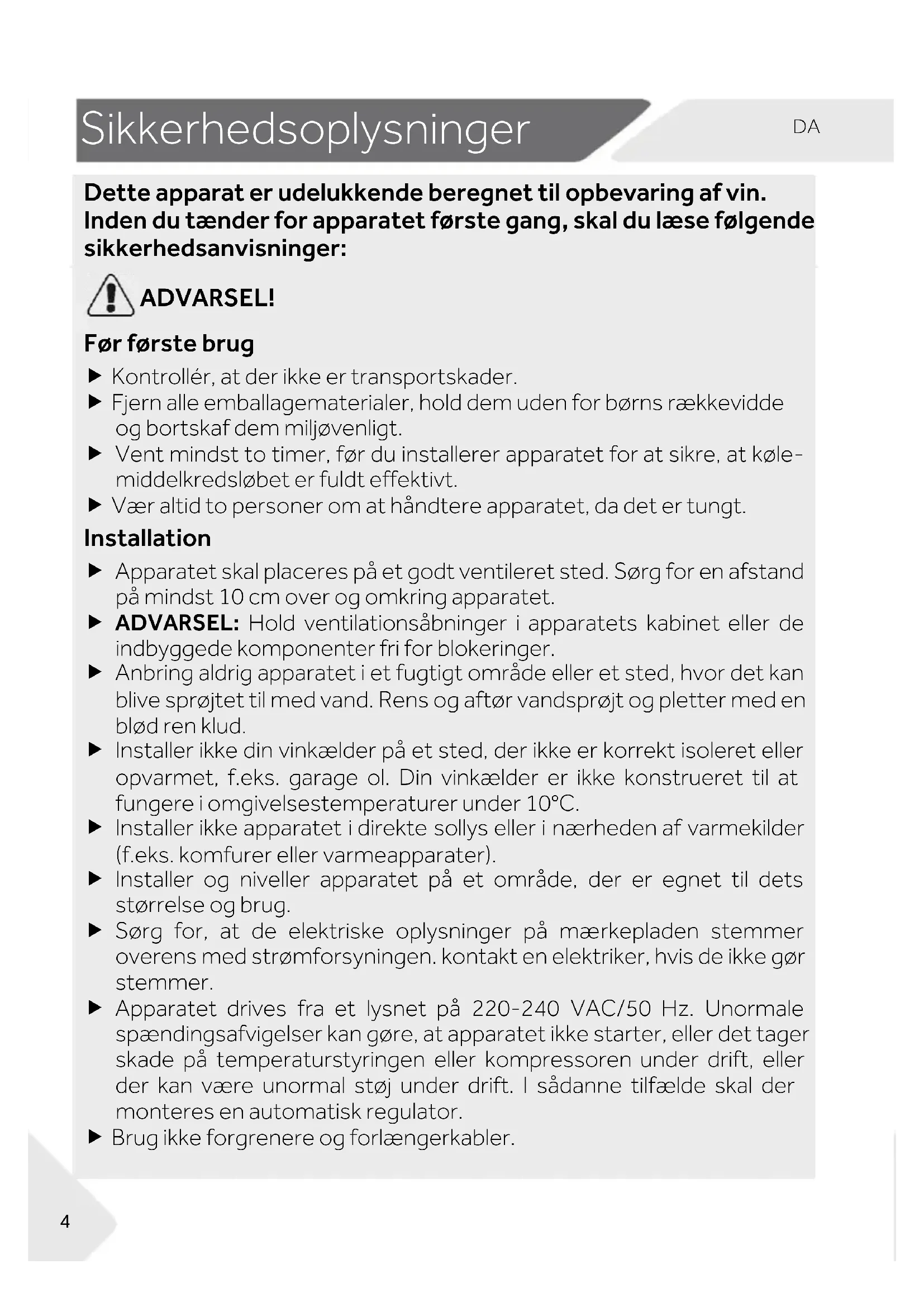Sikkerhedsoplysninger Dette apparat er udelukkende beregnet til opbevaring af vin. Inden du tænder for apparatet første gang, skal du læse følgende sikkerhedsanvisninger: