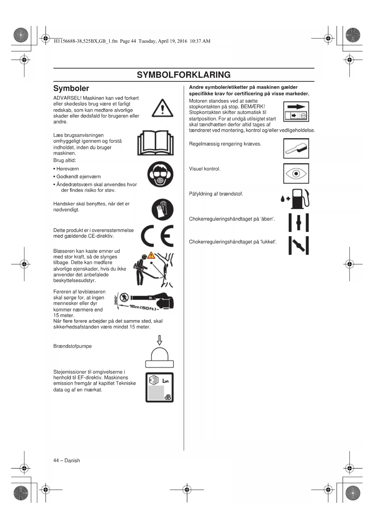- Åndedrætsværn skal anvendes hvor der ndes risiko for støv. Handsker skal benyttes, når det er nødvendigt. Dette produkt er i overensstemmelse med gældende CE-direktiv. Blæseren kan kaste emner ud med stor kraft, så de slynges tilbage. Dette kan medføre alvorlige øjenskader, hvis du ikke anvender det anbefalede beskyttelsesudstyr. Føreren af løvblæseren skal sørge for, at ingen mennesker eller dyr kommer nærmere end 15 meter. Når ere førere arbejder på det samme sted, skal sikkerhedsafstanden være mindst 15 meter. Brændstofpumpe Støjemissioner til omgivelserne i henhold til EF-direktiv. Maskinens emission fremgår af kapitlet Tekniske data og af en mærkat. Andre symboler/etiketter på maskinen gælder specikke krav for certicering på visse markeder. Motoren standses ved at sætte stopkontakten på stop. BEMÆRK! Stopkontakten skifter automatisk til startposition. For at undgå utilsigtet start skal tændhætten derfor altid tages af tændrøret ved montering, kontrol og/eller vedligeholdelse. Regelmæssig rengøring kræves. Visuel kontrol. Påfyldning af brændstof. Chokerreguleringshåndtaget på 'åben'. Chokerreguleringshåndtaget på 'lukket'. H1156688-38,525BX,GB_1.fm Page 44 Tuesday, April 19, 2016 10:37 AMINDHOLD Danish – 45 Indhold Inden start skal du være opmærksom på følgende: Læs brugsanvisningen omhyggeligt igennem. Husqvarna AB forsøger hele tiden at videreudvikle sine produkter og forbeholder sig derfor ret til ændringer af bl.a. form og udseende uden forudgående varsel. Maskinen er kun beregnet til fejning af græsplæner, stier, asfalterede veje og lignende. SYMBOLFORKLARING Symboler .............................................................. 44 INDHOLD Indhold .................................................................. 45 Inden start skal du være opmærksom på følgende: