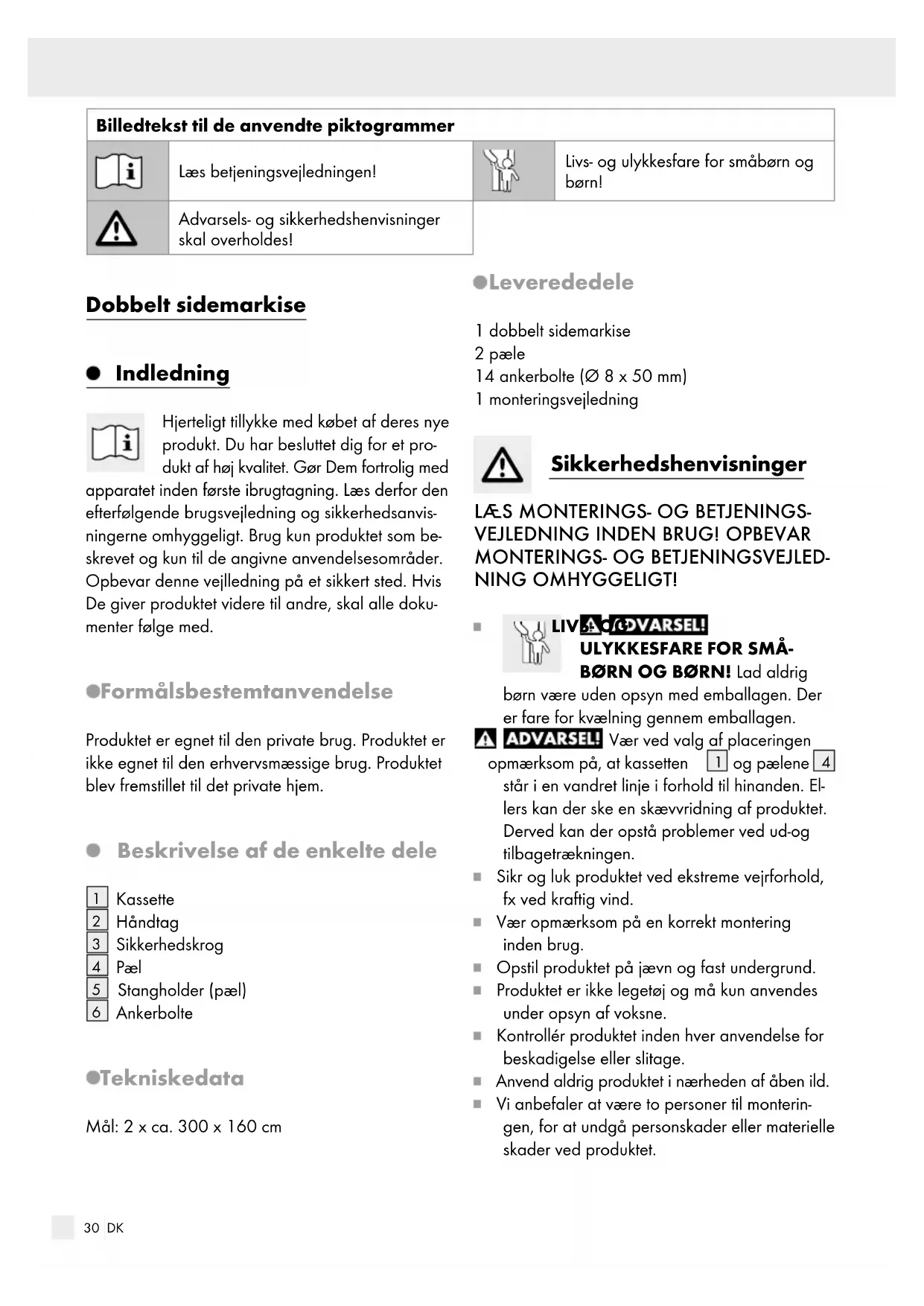 Ankerbolte Tekniske data Mål: 2 x ca. 300 x 160 cm Leverede dele 1 dobbelt sidemarkise 2 pæle 14 ankerbolte (Ø 8 x 50 mm) 1 monteringsvejledning Sikkerhedshenvisninger