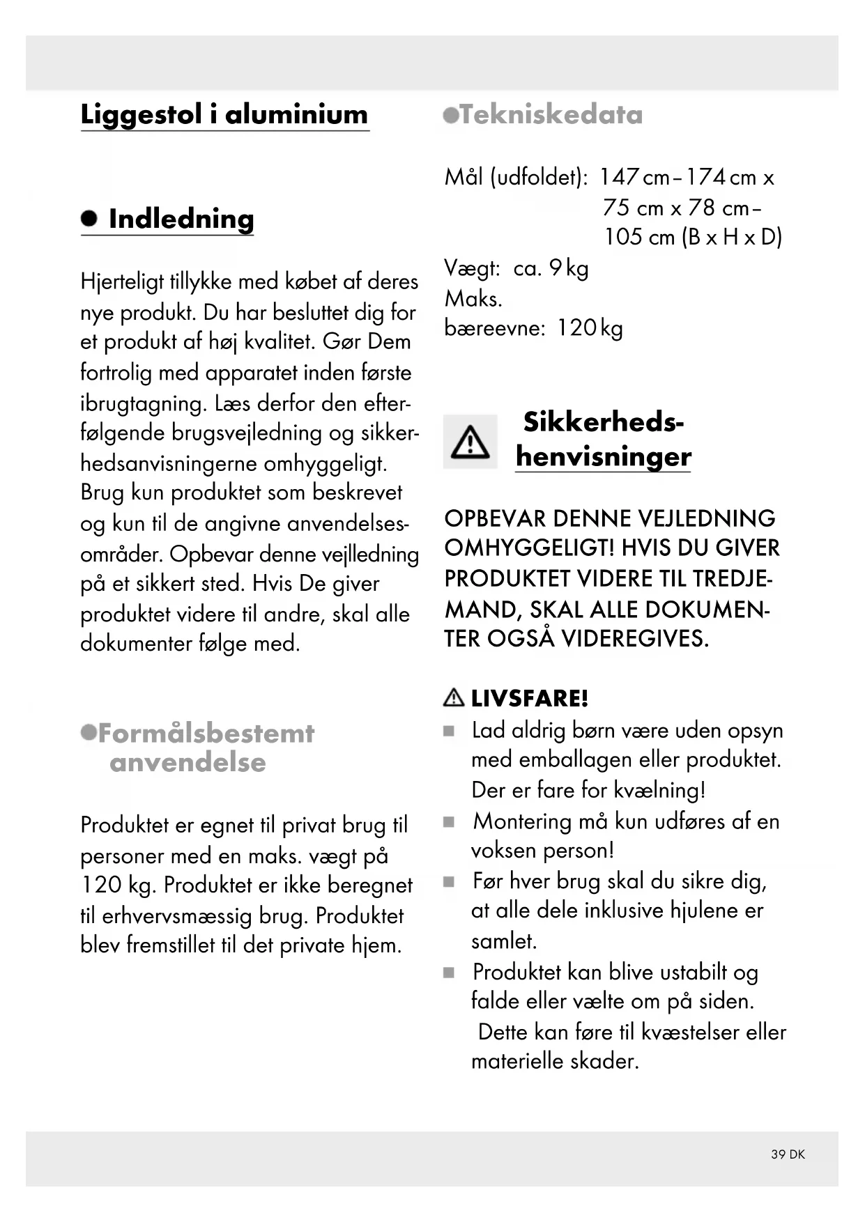 TER OGSÅ VIDEREGIVES. LIVSFARE! Lad aldrig børn være uden opsyn med emballagen eller produktet. Der er fare for kvælning! Montering må kun udføres af en voksen person! Før hver brug skal du sikre dig, at alle dele inklusive hjulene er samlet. Produktet kan blive ustabilt og falde eller vælte om på siden. Dette kan føre til kvæstelser eller materielle skader.40 DK Anvend aldrig produktet i nær- heden af åben ild. Vær opmærksom når du pakker eller folder produktet ud. Vær inden brug opmærksom på produktets rette stabilitet. Vær opmærksom på at artiklen stilles på en jævn og stabil over- flade. Vær opmærksom på den maksi- male bæreevne på 120 kg. Hvis denne vægtgrænse overskrides, kan dette føre til personskader og / eller materielle skader. Hold dine hænder på afstand af klapmekanismen for at undgå kvæstelser. Sørg inden anvendelsen af pro- duktet for at klapmekanismen er rigtig spærret. Sørg for at produktet er blevet fuldstændig åbnet, inden du an- vender det. Produktet må kun anvendes un- der opsyn af en voksen person og ikke anvendes som legetøj. Produktet må altid kun anvendes af én person. Kontrollér produktet inden hver anvendelse for beskadigelse el- ler slitage. Anvend kun produktet i fejlfri tilstand. Anvend ikke pro- duktet, hvis skader er synlige el- ler formodes at være der. Sikr produktet ved ekstreme vejr- forhold, fx ved kraftig vind. Op- bevar produktet i beskyttede rum. Stil dig ikke på produktet.
