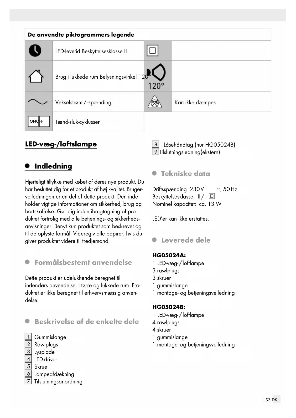 , 50 Hz Beskyttelsesklasse: II / Nominel kapacitet: ca. 13 W LED’er kan ikke erstattes. Leverede dele HG05024A: 1 LED-væg- / loftlampe 3 rawlplugs 3 skruer 1 gummislange 1 montage- og betjeningsvejledning HG05024B: 1 LED-væg- / loftlampe 4 rawlplugs 4 skruer 1 gummislange 1 montage- og betjeningsvejledning54 DK Sikkerhed Sikkerhedshenvisninger