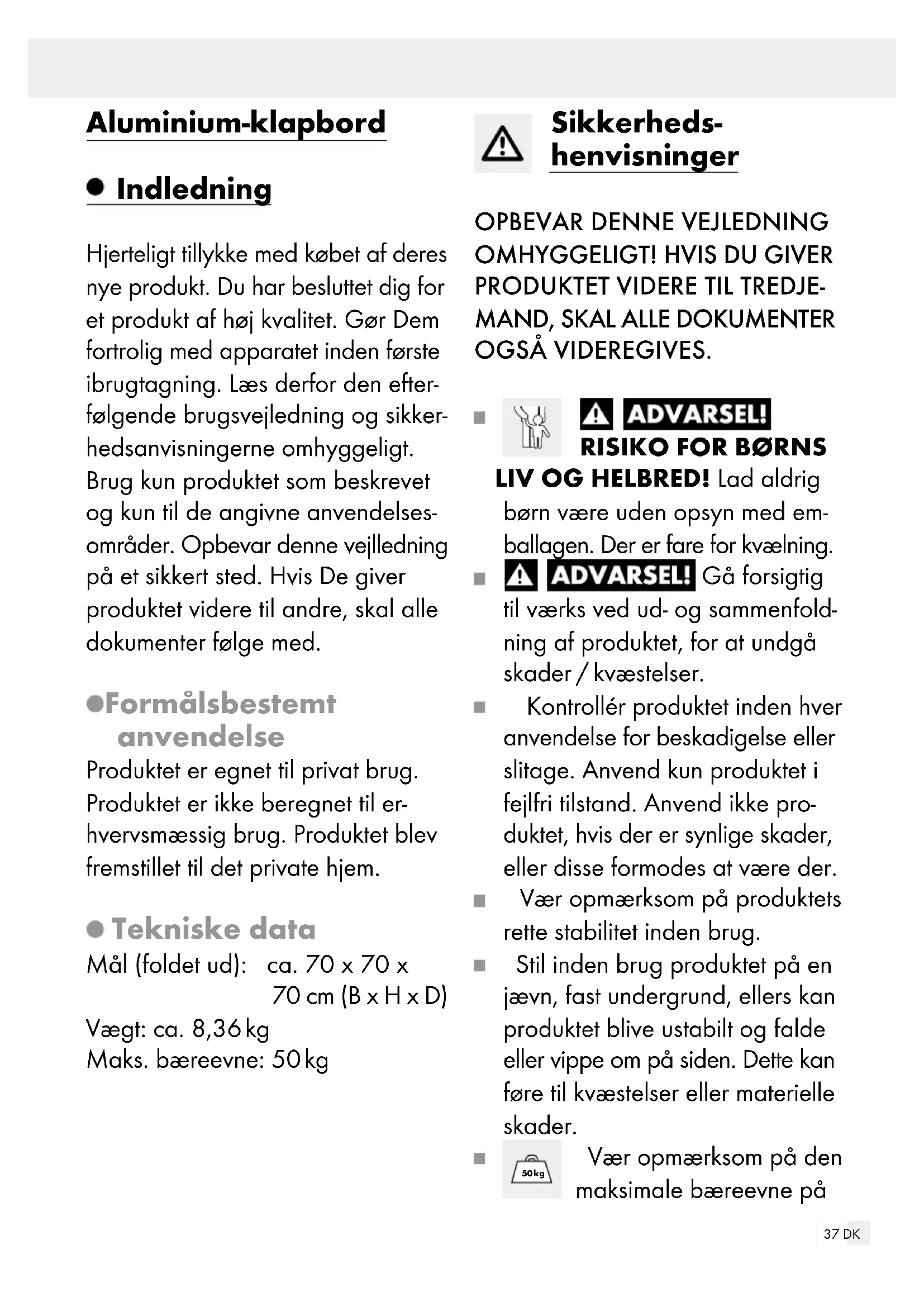 LIV OG HELBRED! Lad aldrig børn være uden opsyn med em- ballagen. Der er fare for kvælning. Gå forsigtig til værks ved ud- og sammenfold- ning af produktet, for at undgå skader / kvæstelser. Kontrollér produktet inden hver anvendelse for beskadigelse eller slitage. Anvend kun produktet i fejlfri tilstand. Anvend ikke pro- duktet, hvis der er synlige skader, eller disse formodes at være der. Vær opmærksom på produktets rette stabilitet inden brug. Stil inden brug produktet på en jævn, fast undergrund, ellers kan produktet blive ustabilt og falde eller vippe om på siden. Dette kan føre til kvæstelser eller materielle skader. 50 kg Vær opmærksom på den maksimale bæreevne på38 DK 50 kg. Hvis denne vægtgrænse overskrides, kan dette føre til personskader og / eller materi- elle skader. Sørg for, at personer, især børn, ikke stiller sig på produktet eller trækker sig op ved hjælp af det. Produktet kan vælte omkuld. Sæt eller stil dig aldrig på pro- duktet. Pas for at undgå skader på at dine hænder ikke kommer ind i sammenklapningsanordningen. Vær ved udfoldningen opmærk- som på, at foldemekanismen går i hak, inden du anvender produktet. Sørg for at produktet er blevet fuldstændig åbnet, inden du anvender det. Produktet er ikke noget legetøj og bør kun anvendes under opsyn af voksne. Produktet er ikke noget klatrestativ eller legetøj. Sikre produktet ved ekstreme vejrforhold, fx ved kraftig blæst. Anvend aldrig produktet i nær- heden af åben ild.