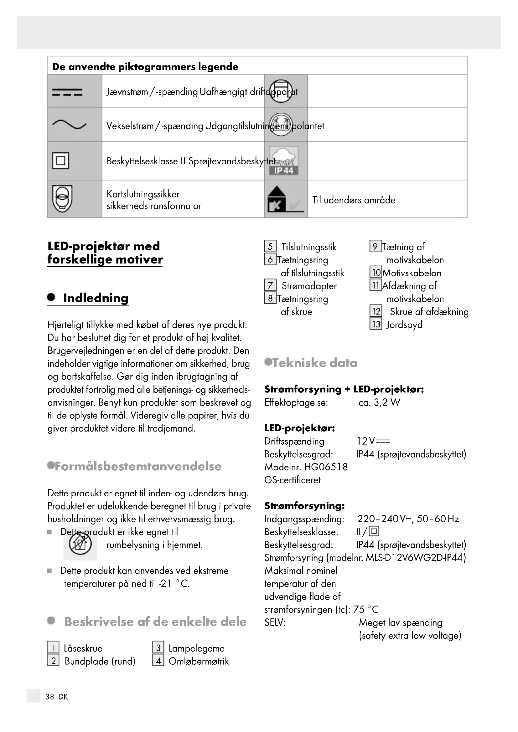 Maksimal nominel temperatur af den udvendige flade af strømforsyningen (tc): 75 °C SELV: Meget lav spænding (safety extra low voltage)39 DK Leverede dele 1 LED-projektør med forskellige motiver 1 strømforsyning 1 jordspyd med skrue 1 bundplade (rund) 6 motivskabeloner 1 betjeningsvejledning Sikkerhedsanvisninger