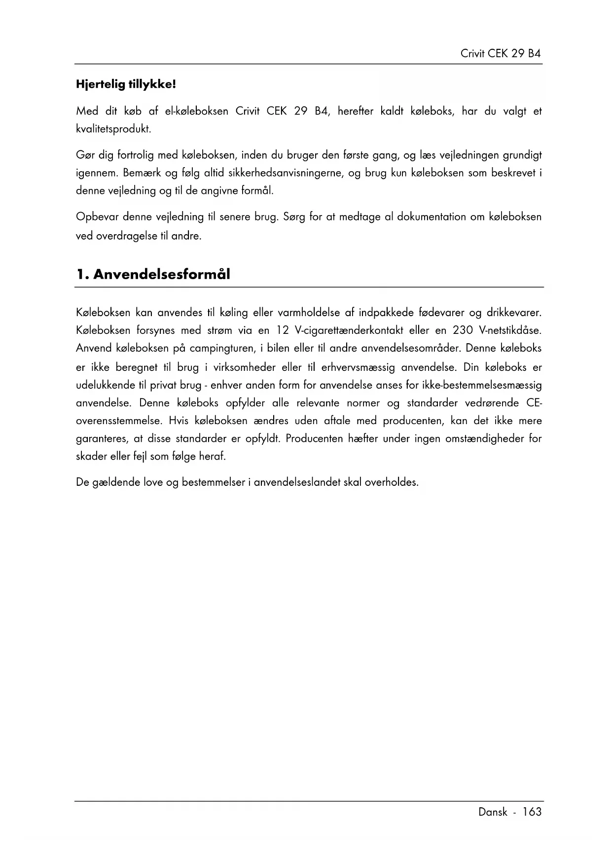 Dansk - 163 Hjertelig tillykke! Med dit køb af el-køleboksen Crivit CEK 29 B4, herefter kaldt køleboks, har du valgt et kvalitetsprodukt. Gør dig fortrolig med køleboksen, inden du bruger den første gang, og læs vejledningen grundigt igennem. Bemærk og følg altid sikkerhedsanvisningerne, og brug kun køleboksen som beskrevet i denne vejledning og til de angivne formål. Opbevar denne vejledning til senere brug. Sørg for at medtage al dokumentation om køleboksen ved overdragelse til andre.