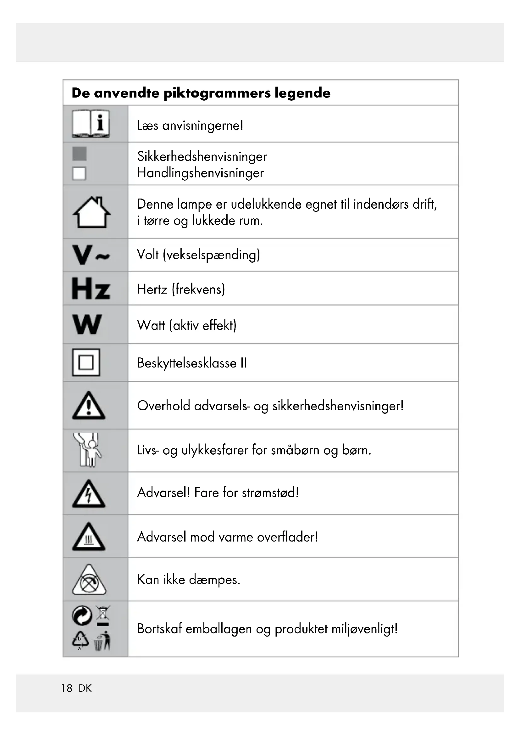VARME OVERFLADER! Lad lampen køle fuldstændigt af. Brug ingen opløsningsmidler, benzin e.l. Lampen ville tage skade herved. Anvend kun en tør, fnugfri klud til rengøring. Bortskaffelse Indpakningen består af miljøvenlige materialer, som De kan bortskaffe over de lokale genbrugssteder. Det grønne miljø- mærke gælder ikke for Tyskland.