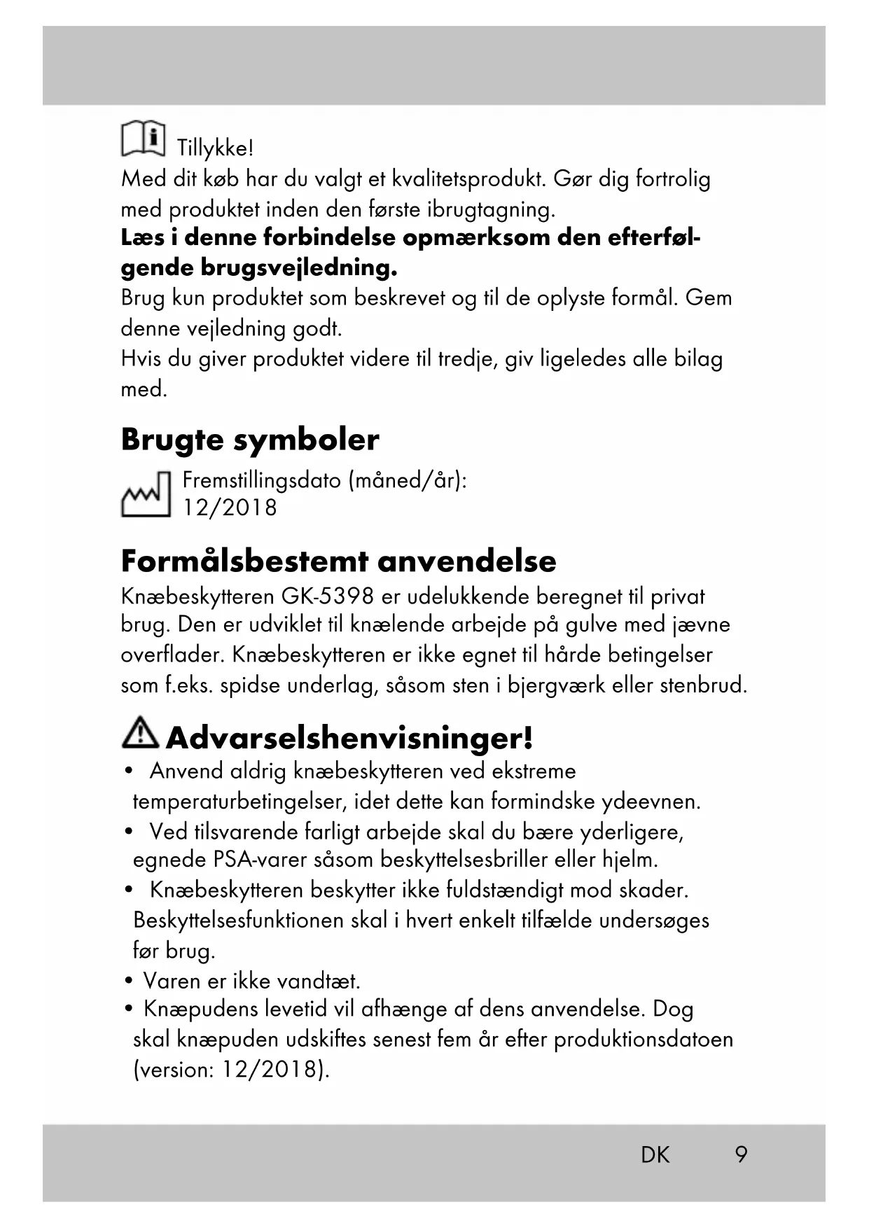 OG 3 YDELSESTRIN FOR KNÆBESKYTTERE! Typer Type 1: Knæbeskytter, der er uafhængig af andet tøj og fastgøres på benet. Type 2: Knæbeskytter, der f.eks. er fastgjort i buksebenenes lommer. Type 3: Udstyr, der ikke er fastgjort på kroppen. Type 4: Knæbeskytter, der er en del af indretninger med flere funktioner som f.eks. en ramme som hjælpemiddel til at rejse sig. Ydelsestrin Der findes tre ydelsestrin: Trin 0 er knæbeskyttelse, der er egnet til en jævn overflade og ikke beskytter mod gennemstikning. Trin 1 er knæbeskyttelse, der er egnet til en jævn eller ujævn overflade og beskytter mod gennemstikning med en kraft på (100±5) N. Trin 2 er knæbeskyttelse, der er egnet til anvendelse på jævn eller ujævn overflade under svære betingelser og beskytter mod gennemstikning med en kraft på (250±10) N. DK11DK Anbring knæbeskytteren Knæbeskytteren fastgøres til knæet ved hjælp af burrebånd, således at det knælende område er afdækket. Den øverste kant på knæbeskytteren skal derved rage ca. 2 cm ud over det bøjede knæ. Knæbeskytteren kan påføres over det sædvanlige arbejdstøj eller bæres direkte på huden. OBS! Vær venligst opmærksom på, at burrebåndene ikke anbringes for stramt. Lad ikke burrebåndene sidde over knæhaserne. Forkert anbringelse kan forstyrre blodtilførslen. Den er egnet til personer med et taljeomfang på op til 100 cm! Kontroller til slut, om knæbeskytterne sidder behageligt og godt fast til den forestående opgave. Vedligeholdelse og pleje Generelt Kontroller dine knæbeskyttere grundigt før enhver anvendelse og undersøg, om de udviser beskadigelser. Hvis knæbeskytterne er beskadigede, for eksempel ved revner, brud eller løse dele, er de ikke længere anvendelige og må ikke benyttes videre. Foretag venligst ingen ændringer på varen, idet beskyttelsesfunktioner ellers ikke kan garanteres længere. Forurening, ændringer eller forkert anvendelse kan formindske knæbeskytterens ydelse på farlig vis. Knæ- beskytteren består hovedsageligt at PVC, polyester, SBR og PE-skum. Rengøring Større forureninger kan fjernes fra knæbeskytterne ved at børste dem af. Hvis forureningen er hårdnakket, kan man vaske knæbeskytterne ved håndvask i lunkent vand eller med et neutralt vaskemiddel. Skyl derefter med rent vand. Undgå at vaske knæbeskytterne med stærke rengøringsmidler der indeholder opløsningsmidler. Rengør dem aldrig i vaskemaskinen, tørretum- bleren eller med et strygejern.12 Opbevaring og transport Varen må ikke udsættes direkte solstråler eller forhøjet varmetil- førsel under opbevaring og transport. Opbevar ingen svære ting oven på protektoren. Ved tilsidesættelse opstår der fare for dan- nelse af revner eller nedbrydning, der forkorter levetiden og kan begrænse funktionen. Udelukkende knæskånere i en upåklagelig tilstand kan yde en hensigtsmæssig beskyttelse. Henvisninger vedr. bortskaffelse Bortskaf artikel og emballage i overensstemmelse med lokalt gældende forskrifter. Emballagematerialer som f.eks. plastposer hører ikke hjemme i børnehænder. Opbevar emballagen utilgæn- geligt for børn. Oplysninger om garanti og ser- vicehåndtering Produktet er fremstillet med største omhu og under vedvarende kontrol. Der ydes en garanti på tre år fra købsdatoen på dette produkt. Opbevar venligst kvitteringen fra købet. Garantien gælder kun for materiale- og fabrikationsfejl og bortfalder ved misbrug eller uhensigtsmæssig anvendelse. Deres lovpligtige rettigheder, særligt garantikrav, begrænses ikke af denne garanti. Ved eventuelle klager bedes du henvende dig til nedenstående service-hotline eller tage kontakt til os via e-mail. Medarbejderne i vores kundetjeneste vil så aftale den videre fremgangsmåde med dig. Vi vil under alle omstændigheder rådgive dig personlig. DK13DK Garantiperioden forlænges ikke ved eventuelle reparationer inden for garantien eller ved kulance. Dette gælder også for udskiftede og reparerede dele. Efter udløb af garantien er fore- faldende reparationer forbundet med omkostninger. IAN: 306939 Service Danmark Tel.: 32 710005 E-Mail: deltasport@lidl.dk14 Félicitations ! Vous avez acquis un produit de haute qualité. Apprenez à connaître le produit avant sa première utilisation. Lisez pour cela attentivement la notice d’utilisation suivante. N’utilisez le produit que comme décrit et pour les zones d’application indiquées. Veuillez conserver cette notice d’utilisation. Transmettez tous les documents en cas de cession du produit à une tierce personne. Symboles utilisés Date de fabrication (Mois/Année) : 12/2018 Conformités d’usage La genouillère GK-5398 convient uniquement pour une utilisation personnelle. Elle a été conçue pour des travaux en position age- nouillée sur des surfaces planes. La genouillère n‘est pas adap- tée pour des conditions particulières, par ex. les sols caillouteux comme la pierre dans les mines ou les carrières. Attention !