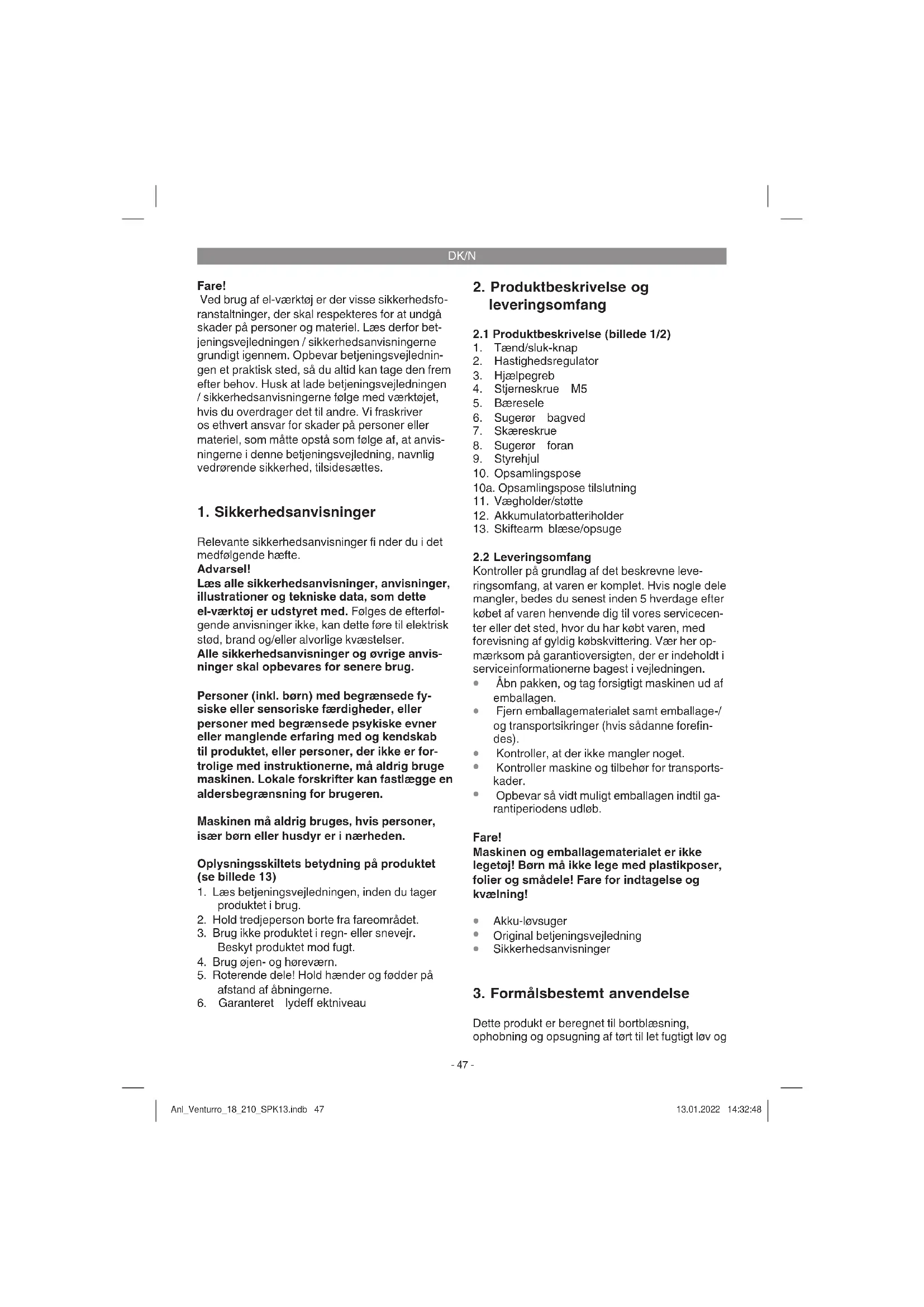 Dette produkt er beregnet til bortblæsning, ophobning og opsugning af tørt til let fugtigt løv og Anl_Venturro_18_210_SPK13.indb 47Anl_Venturro_18_210_SPK13.indb 47 13.01.2022 14:32:4813.01.2022 14:32:48DK/N