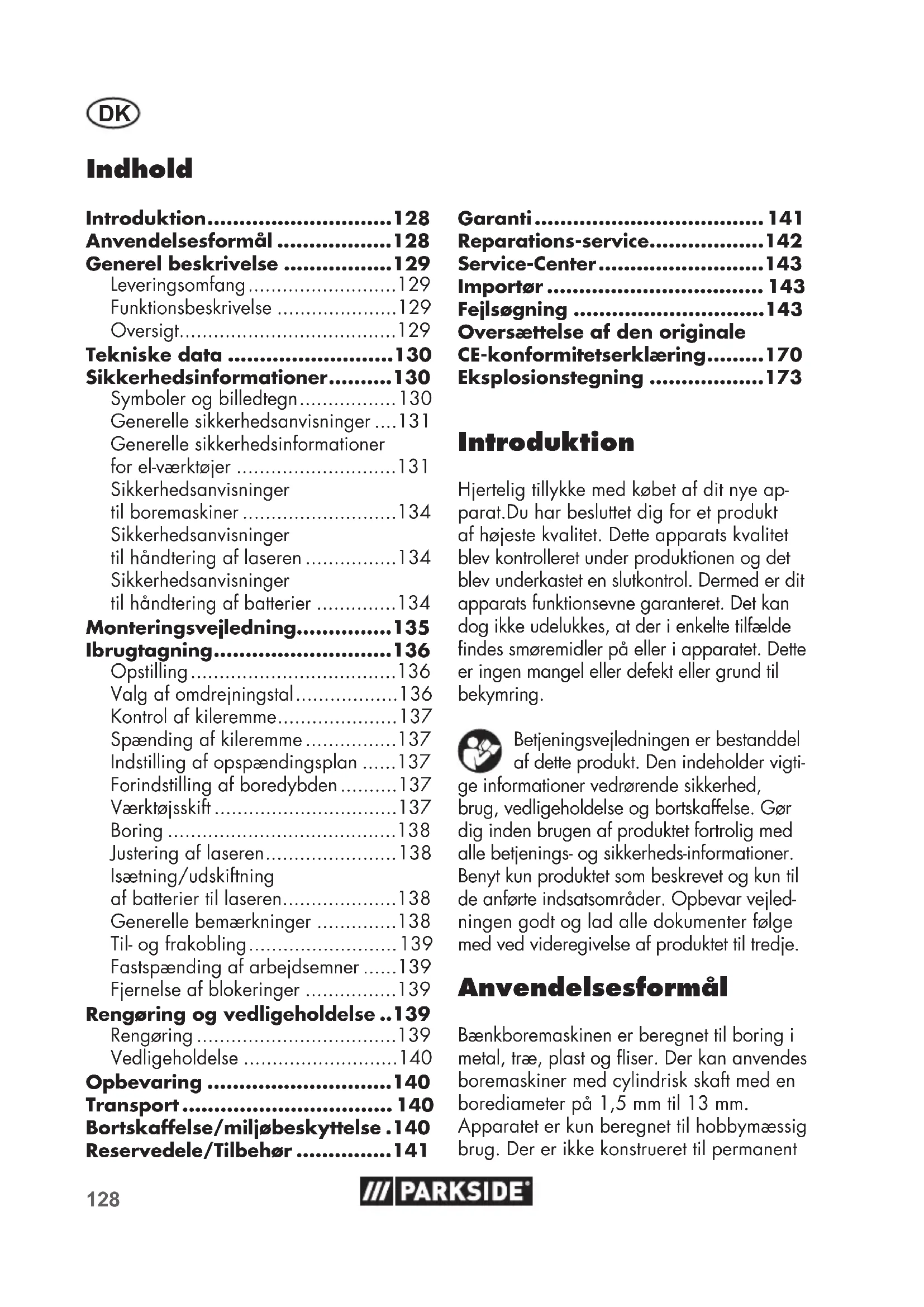 - Introduktion Hjertelig tillykke med købet af dit nye ap- parat.Du har besluttet dig for et produkt af højeste kvalitet. Dette apparats kvalitet blev kontrolleret under produktionen og det blev underkastet en slutkontrol. Dermed er dit apparats funktionsevne garanteret. Det kan dog ikke udelukkes, at der i enkelte tilfælde ndes smøremidler på eller i apparatet. Dette er ingen mangel eller defekt eller grund til bekymring. Betjeningsvejledningen er bestanddel af dette produkt. Den indeholder vigti- ge informationer vedrørende sikkerhed, brug, vedligeholdelse og bortskaffelse. Gør dig inden brugen af produktet fortrolig med alle betjenings- og sikkerheds-informationer. Benyt kun produktet som beskrevet og kun til de anførte indsatsområder. Opbevar vejled- ningen godt og lad alle dokumenter følge med ved videregivelse af produktet til tredje. Anvendelsesformål Bænkboremaskinen er beregnet til boring i metal, træ, plast og iser. Der kan anvendes boremaskiner med cylindrisk skaft med en borediameter på 1,5 mm til 13 mm. Apparatet er kun beregnet til hobbymæssig brug. Der er ikke konstrueret til permanent Garanti p. 141