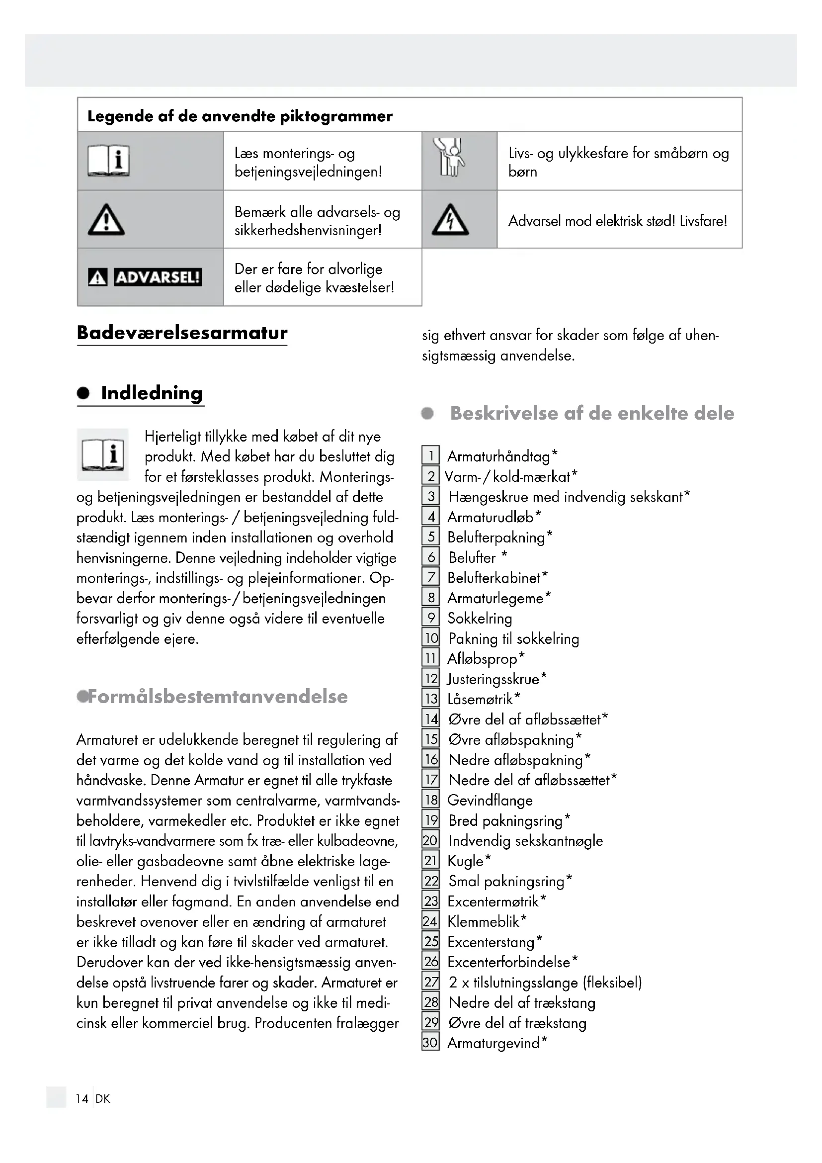 SMÅ OG STORE BØRN! Børn må ikke lege med armaturet og rengø- ring/brugervedligeholdelse må ikke gennemføres af børn uden opsyn. Lad ikke børn lege med emballagefolien eller dele af emballagen, ellers kan de blive viklet ind i det under legen eller sluge dele og blive kvalt. PAS PÅ ELEKTRISK STØD! Utæt- heder eller vandudslip kan medføre livsfare gennem elektrisk stød. Kontrollér alle forbindelser grundigt i forhold til tæthed og kontrollér ligeledes, at alle ledninger af elektriske apparater i nærheden af håndva- sken er installeret korrekt og sikkert. Spørg i tvivlstilfælde en fagperson. ADVARSEL! RISIKO FOR SKOLDNING! Kontrollér at varm-/kold-mærkatet er indsat i den korrekte position, for at undgår utilsigtede skoldninger. Stil armaturhåndtaget ved åbning på et koldt trin og tilpas derefter vandtemperaturen. ADVARSEL! MATERIELLE SKADER! Ved uhensigtsmæssig montering og håndtering af armaturet kan der opstå materielle skader. Lad monteringen blive udført af en faguddannet person. Sluk inden monteringen for vandtilførselen til dine beboelsesrum. Vær ved monteringen opmærksom på, at alle pakninger sidder korrekt på tætningsfladerne. Anvend ikke armaturet ved lavtryks- og små elektrolagre. Anvend kun armaturet ved en omgivelsestem- peratur på over 0 °C. Luk ved risiko for frost vandtilførslen og tøm armaturet. Anvend ikke armaturet, hvis den er beskadiget eller den er indskrænket i dens funktion. Utætheder og vandudslip kan resultere i alvor- lige materielle skader på bygninger og indbo. Kontrollér derfor alle samlinger omhyggeligt for tæthed. Sæt dig inden installationen ind i alle forholdene på stedet , fx de tilstedeværende vandtilslutnin- ger og lukkeanordninger. Udfør ikke selv reparationer, men bestil en fagperson. Lad defekte dele kun erstattes med originale reservedele. Montering ADVARSEL! Sluk for tilførsel af varmt og koldt vand, inden monteringen. ADVARSEL! Vrid ikke tilslutningsslangerne og sæt dem ikke i spænd. ADVARSEL! Spænd tilslutningsslangerne kun håndfast. Brug ingen tang eller skruenøgle, du kan beskadige tilslutningsslangerne dermed.16 DK Bemærk: til monteringen skal du bruge en kærvskruetrækker og en fastnøgle SW 10 mm. Montering af armatur Løsn fastgørelsesmøtrikken