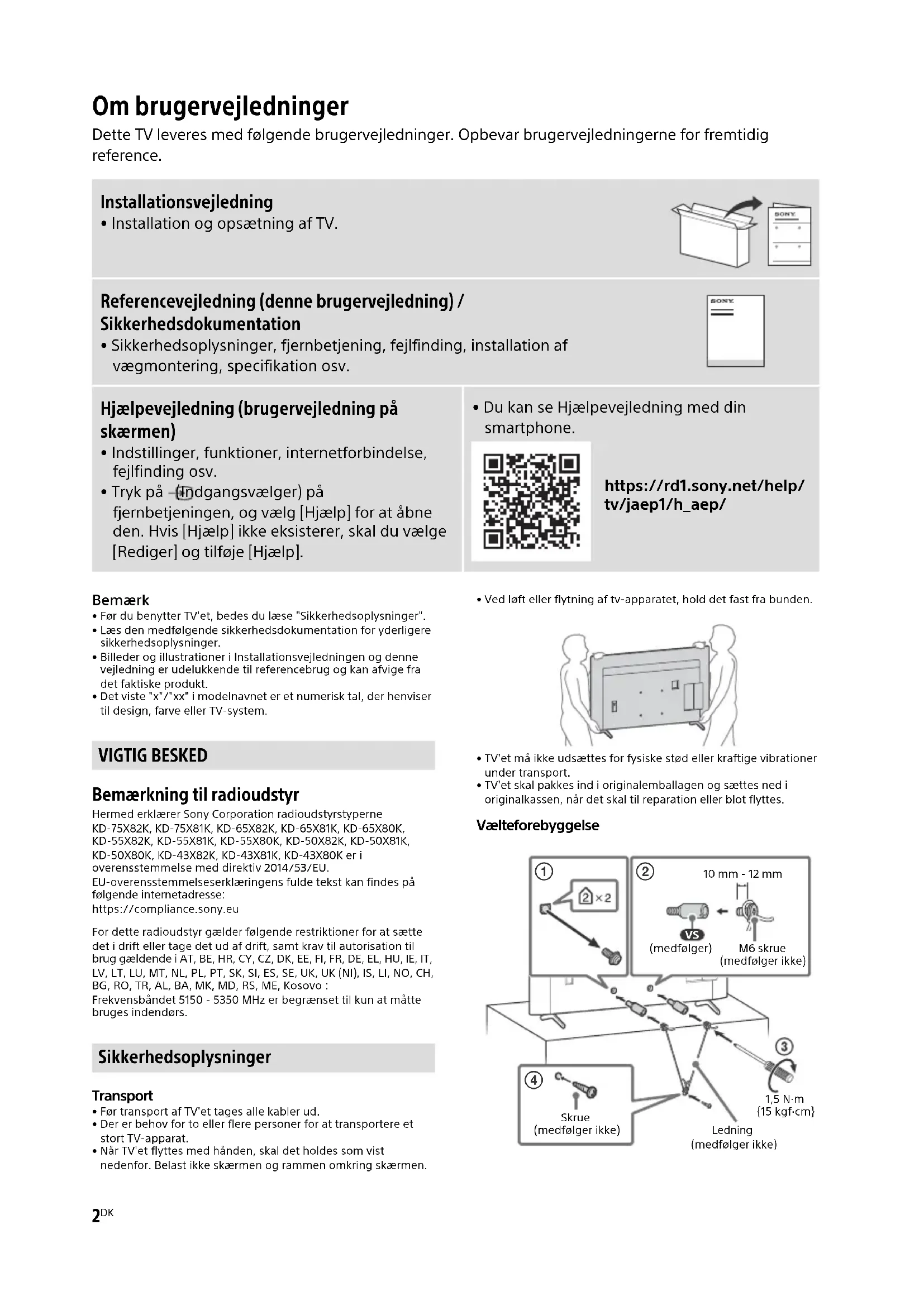 - Før du benytter TV'et, bedes du læse "Sikkerhedsoplysninger".• Læs den medfølgende sikkerhedsdokumentation for yderligere sikkerhedsoplysninger. • Billeder og illustrationer i Installationsvejledningen og denne vejledning er udelukkende til referencebrug og kan afvige fra det faktiske produkt.• Det viste "x"/"xx" i modelnavnet er et numerisk tal, der henviser til design, farve eller TV-system. Bemærkning til radioudstyr Hermed erklærer Sony Corporation radioudstyrstyperne KD-75X82K, KD-75X81K, KD-65X82K, KD-65X81K, KD-65X80K, KD-55X82K, KD-55X81K, KD-55X80K, KD-50X82K, KD-50X81K, KD-50X80K, KD-43X82K, KD-43X81K, KD-43X80K er i overensstemmelse med direktiv 2014/53/EU. EU-overensstemmelseserklæringens fulde tekst kan findes på følgende internetadresse: https://compliance.sony.euFor dette radioudstyr gælder følgende restriktioner for at sætte det i drift eller tage det ud af drift, samt krav til autorisation til brug gældende i AT, BE, HR, CY, CZ, DK, EE, FI, FR, DE, EL, HU, IE, IT, LV, LT, LU, MT, NL, PL, PT, SK, SI, ES, SE, UK, UK (NI), IS, LI, NO, CH, BG, RO, TR, AL, BA, MK, MD, RS, ME, Kosovo :Frekvensbåndet 5150 - 5350 MHz er begrænset til kun at måtte bruges indendørs. Transport