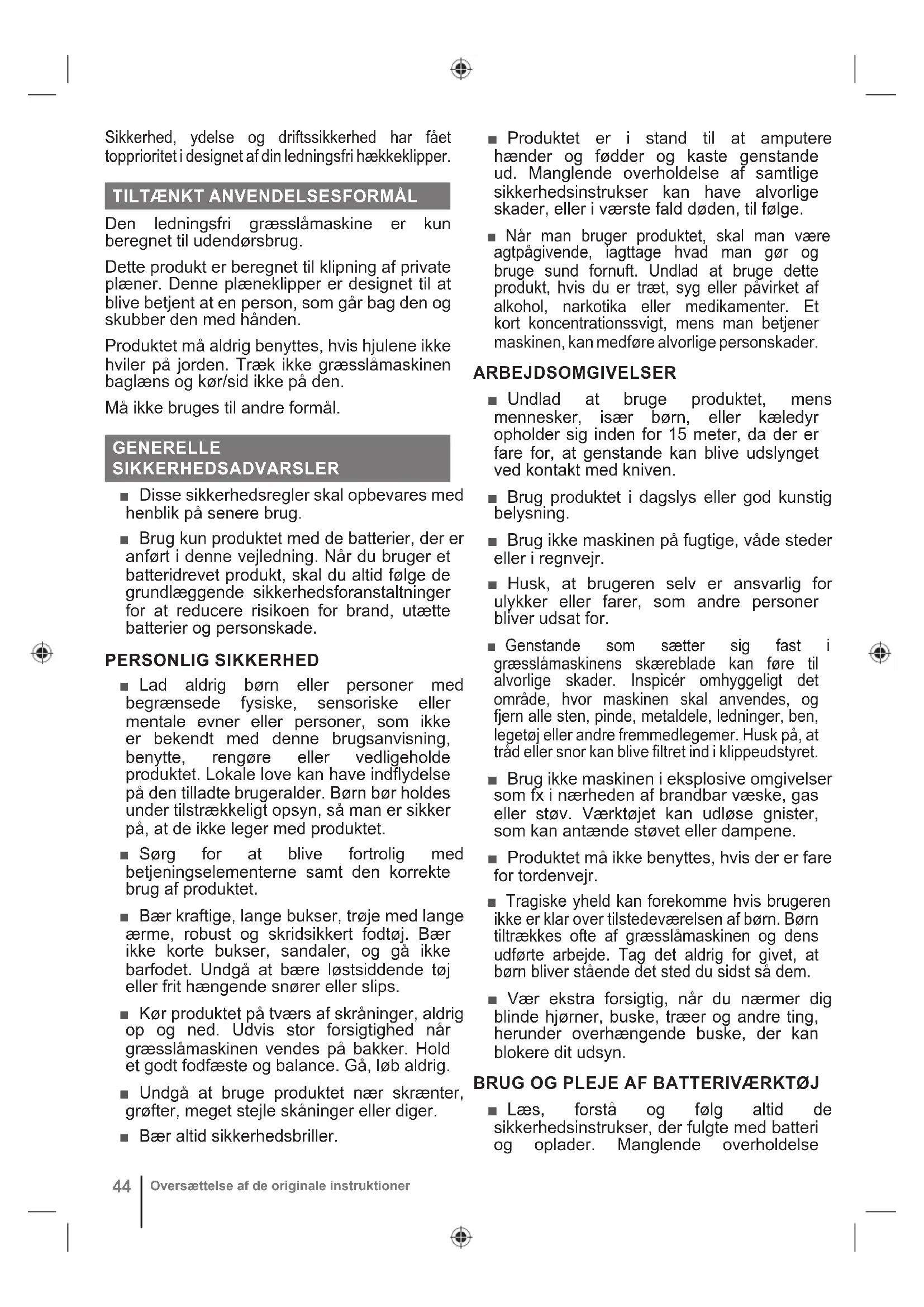 Den ledningsfri græsslåmaskine er kun beregnet til udendørsbrug. Dette produkt er beregnet til klipning af private plæner. Denne plæneklipper er designet til at blive betjent at en person, som går bag den og skubber den med hånden. Produktet må aldrig benyttes, hvis hjulene ikke hviler på jorden. Træk ikke græsslåmaskinen baglæns og kør/sid ikke på den. Må ikke bruges til andre formål. GENERELLE SIKKERHEDSADVARSLER ■ Disse sikkerhedsregler skal opbevares med henblik på senere brug. ■ Brug kun produktet med de batterier, der er anført i denne vejledning. Når du bruger et batteridrevet produkt, skal du altid følge de grundlæggende sikkerhedsforanstaltninger for at reducere risikoen for brand, utætte batterier og personskade. PERSONLIG SIKKERHED ■ Lad aldrig børn eller personer med begrænsede fysiske, sensoriske eller mentale evner eller personer, som ikke er bekendt med denne brugsanvisning, benytte, rengøre eller vedligeholde produktet. Lokale love kan have indflydelse på den tilladte brugeralder. Børn bør holdes under tilstrækkeligt opsyn, så man er sikker på, at de ikke leger med produktet. ■ Sørg for at blive fortrolig med betjeningselementerne samt den korrekte brug af produktet. ■ Bær kraftige, lange bukser, trøje med lange ærme, robust og skridsikkert fodtøj. Bær ikke korte bukser, sandaler, og gå ikke barfodet. Undgå at bære løstsiddende tøj eller frit hængende snører eller slips. ■ Kør produktet på tværs af skråninger, aldrig op og ned. Udvis stor forsigtighed når græsslåmaskinen vendes på bakker. Hold et godt fodfæste og balance. Gå, løb aldrig. ■ Undgå at bruge produktet nær skrænter, grøfter, meget stejle skåninger eller diger. ■ Bær altid sikkerhedsbriller. ■ Produktet er i stand til at amputere hænder og fødder og kaste genstande ud. Manglende overholdelse af samtlige sikkerhedsinstrukser kan have alvorlige skader, eller i værste fald døden, til følge. ■ Når man bruger produktet, skal man være agtpågivende, iagttage hvad man gør og bruge sund fornuft. Undlad at bruge dette produkt, hvis du er træt, syg eller påvirket af alkohol, narkotika eller medikamenter. Et kort koncentrationssvigt, mens man betjener maskinen, kan medføre alvorlige personskader. ARBEJDSOMGIVELSER ■ Undlad at bruge produktet, mens mennesker, især børn, eller kæledyr opholder sig inden for 15 meter, da der er fare for, at genstande kan blive udslynget ved kontakt med kniven. ■ Brug produktet i dagslys eller god kunstig belysning. ■ Brug ikke maskinen på fugtige, våde steder eller i regnvejr. ■ Husk, at brugeren selv er ansvarlig for ulykker eller farer, som andre personer bliver udsat for. ■ Genstande som sætter sig fast i græsslåmaskinens skæreblade kan føre til alvorlige skader. Inspicér omhyggeligt det område, hvor maskinen skal anvendes, og fjern alle sten, pinde, metaldele, ledninger, ben, legetøj eller andre fremmedlegemer. Husk på, at tråd eller snor kan blive filtret ind i klippeudstyret. ■ Brug ikke maskinen i eksplosive omgivelser som fx i nærheden af brandbar væske, gas eller støv. Værktøjet kan udløse gnister, som kan antænde støvet eller dampene. ■ Produktet må ikke benyttes, hvis der er fare for tordenvejr. ■ Tragiske yheld kan forekomme hvis brugeren ikke er klar over tilstedeværelsen af børn. Børn tiltrækkes ofte af græsslåmaskinen og dens udførte arbejde. Tag det aldrig for givet, at børn bliver stående det sted du sidst så dem. ■ Vær ekstra forsigtig, når du nærmer dig blinde hjørner, buske, træer og andre ting, herunder overhængende buske, der kan blokere dit udsyn. BRUG OG PLEJE AF BATTERIVÆRKTØJ ■ Læs, forstå og følg altid de sikkerhedsinstrukser, der fulgte med batteri og oplader. Manglende overholdelseDANSK