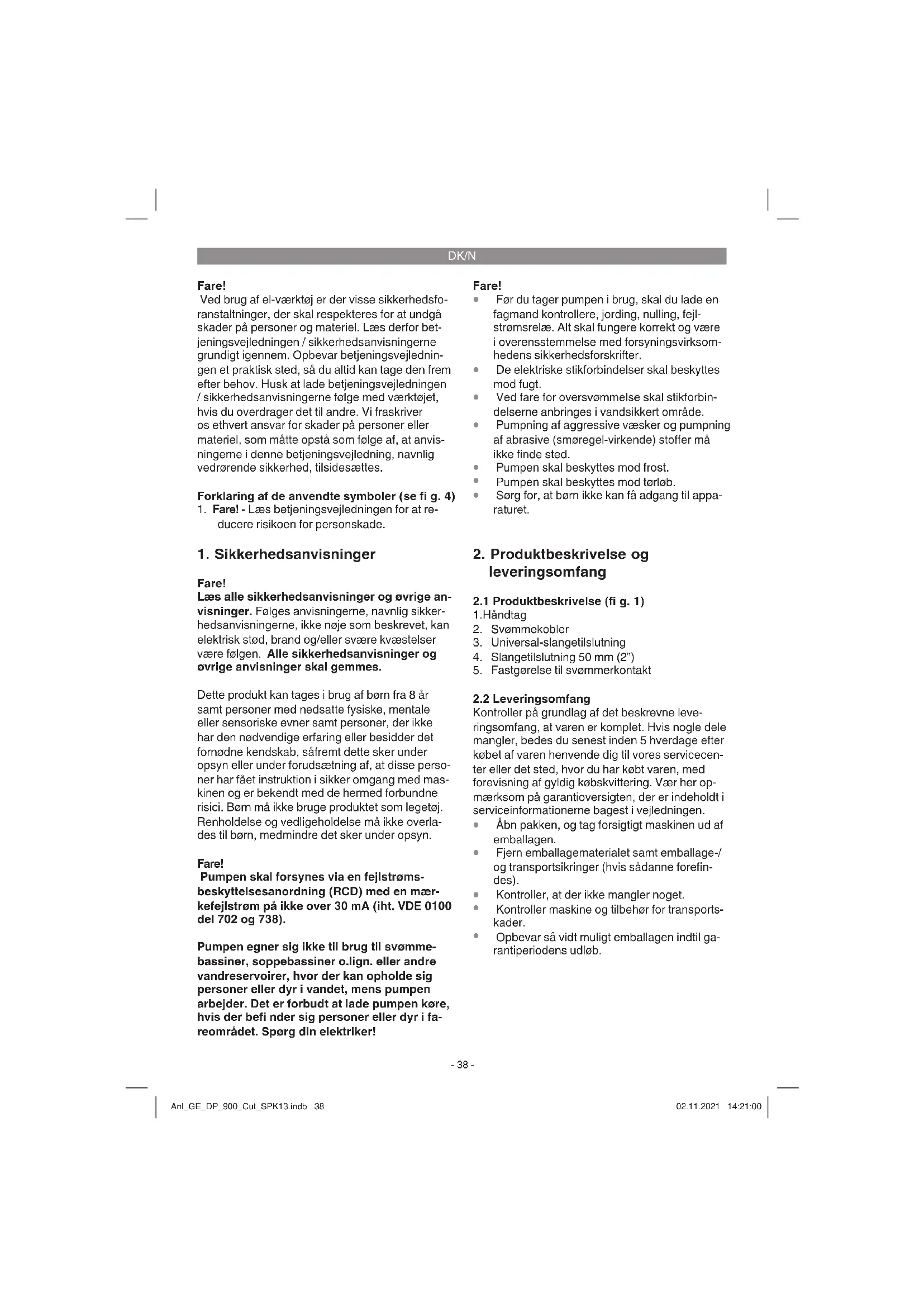 Fare! Læs alle sikkerhedsanvisninger og øvrige an- visninger. Følges anvisningerne, navnlig sikker- hedsanvisningerne, ikke nøje som beskrevet, kan elektrisk stød, brand og/eller svære kvæstelser være følgen. Alle sikkerhedsanvisninger og øvrige anvisninger skal gemmes. Dette produkt kan tages i brug af børn fra 8 år samt personer med nedsatte fysiske, mentale eller sensoriske evner samt personer, der ikke har den nødvendige erfaring eller besidder det fornødne kendskab, såfremt dette sker under opsyn eller under forudsætning af, at disse perso- ner har fået instruktion i sikker omgang med mas- kinen og er bekendt med de hermed forbundne risici. Børn må ikke bruge produktet som legetøj. Renholdelse og vedligeholdelse må ikke overla- des til børn, medmindre det sker under opsyn. Fare! Pumpen skal forsynes via en fejlstrøms- beskyttelsesanordning (RCD) med en mær- kefejlstrøm på ikke over 30 mA (iht. VDE 0100 del 702 og 738). Pumpen egner sig ikke til brug til svømme- bassiner, soppebassiner o.lign. eller andre vandreservoirer, hvor der kan opholde sig personer eller dyr i vandet, mens pumpen arbejder. Det er forbudt at lade pumpen køre, hvis der befi nder sig personer eller dyr i fa- reområdet. Spørg din elektriker! Fare!
