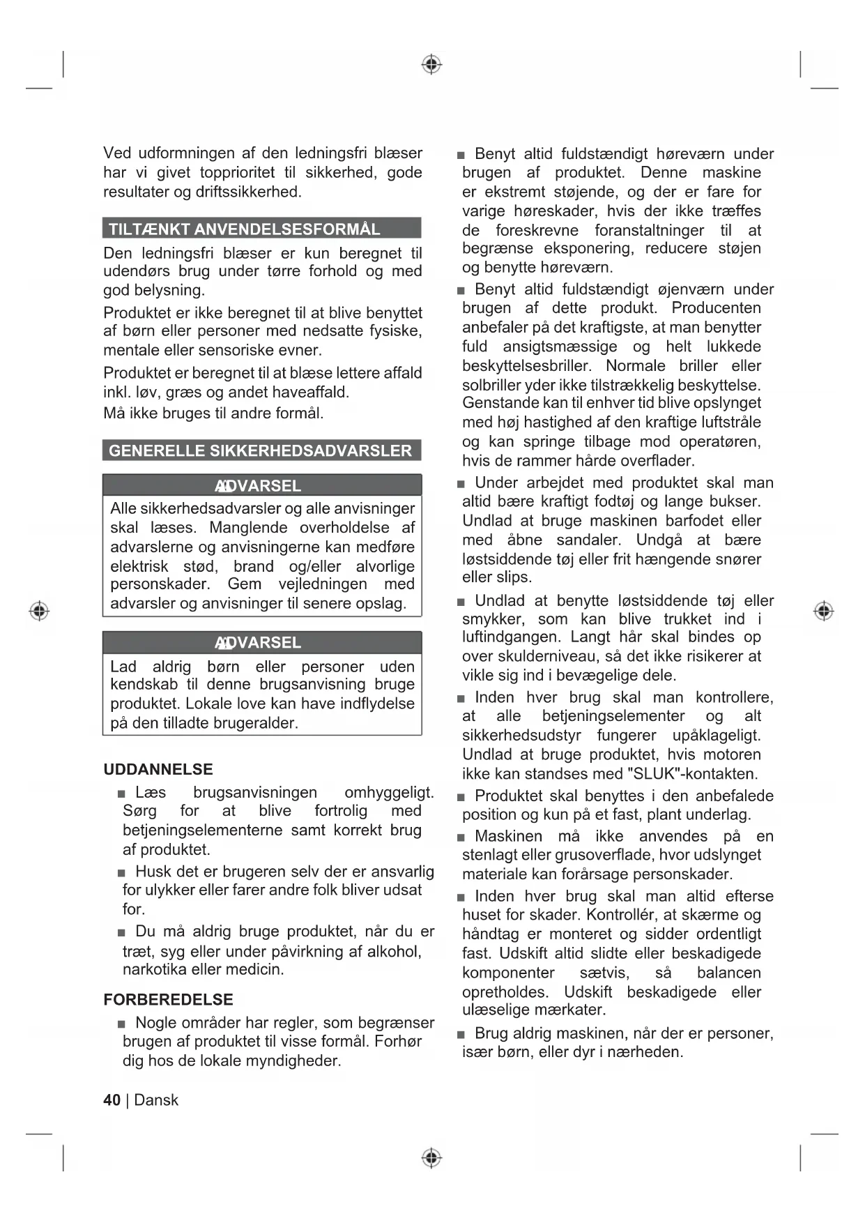 Den ledningsfri blæser er kun beregnet til udendørs brug under tørre forhold og med god belysning. Produktet er ikke beregnet til at blive benyttet af børn eller personer med nedsatte fysiske, mentale eller sensoriske evner. Produktet er beregnet til at blæse lettere affald inkl. løv, græs og andet haveaffald. Må ikke bruges til andre formål. GENERELLE SIKKERHEDSADVARSLER ADVARSEL Alle sikkerhedsadvarsler og alle anvisninger skal læses. Manglende overholdelse af advarslerne og anvisningerne kan medføre elektrisk stød, brand og/eller alvorlige personskader. Gem vejledningen med advarsler og anvisninger til senere opslag. ADVARSEL Lad aldrig børn eller personer uden kendskab til denne brugsanvisning bruge produktet. Lokale love kan have indflydelse på den tilladte brugeralder. UDDANNELSE ■ Læs brugsanvisningen omhyggeligt. Sørg for at blive fortrolig med betjeningselementerne samt korrekt brug af produktet. ■ Husk det er brugeren selv der er ansvarlig for ulykker eller farer andre folk bliver udsat for. ■ Du må aldrig bruge produktet, når du er træt, syg eller under påvirkning af alkohol, narkotika eller medicin. FORBEREDELSE ■ Nogle områder har regler, som begrænser brugen af produktet til visse formål. Forhør dig hos de lokale myndigheder. ■ Benyt altid fuldstændigt høreværn under brugen af produktet. Denne maskine er ekstremt støjende, og der er fare for varige høreskader, hvis der ikke træffes de foreskrevne foranstaltninger til at begrænse eksponering, reducere støjen og benytte høreværn. ■ Benyt altid fuldstændigt øjenværn under brugen af dette produkt. Producenten anbefaler på det kraftigste, at man benytter fuld ansigtsmæssige og helt lukkede beskyttelsesbriller. Normale briller eller solbriller yder ikke tilstrækkelig beskyttelse. Genstande kan til enhver tid blive opslynget med høj hastighed af den kraftige luftstråle og kan springe tilbage mod operatøren, hvis de rammer hårde overflader. ■ Under arbejdet med produktet skal man altid bære kraftigt fodtøj og lange bukser. Undlad at bruge maskinen barfodet eller med åbne sandaler. Undgå at bære løstsiddende tøj eller frit hængende snører eller slips. ■ Undlad at benytte løstsiddende tøj eller smykker, som kan blive trukket ind i luftindgangen. Langt hår skal bindes op over skulderniveau, så det ikke risikerer at vikle sig ind i bevægelige dele. ■ Inden hver brug skal man kontrollere, at alle betjeningselementer og alt sikkerhedsudstyr fungerer upåklageligt. Undlad at bruge produktet, hvis motoren ikke kan standses med "SLUK"-kontakten. ■ Produktet skal benyttes i den anbefalede position og kun på et fast, plant underlag. ■ Maskinen må ikke anvendes på en stenlagt eller grusoverflade, hvor udslynget materiale kan forårsage personskader. ■ Inden hver brug skal man altid efterse huset for skader. Kontrollér, at skærme og håndtag er monteret og sidder ordentligt fast. Udskift altid slidte eller beskadigede komponenter sætvis, så balancen opretholdes. Udskift beskadigede eller ulæselige mærkater. ■ Brug aldrig maskinen, når der er personer, især børn, eller dyr i nærheden.41 Dansk |