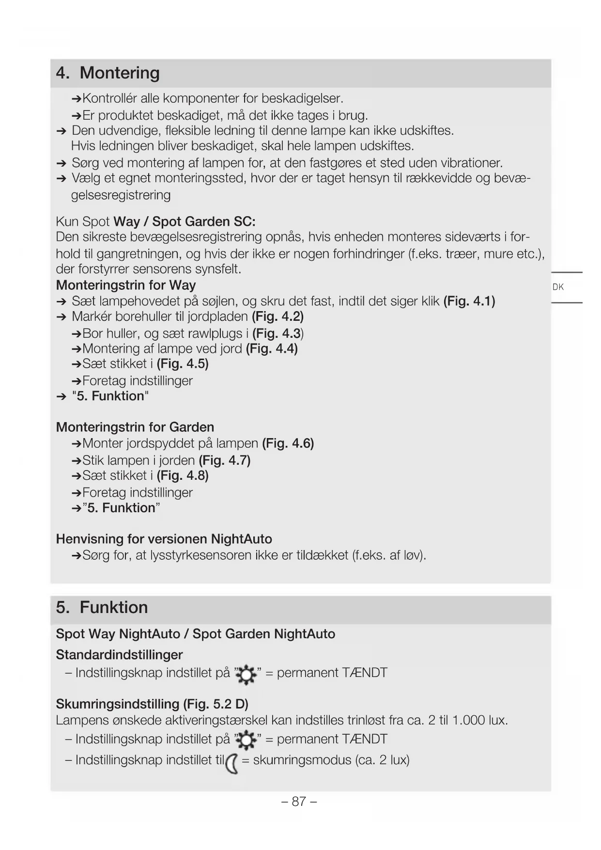 ( Kontrollér alle komponenter for beskadigelser. ( Er produktet beskadiget, må det ikke tages i brug. ( Den udvendige, fleksible ledning til denne lampe kan ikke udskiftes. Hvis ledningen bliver beskadiget, skal hele lampen udskiftes. ( Sørg ved montering af lampen for, at den fastgøres et sted uden vibrationer. ( Vælg et egnet monteringssted, hvor der er taget hensyn til rækkevidde og bevæ- gelsesregistrering Kun Spot Way / Spot Garden SC: Den sikreste bevægelsesregistrering opnås, hvis enheden monteres sideværts i for- hold til gangretningen, og hvis der ikke er nogen forhindringer (f.eks. træer, mure etc.), der forstyrrer sensorens synsfelt. Monteringstrin for Way ( Sæt lampehovedet på søjlen, og skru det fast, indtil det siger klik (Fig. 4.1) ( Markér borehuller til jordpladen (Fig. 4.2) ( Bor huller, og sæt rawlplugs i (Fig. 4.3) ( Montering af lampe ved jord (Fig. 4.4) ( Sæt stikket i (Fig. 4.5) ( Foretag indstillinger ( "5. Funktion" Monteringstrin for Garden ( Monter jordspyddet på lampen (Fig. 4.6) ( Stik lampen i jorden (Fig. 4.7) ( Sæt stikket i (Fig. 4.8) ( Foretag indstillinger ( ”5. Funktion” Henvisning for versionen NightAuto ( Sørg for, at lysstyrkesensoren ikke er tildækket (f.eks. af løv).
