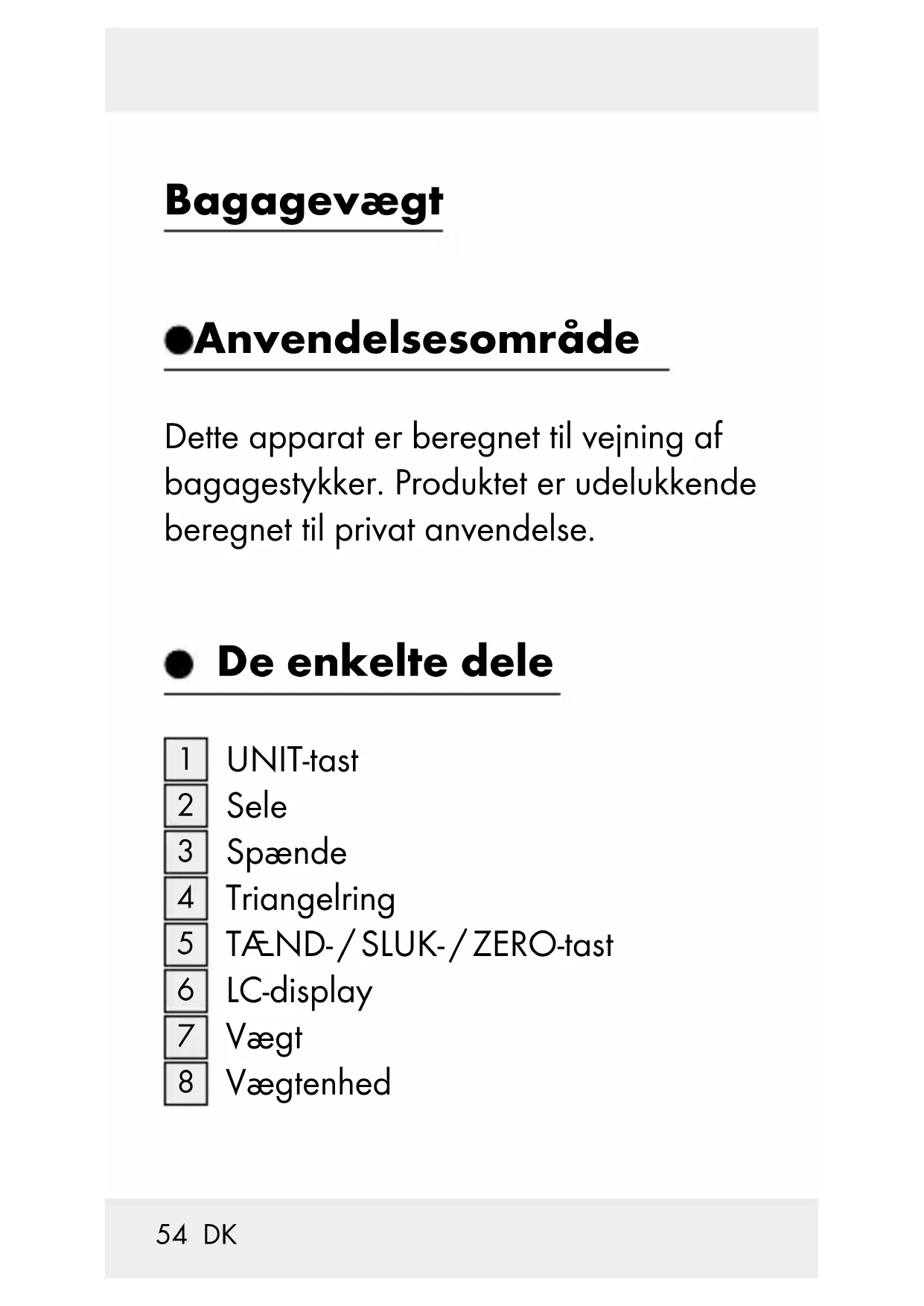 Isoleringsstrimler Tekniske data Vejeområde: 0,2–50 kg / 0,5–110 lb Skala: 0,05 kg / 0,1 lb Batteri: 1 x 3 V CR2032 Medfølger ved køb 1 digital kuffertvægt 1 3 V CR2032 1 betjeningsvejledning56 DK Sikkerheds- anvisninger Dette apparat kan bruges af børn fra 8 år og opad, samt af personer med forringede fysiske, følelsesmæssige eller mentale evner eller med mangel på erfaring og viden, når de er under opsyn eller iht. sikker brug af apparatet blev vej- ledt og forstod de derudaf resulte- rende farer. Børn må ikke lege med apparatet. Rengøring og vedligehol- delse må ikke gennemføres af børn uden opsyn. Kontrollér produktet for beskadigelser, inden det tages i brug. Tag ikke pro- duktet i brug, hvis det er beskadiget.57 DK Omkring batteriernes sikkerhed Hold batterier på afstand af børn. Lad ikke batterier ligge fremme. Der er risiko for, at børn eller kæledyr sluger dem. Søg lægehjælp med det samme, hvis et batteri er blevet slugt. Lad aldrig ikke genopla- delige batterier op, kort- slut dem ikke, og / eller åbn dem ikke. Batterier må aldrig kastes i ild eller vand. Ellers er der risiko for eksplosion. Sørg for, at polerne vender rigtigt, når batterierne lægges i! Det er vist i bat-58 DK terirummet. Ellers er der risiko for eks- plosion. Udsæt ikke batterierne for ekstreme miljøpåvirkninger og temperaturer, som forekommer for eksempel i nær- heden af radiatorer. Dette ville med- føre risiko for udløb. Fjern brugte batterier fra produktet omgående. Der er øget fare for udløb! Kontrollér regelmæssigt, at batterierne ikke løber ud i apparatet. Udløbne eller beskadigede batterier kan forårsage ætsninger ved berøring med huden; tag derfor i dette tilfælde egnede beskyttelseshandsker på! Undgå kontakt med hud, øjne og slimhinder. Ved berøring med batteri- syre, skal der skylles med rigeligt59 DK med vand og / eller opsøges læge- hjælp! Rens batteriets og apparatets kontakt inden indsættelse, hvis det er nødven- digt. Fjern batterierne fra apparatet, hvis dette ikke bruges i længere tid. Batterierne skal bortskaffes i henhold til bortskaffelseshenvisningerne. Ibrugtagning Henvisning: Fjern inden første ibrugtagning isoleringsstrimlen