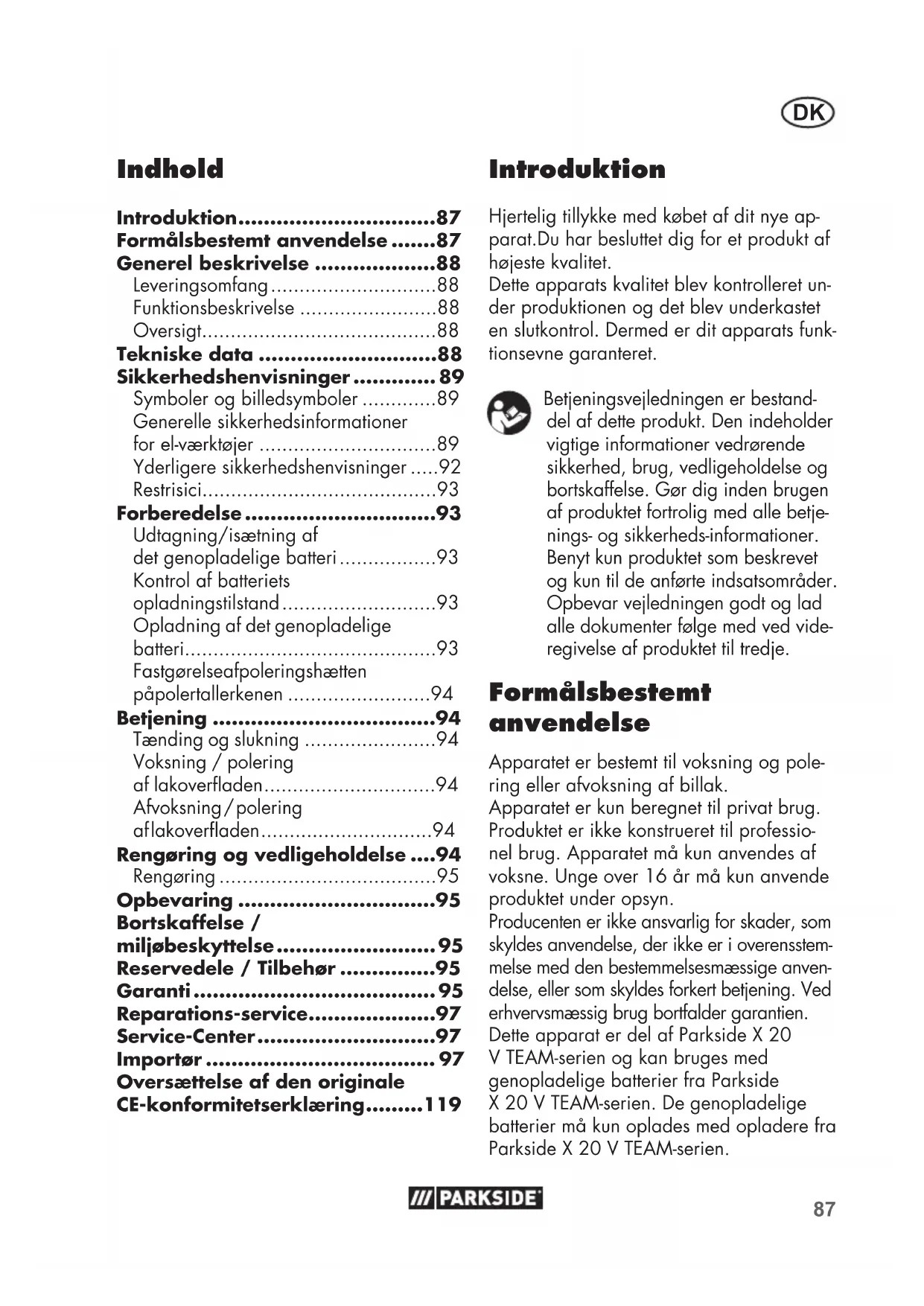 Producenten er/DDke ansvarlig for skader, som skyldes anvendelse, der icke er i overensstemmelse med den bestemmelsesmaessige anvendelse,ller som skyldes forkert betjening.Vederhvervsmaessig brug bortfaldar garantien. Dette apparat er del af Parkside X 20 V TEAM-serien og kan bruges med genopladelige batterier fra Parkside X 20V TEAM-serien.De genopladelige batterier ma kun oplades med opladere fra Parkside X 20V TEAM-serien.