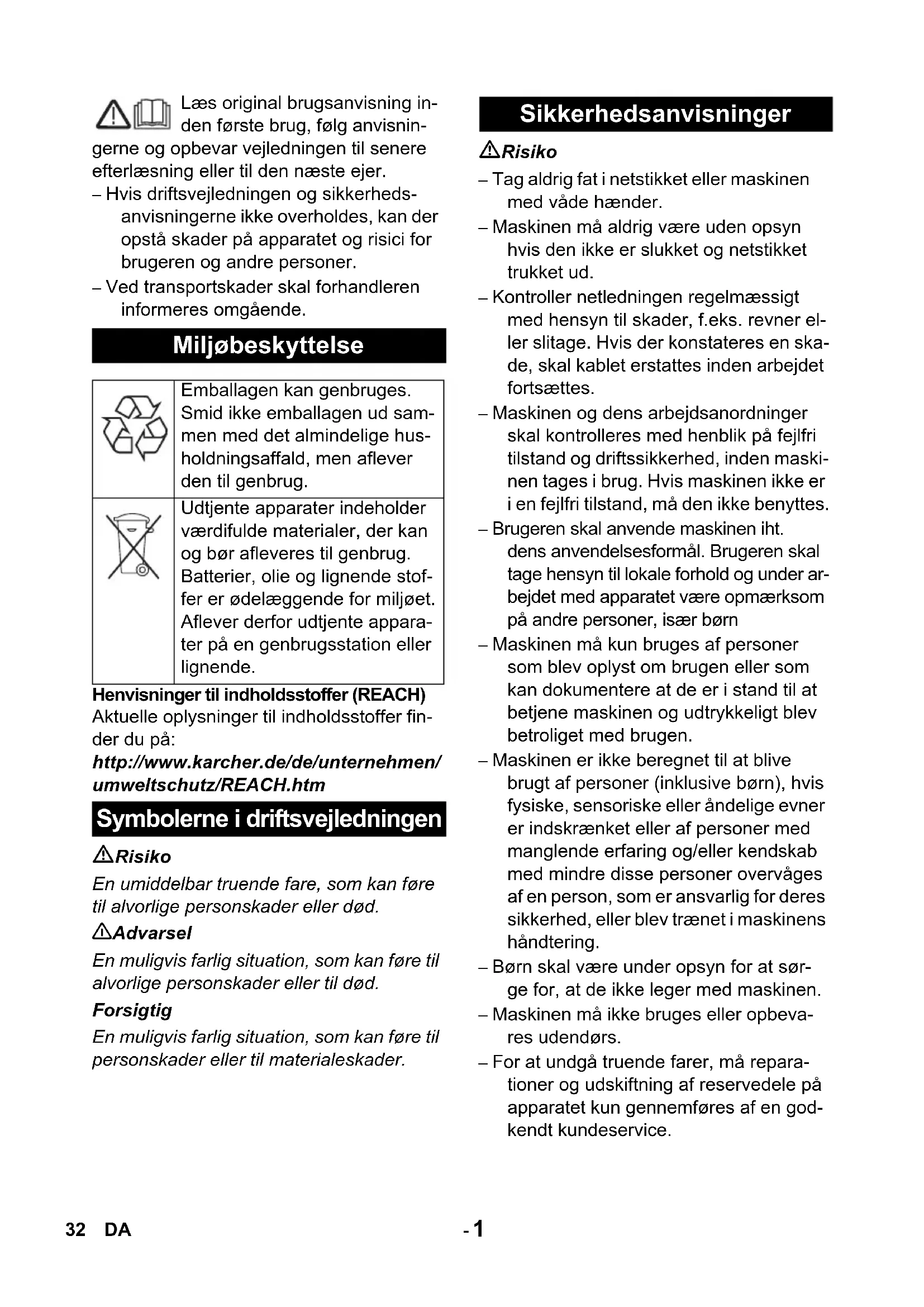 CEO Head of Approbation 31PT- 1 Læs original brugsanvisning in- den første brug, følg anvisnin- gerne og opbevar vejledningen til senere efterlæsning eller til den næste ejer. – Hvis driftsvejledningen og sikkerheds- anvisningerne ikke overholdes, kan der opstå skader på apparatet og risici for brugeren og andre personer. – Ved transportskader skal forhandleren informeres omgående. Henvisninger til indholdsstoffer (REACH) Aktuelle oplysninger til indholdsstoffer fin- der du på: http://www.karcher.de/de/unternehmen/ umweltschutz/REACH.htm Risiko En umiddelbar truende fare, som kan føre til alvorlige personskader eller død. 몇 Advarsel En muligvis farlig situation, som kan føre til alvorlige personskader eller til død. Forsigtig En muligvis farlig situation, som kan føre til personskader eller til materialeskader. Risiko – Tag aldrig fat i netstikket eller maskinen med våde hænder. – Maskinen må aldrig være uden opsyn hvis den ikke er slukket og netstikket trukket ud. – Kontroller netledningen regelmæssigt med hensyn til skader, f.eks. revner el- ler slitage. Hvis der konstateres en ska- de, skal kablet erstattes inden arbejdet fortsættes. – Maskinen og dens arbejdsanordninger skal kontrolleres med henblik på fejlfri tilstand og driftssikkerhed, inden maski- nen tages i brug. Hvis maskinen ikke er i en fejlfri tilstand, må den ikke benyttes. – Brugeren skal anvende maskinen iht. dens anvendelsesformål. Brugeren skal tage hensyn til lokale forhold og under ar- bejdet med apparatet være opmærksom på andre personer, især børn – Maskinen må kun bruges af personer som blev oplyst om brugen eller som kan dokumentere at de er i stand til at betjene maskinen og udtrykkeligt blev betroliget med brugen. – Maskinen er ikke beregnet til at blive brugt af personer (inklusive børn), hvis fysiske, sensoriske eller åndelige evner er indskrænket eller af personer med manglende erfaring og/eller kendskab med mindre disse personer overvåges af en person, som er ansvarlig for deres sikkerhed, eller blev trænet i maskinens håndtering. – Børn skal være under opsyn for at sør- ge for, at de ikke leger med maskinen. – Maskinen må ikke bruges eller opbeva- res udendørs. – For at undgå truende farer, må repara- tioner og udskiftning af reservedele på apparatet kun gennemføres af en god- kendt kundeservice. Miljøbeskyttelse Emballagen kan genbruges. Smid ikke emballagen ud sam- men med det almindelige hus- holdningsaffald, men aflever den til genbrug. Udtjente apparater indeholder værdifulde materialer, der kan og bør afleveres til genbrug. Batterier, olie og lignende stof- fer er ødelæggende for miljøet. Aflever derfor udtjente appara- ter på en genbrugsstation eller lignende. Symbolerne i driftsvejledningen Sikkerhedsanvisninger 32 DA- 2– Blæseren er beregnet til tørring af vådt rensede tæpper/gulvtæpper.– Maskinen er udelukkende beregnet til industriel brug.Enhver anvendelse, der går herudover, gælder som ikke-bestemmelsesmæssig. Producenten er ikke ansvarlig for skader, der måtte opstå som følge heraf; risikoen er brugerens alene.1 Transportgreb2 Fastgørelse transporthåndtag3 Netkabel4 Tranporthjul5 Fastspændingsdel med stjernehåndtag6 Blæser7 Håndtag8AfbryderÎ Montere transporthåndtaget.Bemærk: Ved opstilling af apparatet skal der holdes øje med, at blæserens gitter ikke tildækkes.Î Åbn døre og vinduer så vidt som muligt for at forbedre ventilationen.Î Stil maskinen på det gulvtæppe som skal tørres.Î Løft gulvtæppet.Î Skub gulvtæppet under maskinens fast-spændingsdel og fastgør den ved at dreje stjernehåndtaget.Î Sæt netstikket i.Î Tænd for maskinen.Î Sluk for renseren Î Træk netstikket ud. Bestemmelsesmæssig anvendelse Maskinelementer Ibrugtagning