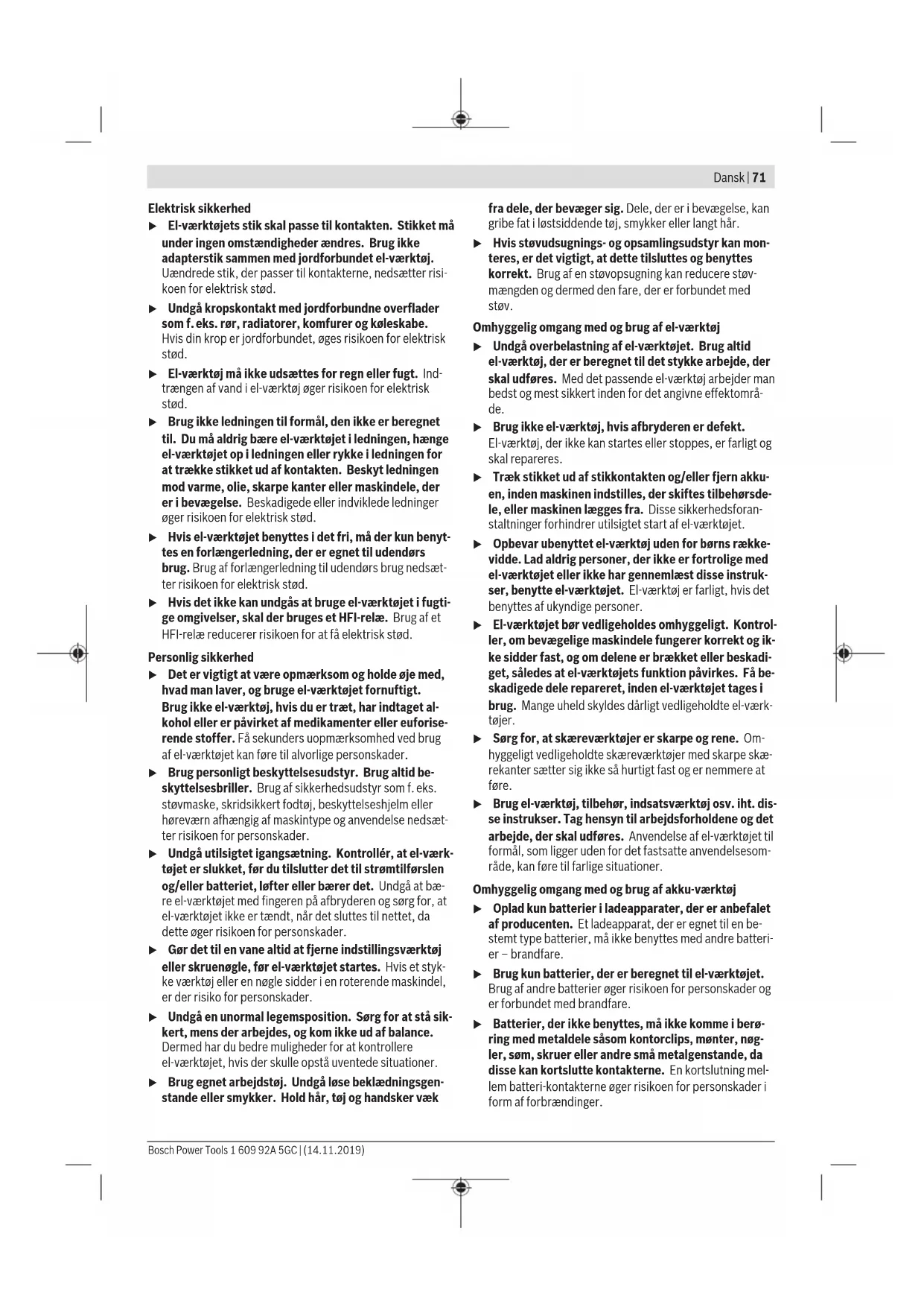 1,5 1,5 Det svingningsniveau og støjemissionsniveau, der fremgår af anvisningerne, er målt iht. en standardiseret måleværdi og kan anvendes til sammenligning af elværktøj med hinanden. De er også egnet til en foreløbig vurdering af svingnings- og støjemissionen. Det angivne svingnings- og støjemissionsniveau repræsente- rer de væsentlige anvendelser af el‑værktøjet. Hvis el‑værk- tøjet dog anvendes til andre formål, med afvigende indsats- værktøj eller utilstrækkelig vedligeholdelse, kan svingnings- og støjemissionsniveauet afvige. Dette kan føre til en betyde- lig forøgelse af svingnings- og støjemissionen i hele arbejds- tidsrummet. Til en nøjagtig vurdering af svingnings- og støjemissionen bør der også tages højde for de tider, i hvilke værktøjet er sluk- ket eller godt nok kører, men rent faktisk ikke anvendes. Det- te kan føre til en betydelig reduktion af svingnings- og støje- missionsniveauet i hele arbejdstidsrummet. Fastlæg ekstra sikkerhedsforanstaltninger til beskyttelse af brugeren mod svingningers virkning som f.eks.: Vedligehol- delse af el‑værktøj og indsatsværktøj, holde hænder varme, organisation af arbejdsforløb. Montering u Anbring retningsomskifteren i midterstilling, før der arbejdes på maskinen (f.eks. vedligeholdelse, værk- tøjsskift osv.) samt før det transporteres og lægges til opbevaring. Utilsigtet aktivering af start-stop-kontakten er forbundet med kvæstelsesfare. Opladning af akku u Brug kun de ladeaggregater, der fremgår af de tekni- ske data. Kun disse ladeaggregater er afstemt i forhold til den Li-ion-akku, der bruges på dit el-værktøj. Bemærk: Akkuen leveres delvis opladet. For at sikre, at ak- kuen fungerer 100%, oplades akkuen helt før første ibrug- tagning. Li-ion-akkuen kan oplades til enhver tid, uden at levetiden forkortes. En afbrydelse af opladningen beskadiger ikke ak- kuen. Lithium-ion-batteriet er beskyttet mod dybafladning via "Electronic Cell Protection (ECP)" (elektronisk cellebeskyt- telse). Er akkuen afladet, slukkes el-værktøjet med en be- skyttelseskontakt: Indsatsværktøjet bevæger sig ikke mere. u Tryk ikke videre på start-stop-kontakten efter auto- matisk slukning af el‑værktøjet. Batteriet kan blive be- skadiget. Læs og overhold henvisningerne mht. bortskaffelse. Udtagning af akku Akkuen(14) har to låsetrin, der forhindrer, at akkuen falder ud, hvis du skulle komme til at trykke på akku-oplåsningsk- nappen(10) ved et uheld. Så længe akkuen sidder i el-værk- tøjet, holdes den i position af en fjeder. – Akkuen (14) tages ud ved at trykke på oplåsningsknap- pen (10) og trække akkuen ud af el-værktøjet. Undgå brug af vold. Akku-ladetilstandsindikator De grønne lysdioder på akku-ladetilstandsindikatoren viser akkuens ladetilstand. Af sikkerhedsgrunde er det kun muligt at forespørge om ladetilstanden, når el-værktøjet er stands- et. Tryk på tasten til ladetilstandsindikatoren eller for at få vist ladetilstanden. Dette er også muligt, når akkuen er taget ud. Hvis ingen lysdioder lyser efter tryk på tasten til ladetilstand- sindikatoren, er akkuen defekt og skal udskiftes. 1 609 92A 5GC | (14.11.2019) Bosch Power ToolsDansk | 75 Akku-type GBA 18V... Lysdioder Kapacitet Konstant lys 3× grøn 60−100% Konstant lys 2× grøn 30−60% Konstant lys 1× grøn 5−30% Blinkende lys 1× grøn 0−5% Akku-type ProCORE18V... Lysdioder Kapacitet Konstant lys 5× grøn 80–100 % Konstant lys 4× grøn 60–80 % Konstant lys 3× grøn 40–60 % Konstant lys 2× grøn 20–40 % Konstant lys 1× grøn 5–20 % Blinkende lys 1× grøn 0–5 % Ekstrahåndtag u Brug kun dit el-værktøj med ekstrahåndtaget (19). Drejning af ekstrahåndtag (se billede A) Du kan dreje ekstrahåndtaget (19) efter behov for at opnå en sikker og mindre trættende arbejdsstilling. – Drej det nederste grebsstykke på ekstrahåndtaget (19) mod uret, og drej ekstrahåndtaget (19) i den ønskede po- sition. Spænd herefter det nederste grebsstykke på ek- strahåndtaget (19) fast igen ved at dreje det med uret. Sørg for, at ekstrahåndtagets spændebånd sidder i den dertil beregnede rille på huset. Valg af borepatron og værktøj Til hammerboring og mejsling skal du bruge SDS-plus-værk- tøj, der indsættes i SDS-plus-borepatronen. Til boring uden slag i træ, metal, keramik og plast samt til skruning anvendes værktøj uden SDS-plus (f.eks. bor med cylindrisk skaft). Til sådant værktøj skal der bruges en selvspændende borepatron hhv. en tandkransborepatron. Isætning/udtagning af tandkransborepatron (GBH18V-26) Montering af tandkransborepatron (se billede B) – Skru SDS-plus-holdeskaftet (23) ind i tandkransborepa- tronen (22). Sørg for at sikre tandkransborepatronen (22) med sikringsskruen (21). Vær opmærksom på, at sikringsskruen har venstregevind. Isætning af tandkransborepatron (se billede B) – Rengør holdeskaftets indstiksende, og smør den med en smule fedt. – Sæt tandkransborepatronen med holdeskaftet drejende ind i værktøjsholderen, til den fastlåses af sig selv. – Kontrollér, at tandkrandsborepatronen sidder rigtigt fast ved at trække i den. Udtagning af tandkrandsborepatron – Skub låsekappen (5) bagud, og tag tandkransborepatro- nen (22) af. Udtagning/isætning af udskiftningsborepatron (GBH18V-26F) Udtagning af udskiftningsborepatron (se billede C) – Træk udskiftningsborepatronens låsering (6) bagud, hold den fast i denne position, og træk SDS-plus-udskiftnings- borepatronen (2) eller den selvspændende udskiftnings- borepatron (1) af fremefter. – Beskyt udskiftningsborepatronen mod tilsmudsning efter aftagningen. Isætning af udskiftningsborepatron (se billede D) u Brug kun modelspecifikt originalt udstyr, og kontrol- lér i den forbindelse antallet af koderiller (25). Kun udskiftningsborepatroner med to eller tre koderiller er tilladte. Hvis du anvender en udskiftningsborepatron, der ikke er egnet til el-værktøjet, kan indsatsvær