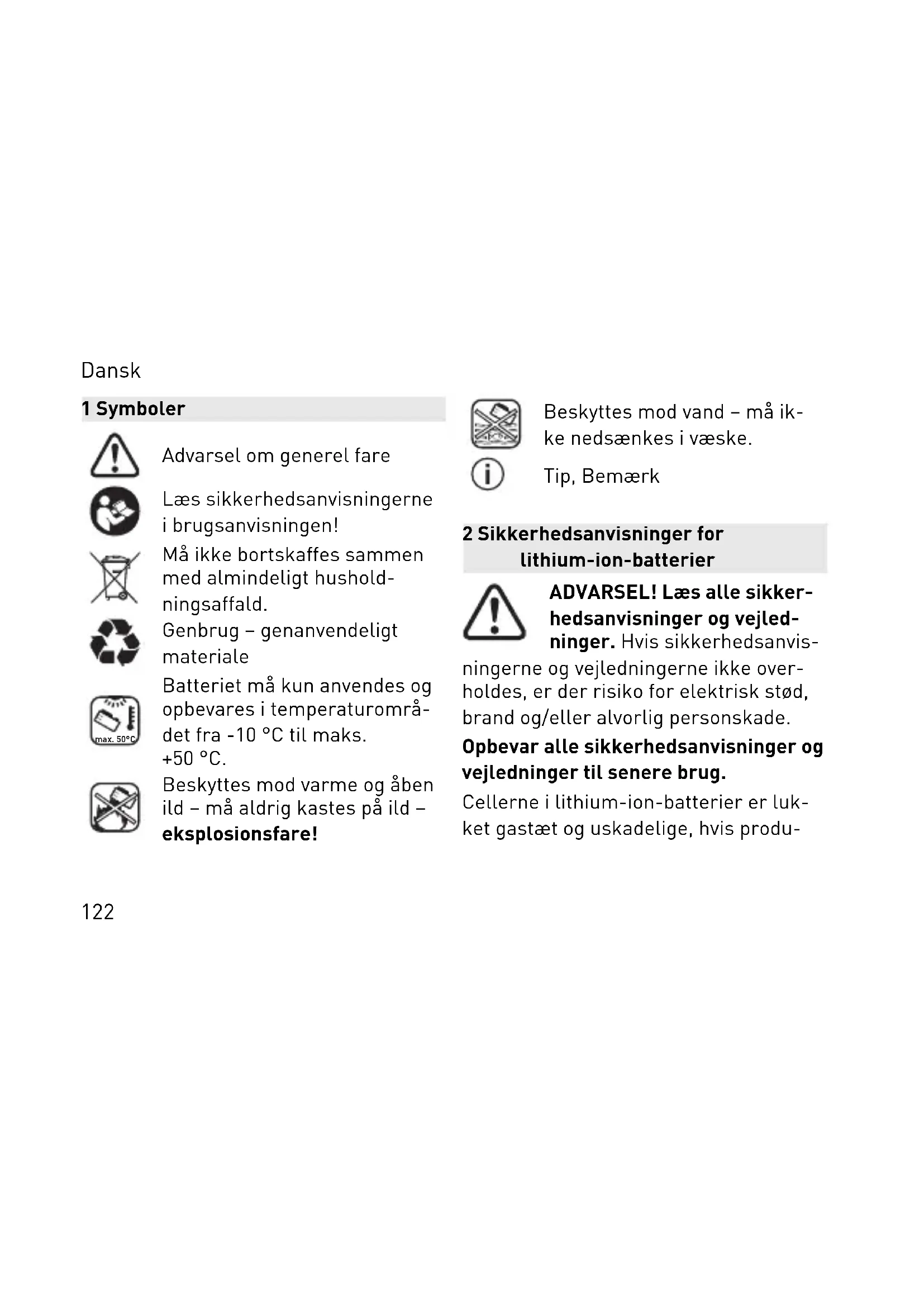 Laite sisältää sirun, joka tallentaa auto maattisesti kone- ja käyttötiedot. Tal lennetuista tiedoista ei voi päätellä suo raan henkilöllisyyttä. Tiedot voidaan lukea kosketuksetta eri koislaitteilla ja Festool käyttää saami aan tietoja yksinomaan laitteen vian määritykseen, korjaus- ja takuutöihin sekä laadunparannus- ja edelleenkehi tystarkoituksiin. Tietoja ei käytetä tätä pidemmälle ilman asiakkaan erikseen antamaa lupaa. Suomi 1211 Symboler Advarsel om generel fare Læs sikkerhedsanvisningerne i brugsanvisningen! Må ikke bortskaffes sammen med almindeligt hushold ningsaffald. Genbrug – genanvendeligt materiale max. 50°C Batteriet må kun anvendes og opbevares i temperaturområ det fra -10 °C til maks. +50 °C. Beskyttes mod varme og åben ild – må aldrig kastes på ild – eksplosionsfare! Beskyttes mod vand – må ik ke nedsænkes i væske. Tip, Bemærk 2 Sikkerhedsanvisninger for lithium-ion-batterier ADVARSEL! Læs alle sikker hedsanvisninger og vejled ninger. Hvis sikkerhedsanvis ningerne og vejledningerne ikke over holdes, er der risiko for elektrisk stød, brand og/eller alvorlig personskade. Opbevar alle sikkerhedsanvisninger og vejledninger til senere brug. Cellerne i lithium-ion-batterier er luk ket gastæt og uskadelige, hvis produ Dansk 122centens forskrifter overholdes ved brug og håndtering. – Afladede batterier skal behandles forsigtigt. Batterier er en farekilde, da de kan forårsage en meget høj kortslutningsstrøm. Lithium-ion-bat terier er aldrig helt afladede, heller ikke selvom det ser sådan ud. – Undgå fysiske slag eller påvirknin ger. Slag og indtrængning af gen stande kan beskadige batterierne. Det kan medføre lækage, varmeudvik ling, røgudvikling, antændelse eller eksplosion af batteriet. – Batterier, der ikke benyttes, skal be skyttes mod metalgenstande (f.eks. søm, skruer, nøgler, papirclips og lignende), da de kan skabe forbindel se mellem de to kontakter. Kortslut ning mellem batteriets kontakter kan forårsage forbrændinger eller brand. – Beskyt batteriet mod varme, f.eks. også mod permanent sollys og ild. Ild og temperaturer over 130 °C kan medføre eksplosioner. – Åbn ikke batteriet. Åbning eller æn dring af batteriet kan beskadige be skyttelsesanordningerne. Det kan medføre varmeudvikling, røgudvik ling, antændelse eller eksplosion af batteriet. – Nedsænk ikke batteriet i væske, f.eks. (salt-)vand eller drikkevarer. Kontakt med væske kan beskadige batteriet. Det kan medføre varmeud vikling, røgudvikling, antændelse eller eksplosion af batteriet. Stop brugen af Dansk 123batteriet, og kontakt Festool-kunde service. – Oplad kun batterierne i ladere, der er anbefalet af producenten (se figu ren). Ladere, der er beregnet til en bestemt type batterier, kan bryde i brand, hvis de anvendes med andre batterier. – Sluk aldrig brændende lithium-ion- batterier med vand! Anvend sand el ler brandslukningstæppe. – Der kan komme dampe ud, hvis bat teriet beskadiges eller anvendes for kert. Dampene kan irritere luftvejene. Tilfør frisk luft, og søg læge i tilfælde af ubehag. – Brug kun batteriet sammen med dit Festool-apparat. Kun på den måde beskyttes batteriet mod farlig overbe lastning. Hvis du benytter et andet ap parat, kan det medføre personskade og brandfare. – Hvis batteriet anvendes forkert, kan der løbe væske ud af batteriet. Und gå kontakt med væsken. Hvis du alli gevel kommer i kontakt med væ sken, skal du skylle med vand. Hvis du får væske i øjnene, skal du søge læge. Batterivæske, som løber ud, kan medføre hudirritation eller for brænding. – Hvis et batteri er defekt, kan der løbe væske ud, og genstande i nærheden kan blive smudset til. Kontrollér de berørte dele. Rengør dem ved at op suge væsken med et tørt stykke køk kenrulle, og skyl derefter med rigeligt vand. Brug beskyttelseshandsker for Dansk 124at undgå hudkontakt. Udskift om nød vendigt delene. – Brug ikke beskadigede eller ændre de batterier. Beskadigede eller æn drede batterier kan reagere på en uforudsigelig måde, som kan medføre brand, eksplosion eller personskader. – Brug ikke beskadigede batterier. Stop straks brugen af et batteri, hvis det reagerer unormalt, og der for ek sempel forekommer røgudvikling, varme, misfarvning eller deformati on. Hvis du alligevel bruger batteriet, kan det udvikle varme og røg, antæn des eller eksplodere. – Åbn, knus, overophed (over 80 °C), eller brænd ikke batteriet. Hvis dette ikke overholdes, er der risiko for for brænding og brand. Følg producen tens anvisninger. 3 Tekniske data Batteri BP 18 Li Frekvens 2402 Mhz-2480 Mhz Ækvivalent isotrop strå lingseffekt (EIRP) <10 dBm Dansk 125Vægt BP 18 Li 3,1 Ergo I 0,4 kg BP 18 Li 3,1 CI 0,4 kg BP 18 Li 5,2 ASI 0,7 kg BP 18 Li 6,2 ASI 0,7 kg BP 18 Li 4,0 HPC-ASI 0,6 kg Yderligere tekniske data fremgår af batteriets typeskilt. 4 Bestemmelsesmæssig brug Batterier er egnede til brug sammen med batteridrevet Festool-el-værktøj og de angivne Festool-batteriladere (se figuren). Batteriet er egnet til automatisk til-/ frakobling af støvsugeren. 5 Produktets elementer [1-1] Tast til kapacitetsindikation [1-2] Kapacitetsindikator [1-3] Bluetooth
