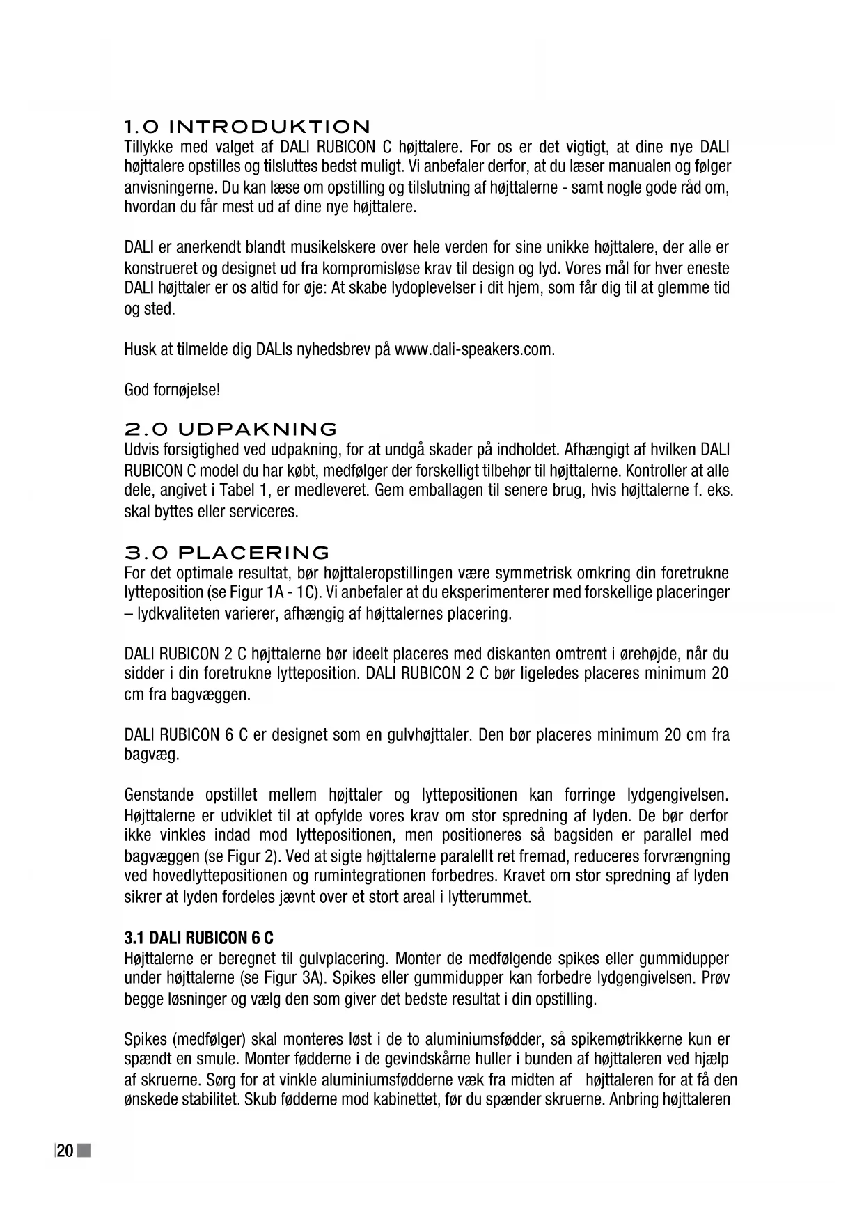 Tillykke med valget af DALI RUBICON C højttalere. For os er det vigtigt, at dine nye DALI højttalere opstilles og tilsluttes bedst muligt. Vi anbefaler derfor, at du læser manualen og følger anvisningerne. Du kan læse om opstilling og tilslutning af højttalerne - samt nogle gode råd om, hvordan du får mest ud af dine nye højttalere. DALI er anerkendt blandt musikelskere over hele verden for sine unikke højttalere, der alle er konstrueret og designet ud fra kompromisløse krav til design og lyd. Vores mål for hver eneste DALI højttaler er os altid for øje: At skabe lydoplevelser i dit hjem, som får dig til at glemme tid og sted. Husk at tilmelde dig DALIs nyhedsbrev på www.dali-speakers.com. God fornøjelse!