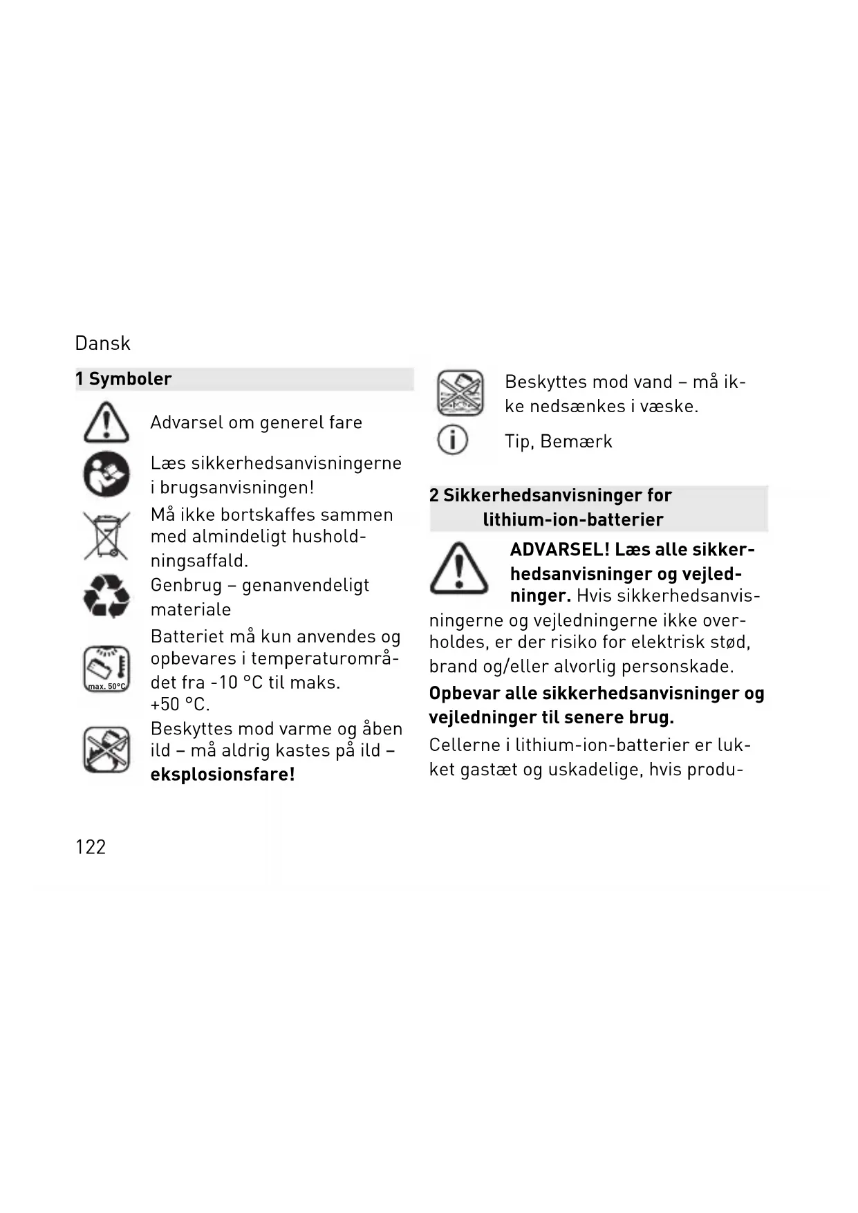 Laite sisältää sirun, joka tallentaa auto maattisesti kone- ja käyttötiedot. Tal lennetuista tiedoista ei voi päätellä suo raan henkilöllisyyttä. Tiedot voidaan lukea kosketuksetta eri koislaitteilla ja Festool käyttää saami aan tietoja yksinomaan laitteen vian määritykseen, korjaus- ja takuutöihin sekä laadunparannus- ja edelleenkehi tystarkoituksiin. Tietoja ei käytetä tätä pidemmälle ilman asiakkaan erikseen antamaa lupaa. Suomi 1211 Symboler Advarsel om generel fare Læs sikkerhedsanvisningerne i brugsanvisningen! Må ikke bortskaffes sammen med almindeligt hushold ningsaffald. Genbrug – genanvendeligt materiale max. 50°C Batteriet må kun anvendes og opbevares i temperaturområ det fra -10 °C til maks. +50 °C. Beskyttes mod varme og åben ild – må aldrig kastes på ild – eksplosionsfare! Beskyttes mod vand – må ik ke nedsænkes i væske. Tip, Bemærk 2 Sikkerhedsanvisninger for lithium-ion-batterier ADVARSEL! Læs alle sikker hedsanvisninger og vejled ninger. Hvis sikkerhedsanvis ningerne og vejledningerne ikke over holdes, er der risiko for elektrisk stød, brand og/eller alvorlig personskade. Opbevar alle sikkerhedsanvisninger og vejledninger til senere brug. Cellerne i lithium-ion-batterier er luk ket gastæt og uskadelige, hvis produ Dansk 122centens forskrifter overholdes ved brug og håndtering. – Afladede batterier skal behandles forsigtigt. Batterier er en farekilde, da de kan forårsage en meget høj kortslutningsstrøm. Lithium-ion-bat terier er aldrig helt afladede, heller ikke selvom det ser sådan ud. – Undgå fysiske slag eller påvirknin ger. Slag og indtrængning af gen stande kan beskadige batterierne. Det kan medføre lækage, varmeudvik ling, røgudvikling, antændelse eller eksplosion af batteriet. – Batterier, der ikke benyttes, skal be skyttes mod metalgenstande (f.eks. søm, skruer, nøgler, papirclips og lignende), da de kan skabe forbindel se mellem de to kontakter. Kortslut ning mellem batteriets kontakter kan forårsage forbrændinger eller brand. – Beskyt batteriet mod varme, f.eks. også mod permanent sollys og ild. Ild og temperaturer over 130 °C kan medføre eksplosioner. – Åbn ikke batteriet. Åbning eller æn dring af batteriet kan beskadige be skyttelsesanordningerne. Det kan medføre varmeudvikling, røgudvik ling, antændelse eller eksplosion af batteriet. – Nedsænk ikke batteriet i væske, f.eks. (salt-)vand eller drikkevarer. Kontakt med væske kan beskadige batteriet. Det kan medføre varmeud vikling, røgudvikling, antændelse eller eksplosion af batteriet. Stop brugen af Dansk 123batteriet, og kontakt Festool-kunde service. – Oplad kun batterierne i ladere, der er anbefalet af producenten (se figu ren). Ladere, der er beregnet til en bestemt type batterier, kan bryde i brand, hvis de anvendes med andre batterier. – Sluk aldrig brændende lithium-ion- batterier med vand! Anvend sand el ler brandslukningstæppe. – Der kan komme dampe ud, hvis bat teriet beskadiges eller anvendes for kert. Dampene kan irritere luftvejene. Tilfør frisk luft, og søg læge i tilfælde af ubehag. – Brug kun batteriet sammen med dit Festool-apparat. Kun på den måde beskyttes batteriet mod farlig overbe lastning. Hvis du benytter et andet ap parat, kan det medføre personskade og brandfare. – Hvis batteriet anvendes forkert, kan der løbe væske ud af batteriet. Und gå kontakt med væsken. Hvis du alli gevel kommer i kontakt med væ sken, skal du skylle med vand. Hvis du får væske i øjnene, skal du søge læge. Batterivæske, som løber ud, kan medføre hudirritation eller for brænding. – Hvis et batteri er defekt, kan der løbe væske ud, og genstande i nærheden kan blive smudset til. Kontrollér de berørte dele. Rengør dem ved at op suge væsken med et tørt stykke køk kenrulle, og skyl derefter med rigeligt vand. Brug beskyttelseshandsker for Dansk 124at undgå hudkontakt. Udskift om nød vendigt delene. – Brug ikke beskadigede eller ændre de batterier. Beskadigede eller æn drede batterier kan reagere på en uforudsigelig måde, som kan medføre brand, eksplosion eller personskader. – Brug ikke beskadigede batterier. Stop straks brugen af et batteri, hvis det reagerer unormalt, og der for ek sempel forekommer røgudvikling, varme, misfarvning eller deformati on. Hvis du alligevel bruger batteriet, kan det udvikle varme og røg, antæn des eller eksplodere. – Åbn, knus, overophed (over 80 °C), eller brænd ikke batteriet. Hvis dette ikke overholdes, er der risiko for for brænding og brand. Følg producen tens anvisninger. 3 Tekniske data Batteri BP 18 Li Frekvens 2402 Mhz-2480 Mhz Ækvivalent isotrop strå lingseffekt (EIRP) <10 dBm Dansk 125Vægt BP 18 Li 3,1 Ergo I 0,4 kg BP 18 Li 3,1 CI 0,4 kg BP 18 Li 5,2 ASI 0,7 kg BP 18 Li 6,2 ASI 0,7 kg BP 18 Li 4,0 HPC-ASI 0,6 kg Yderligere tekniske data fremgår af batteriets typeskilt. 4 Bestemmelsesmæssig brug Batterier er egnede til brug sammen med batteridrevet Festool-el-værktøj og de angivne Festool-batteriladere (se figuren). Batteriet er egnet til automatisk til-/ frakobling af støvsugeren. 5 Produktets elementer [1-1] Tast til kapacitetsindikation [1-2] Kapacitetsindikator [1-3] Bluetooth