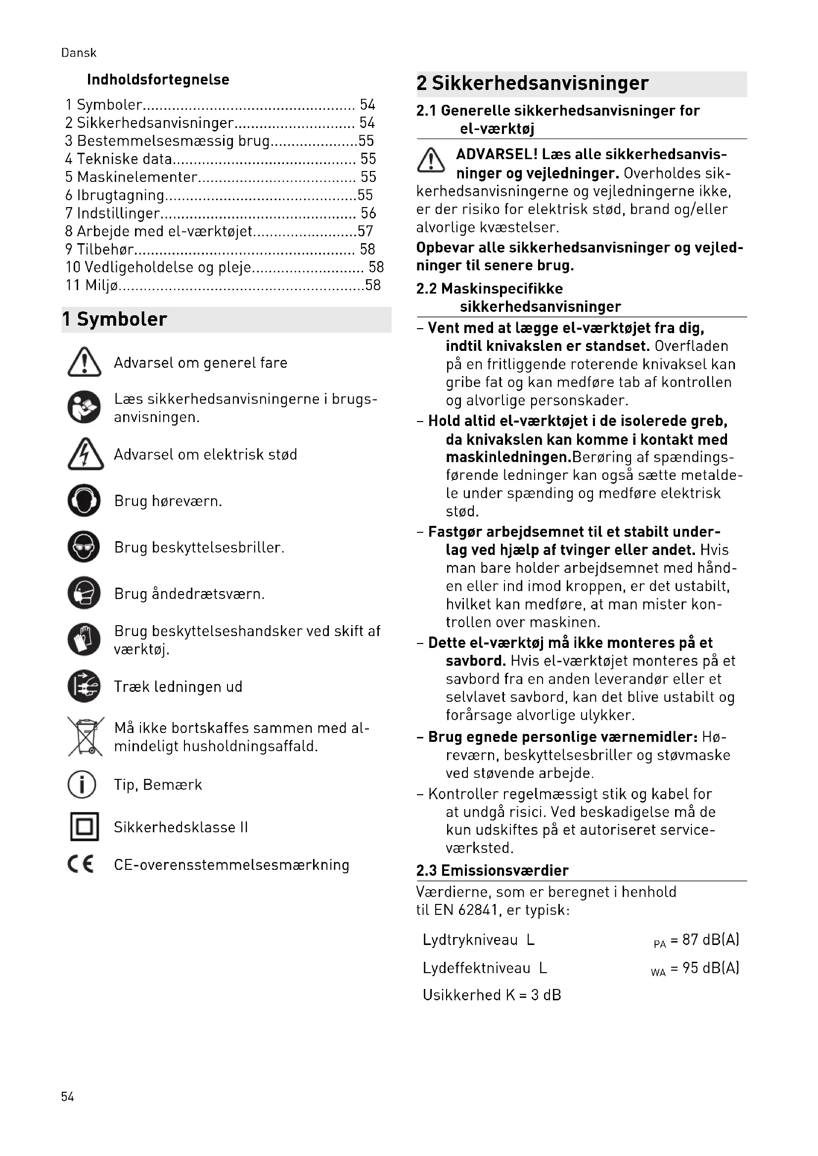 sikkerhedsanvisninger – Vent med at lægge el-værktøjet fra dig, indtil knivakslen er standset. Overfladen på en fritliggende roterende knivaksel kan gribe fat og kan medføre tab af kontrollen og alvorlige personskader. – Hold altid el-værktøjet i de isolerede greb, da knivakslen kan komme i kontakt med maskinledningen.Berøring af spændings førende ledninger kan også sætte metalde le under spænding og medføre elektrisk stød. – Fastgør arbejdsemnet til et stabilt under lag ved hjælp af tvinger eller andet. Hvis man bare holder arbejdsemnet med hånd en eller ind imod kroppen, er det ustabilt, hvilket kan medføre, at man mister kon trollen over maskinen. – Dette el-værktøj må ikke monteres på et savbord. Hvis el-værktøjet monteres på et savbord fra en anden leverandør eller et selvlavet savbord, kan det blive ustabilt og forårsage alvorlige ulykker. – Brug egnede personlige værnemidler: Hø reværn, beskyttelsesbriller og støvmaske ved støvende arbejde. – Kontroller regelmæssigt stik og kabel for at undgå risici. Ved beskadigelse må de kun udskiftes på et autoriseret service værksted.