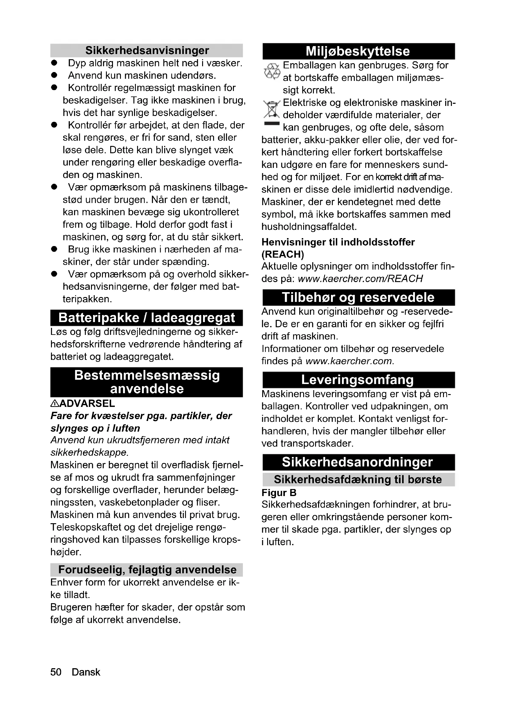 Figur K Advarsel om omkringflyvende genstande. Hold andre personer væk fra arbejdsområdet. Bær egnet høreværn og be- skyttelsesbriller under brug af maskinen. Beskyt maskinen mod regn og stænkvand. For brugere på op til 177 cm. For brugere højere end 178 cm. Til anvendelse under objekter, fx bænke. Drejeretning ved åbning af lå- seafdækning til børstebånd. Drejeretning ved lukning af lå- seafdækning til børstebånd.52 Dansk Indstilling af rengøringshoved Du kan tilpasse rengøringshovedets vinkel til dine rengøringsbehov. Maskinen har føl- gende indstillingsmuligheder: