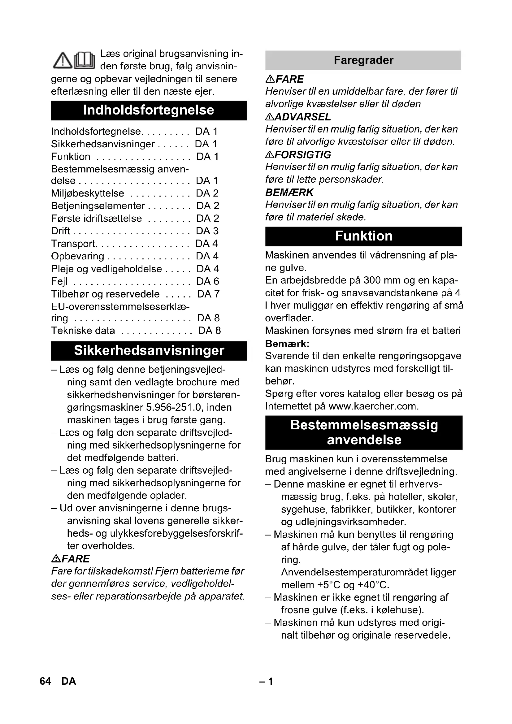 dB(A) 1 63PT– 1 Læs original brugsanvisning in- den første brug, følg anvisnin- gerne og opbevar vejledningen til senere efterlæsning eller til den næste ejer. – Læs og følg denne betjeningsvejled- ning samt den vedlagte brochure med sikkerhedshenvisninger for børsteren- gøringsmaskiner 5.956-251.0, inden maskinen tages i brug første gang. – Læs og følg den separate driftsvejled- ning med sikkerhedsoplysningerne for det medfølgende batteri. – Læs og følg den separate driftsvejled- ning med sikkerhedsoplysningerne for den medfølgende oplader. – Ud over anvisningerne i denne brugs- anvisning skal lovens generelle sikker- heds- og ulykkesforebyggelsesforskrif- ter overholdes. FARE Fare for tilskadekomst! Fjern batterierne før der gennemføres service, vedligeholdel- ses- eller reparationsarbejde på apparatet. FARE Henviser til en umiddelbar fare, der fører til alvorlige kvæstelser eller til døden 몇 ADVARSEL Henviser til en mulig farlig situation, der kan føre til alvorlige kvæstelser eller til døden. 몇 FORSIGTIG Henviser til en mulig farlig situation, der kan føre til lette personskader. BEMÆRK Henviser til en mulig farlig situation, der kan føre til materiel skade. Maskinen anvendes til vådrensning af pla- ne gulve. En arbejdsbredde på 300 mm og en kapa- citet for frisk- og snavsevandstankene på 4 l hver muliggør en effektiv rengøring af små overflader. Maskinen forsynes med strøm fra et batteri Bemærk: Svarende til den enkelte rengøringsopgave kan maskinen udstyres med forskelligt til- behør. Spørg efter vores katalog eller besøg os på Internettet på www.kaercher.com. Brug maskinen kun i overensstemmelse med angivelserne i denne driftsvejledning. – Denne maskine er egnet til erhvervs- mæssig brug, f.eks. på hoteller, skoler, sygehuse, fabrikker, butikker, kontorer og udlejningsvirksomheder. – Maskinen må kun benyttes til rengøring af hårde gulve, der tåler fugt og pole- ring. Anvendelsestemperaturområdet ligger mellem +5°C og +40°C. – Maskinen er ikke egnet til rengøring af frosne gulve (f.eks. i kølehuse). – Maskinen må kun udstyres med origi- nalt tilbehør og originale reservedele. Indholdsfortegnelse Indholdsfortegnelse. . . . . . . . . DA 1 Sikkerhedsanvisninger . . . . . . DA 1 Funktion . . . . . . . . . . . . . . . . . DA 1 Bestemmelsesmæssig anven- delse . . . . . . . . . . . . . . . . . . . . DA 1 Miljøbeskyttelse . . . . . . . . . . . DA 2 Betjeningselementer . . . . . . . . DA 2 Første idriftsættelse . . . . . . . . DA 2 Drift . . . . . . . . . . . . . . . . . . . . . DA 3 Transport. . . . . . . . . . . . . . . . . DA 4 Opbevaring . . . . . . . . . . . . . . . DA 4 Pleje og vedligeholdelse . . . . . DA 4 Fejl . . . . . . . . . . . . . . . . . . . . . DA 6 Tilbehør og reservedele . . . . . DA 7 EU-overensstemmelseserklæ- ring . . . . . . . . . . . . . . . . . . . . . DA 8 Tekniske data . . . . . . . . . . . . . DA 8 Sikkerhedsanvisninger Faregrader Funktion Bestemmelsesmæssig anvendelse 64 DA– 2 – Maskinen er udviklet til rengøring af in- dendørs gulve eller tagoverdækkede flader. – Maskinen er ikke beregnet til rengøring af offentlige færdselsårer. – Maskinen er ikke egnet til brug i eksplo- sionsudsatte omgivelser. Henvisninger til indholdsstoffer (REACH) Aktuelle oplysninger til indholdsstoffer fin- der du på: www.kaercher.com/REACH Figurer, se omslaget Figur 1 Håndtag 2 Afbryder vandpumpe 3 Knap børste-/sugedrift 4 Bæregreb 5 Bærebøjle snavsevandstank 6 Snavsevandsbeholder 7 Ferskvandtank 8 Lukning af ferskvandstanken (påfyld- ningsåbning) 9 Akku 10 Batteriholder 11 Rensehoved 12 Pedal "Løfte sugebjælke" 13 Udløsning parkeringsstilling 14 Batteri-indikator Se også betjeningsvejledningen til bat- teriet 15 Åbningsmekanisme, batteri 16 Frigørelsesknap, skiftebørst 17 Børstevalse 18 Sugebjælke 19 Dæksel til snavsevandsbeholder 20 Lukning af låg på spildevandstanken 21 Påfyldningsindikator 22 Batteriopladningsindikator 3 LED'er lyser: 100-76% resterende ka- pacitet 2 LED'er lyser: 75-51% resterende ka- pacitet 1 LED lyser: 50-26% resterende kapa- citet 1 LED blinker: Mindre end 26% reste- rende kapacitet, oplad batteriet 23 Tilslutning af sugerør/sugeslange 24 Sugerør 25 Sugeslange Figur Sæt røret med grebets ende ind i ma- skinens åbning. Tryk næserne og skub grebet ind indtil den går i hak i maskinen. Juster kablet i maskinen og sæt låget på som vist på vedlagt seddel. Oplade akkuer Beskrivelsen af dette findes i de sepa- rate betjeningsvejledninger til batteriet og opladeren Figur Sæt det opladede batteri i batteriholde- ren, og skub det så langt ind som mu- ligt, så det går i indgreb. Miljøbeskyttelse Emballagen kan genbruges. Smid ikke emballagen ud sam- men med det almindelige hus- holdningsaffald, men aflever den til genbrug. Udtjente apparater indeholder værdifulde materialer, der kan og bør afleveres til genbrug. Akku'er og batterier indeholder stoffer, der ikke må komme ud i naturen. Aflever derfor udtjente apparater, batterier og akkuer på en gen- brugsstation eller lignende. Elektriske og elektroniske maski- ner indeholder ofte bestanddele, der ved forkert omgang eller for- kert bortskaffelse kan udgøre en mulig fare for menneskers sund- hed og for miljøet. For en korrekt drift af maskinen er disse be- standdele imidlertid nødvendige. Maskiner kendetegnet med dette symbol må ikke bortskaffes sam- men med husholdningsaffaldet. Betjeningselementer Første idriftsættelse Isæt akku 65DA– 3 몇 FORSIGTIG Risiko for beskadigelse. Brug kun de anbe- falede rengøringsmidler. Til brug af andre rensemidler er brugeren/ejeren ansvarligt for risikoen med hensyn til driftssikkerhed og ulykkesfarer. Brug kun rensemidler som er fri for opløsningsmidler, salt- og flussyre. Tag højde for sikkerhedsanvisningerne på rensemidlerne. BEMÆRK Brug ikke stærkt skummende rengørings- midler. Overhold doseringsanvisningerne. Anbefalede rengøring