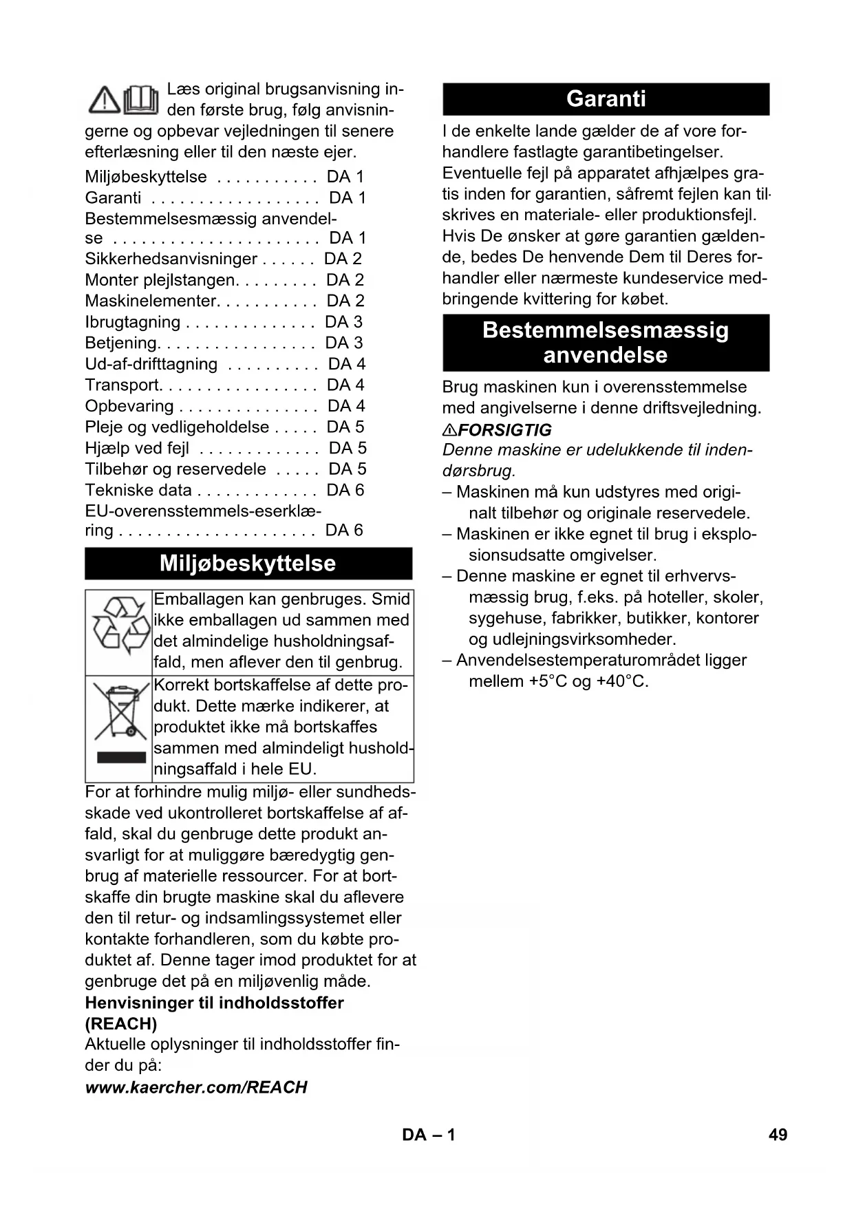 Chairman of the Board of Management Director Regulatory Affairs & Certification 48 PT– 1 Læs original brugsanvisning in- den første brug, følg anvisnin- gerne og opbevar vejledningen til senere efterlæsning eller til den næste ejer. For at forhindre mulig miljø- eller sundheds- skade ved ukontrolleret bortskaffelse af af- fald, skal du genbruge dette produkt an- svarligt for at muliggøre bæredygtig gen- brug af materielle ressourcer. For at bort- skaffe din brugte maskine skal du aflevere den til retur- og indsamlingssystemet eller kontakte forhandleren, som du købte pro- duktet af. Denne tager imod produktet for at genbruge det på en miljøvenlig måde. Henvisninger til indholdsstoffer (REACH) Aktuelle oplysninger til indholdsstoffer fin- der du på: www.kaercher.com/REACH I de enkelte lande gælder de af vore for- handlere fastlagte garantibetingelser. Eventuelle fejl på apparatet afhjælpes gra- tis inden for garantien, såfremt fejlen kan til- skrives en materiale- eller produktionsfejl. Hvis De ønsker at gøre garantien gælden- de, bedes De henvende Dem til Deres for- handler eller nærmeste kundeservice med- bringende kvittering for købet. Brug maskinen kun i overensstemmelse med angivelserne i denne driftsvejledning. 몇 FORSIGTIG Denne maskine er udelukkende til inden- dørsbrug. – Maskinen må kun udstyres med origi- nalt tilbehør og originale reservedele. – Maskinen er ikke egnet til brug i eksplo- sionsudsatte omgivelser. – Denne maskine er egnet til erhvervs- mæssig brug, f.eks. på hoteller, skoler, sygehuse, fabrikker, butikker, kontorer og udlejningsvirksomheder. – Anvendelsestemperaturområdet ligger mellem +5°C og +40°C. Miljøbeskyttelse . . . . . . . . . . . DA 1 Garanti . . . . . . . . . . . . . . . . . . DA 1 Bestemmelsesmæssig anvendel- se . . . . . . . . . . . . . . . . . . . . . . DA 1 Sikkerhedsanvisninger . . . . . . DA 2 Monter plejlstangen. . . . . . . . . DA 2 Maskinelementer. . . . . . . . . . . DA 2 Ibrugtagning . . . . . . . . . . . . . . DA 3 Betjening. . . . . . . . . . . . . . . . . DA 3 Ud-af-drifttagning . . . . . . . . . . DA 4 Transport. . . . . . . . . . . . . . . . . DA 4 Opbevaring . . . . . . . . . . . . . . . DA 4 Pleje og vedligeholdelse . . . . . DA 5 Hjælp ved fejl . . . . . . . . . . . . . DA 5 Tilbehør og reservedele . . . . . DA 5 Tekniske data . . . . . . . . . . . . . DA 6 EU-overensstemmels-eserklæ- ring . . . . . . . . . . . . . . . . . . . . . DA 6 Miljøbeskyttelse Emballagen kan genbruges. Smid ikke emballagen ud sammen med det almindelige husholdningsaf- fald, men aflever den til genbrug. Korrekt bortskaffelse af dette pro- dukt. Dette mærke indikerer, at produktet ikke må bortskaffes sammen med almindeligt hushold- ningsaffald i hele EU. Garanti Bestemmelsesmæssig anvendelse 49DA– 2 Læs og følg denne betjeningsvejledning samt den vedlagte brochure med sikker- hedsanvisninger for disc-enskivemaskiner, nr. 5.956-659, inden maskinen tages i brug første gang. FARE Henviser til en umiddelbar fare, der fører til alvorlige kvæstelser eller til døden 몇 ADVARSEL Henviser til en mulig farlig situation, der kan føre til alvorlige kvæstelser eller til døden. 몇 FORSIGTIG Henviser til en mulig farlig situation, der kan føre til lette personskader. BEMÆRK Henviser til en mulig farlig situation, der kan føre til materiel skade. Sikkerhedsanordningerne tjener brugerens beskyttelse og må ikke sættes ud af drift og deres funktion må ikke omgås. Forhindrer, at maskinen tændes utilsigtet. For at tænde maskinen skal du først trykke på udløserknappen og derefter på tænd/ sluk-kontakten. Inden ibrugtagning skal plejlstangen mon- teres som vist, og der oprettes en elektrisk forbindelse. Figurer, se omslaget Illustrationen viser maskinen BDS 43/150 C Classic. Maskinen BDS 43/Duo C adskil- ler sig lidt fra denne. 1 Medbringer, skivebørste / pad-drivpla-