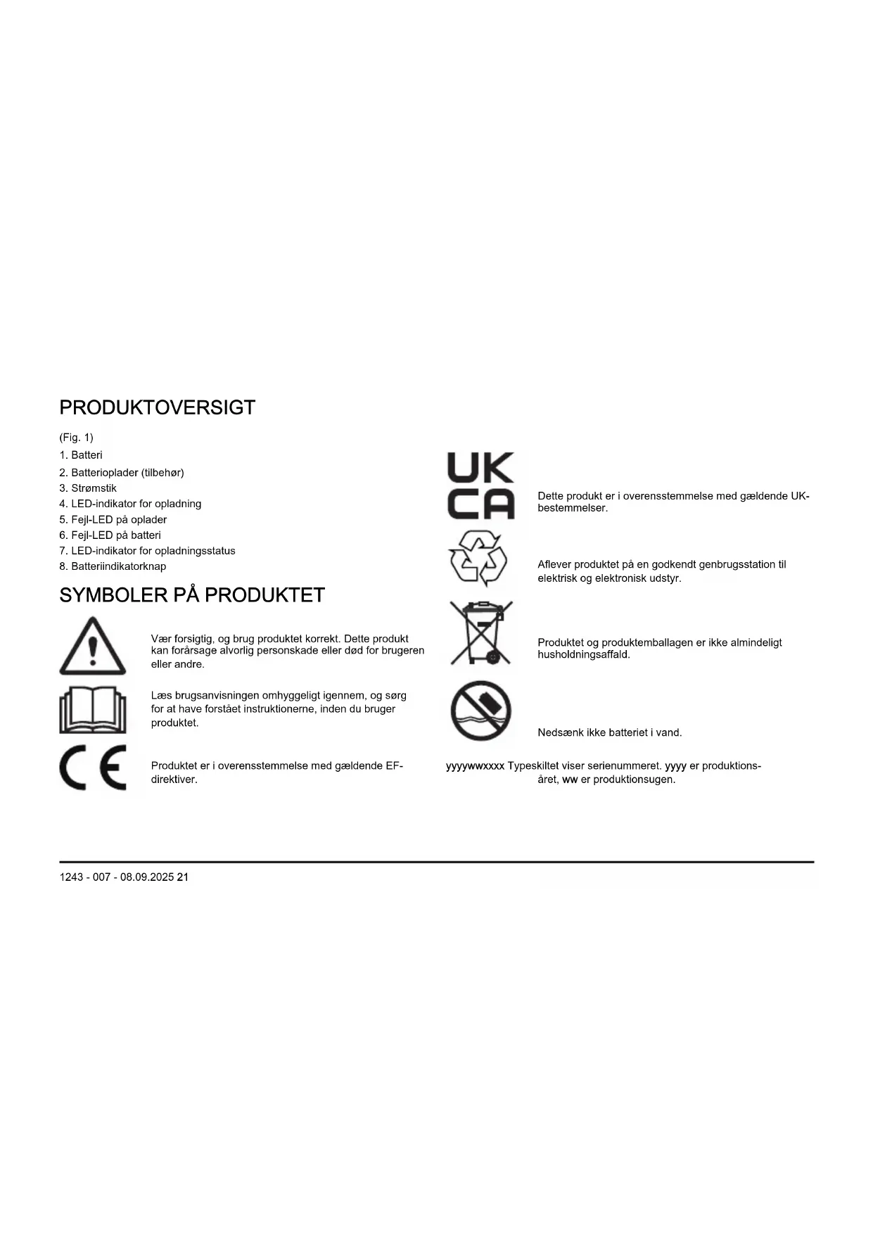 Vær forsigtig, og brug produktet korrekt. Dette produkt kan forårsage alvorlig personskade eller død for brugeren eller andre. Læs brugsanvisningen omhyggeligt igennem, og sørg for at have forstået instruktionerne, inden du bruger produktet. Produktet er i overensstemmelse med gældende EF- direktiver. Dette produkt er i overensstemmelse med gældende UK- bestemmelser. Aflever produktet på en godkendt genbrugsstation til elektrisk og elektronisk udstyr. Produktet og produktemballagen er ikke almindeligt husholdningsaffald. Nedsænk ikke batteriet i vand. yyyywwxxxx Typeskiltet viser serienummeret. yyyy er produktions- året, ww er produktionsugen. 1243 - 007 - 08.09.2025 21Bemærk: Andre symboler/mærkater på produktet henviser til certificeringskrav i visse handelsområder. Skader på produktet Vi er ikke ansvarlige for skader på vores produkt, hvis: