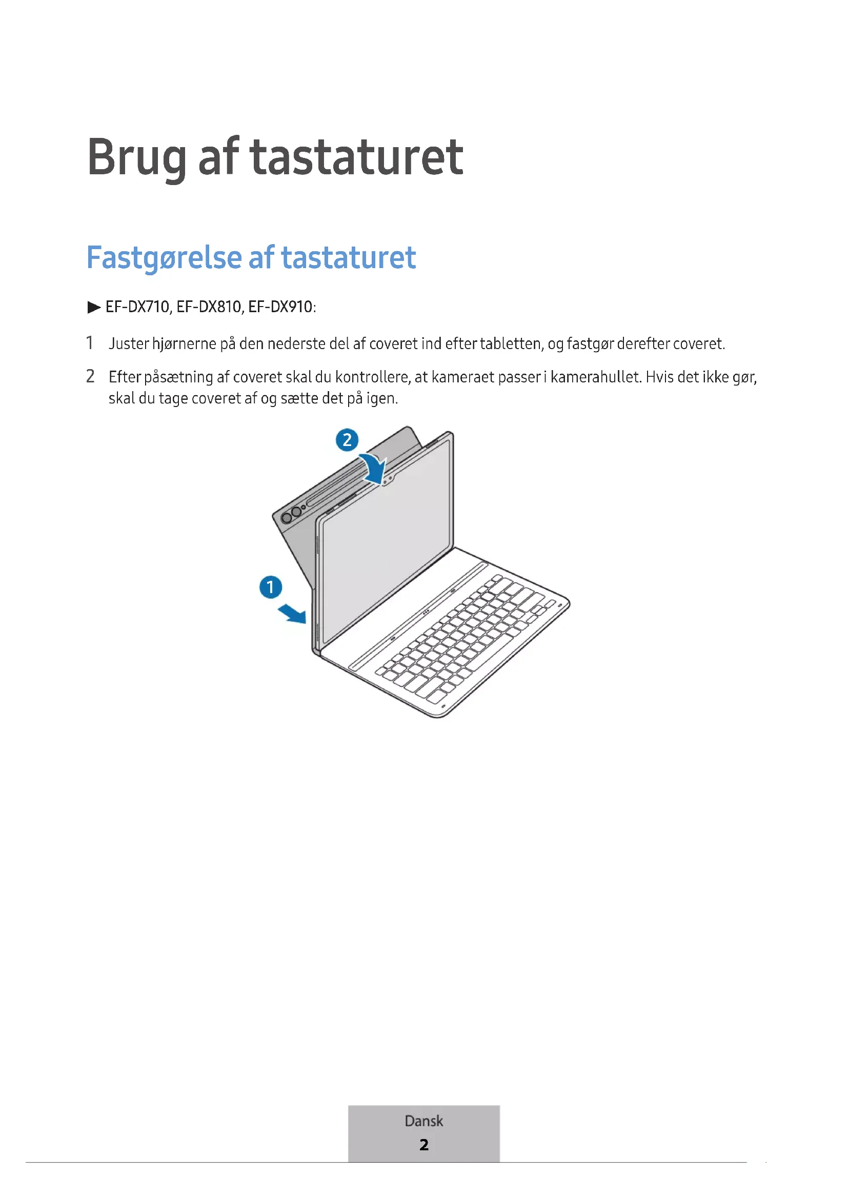 EF-DX715, EF-DX815, EF-DX915: 1 Kontroller placeringen af kameraet og kamerahullet, og juster derefter hvert hjørne af den øverste del af coveret med tabletten. 2 Fastgør den øverste del af coveret først, og tryk derefter den resterende del ned. Dansk 3Brug af tastaturet