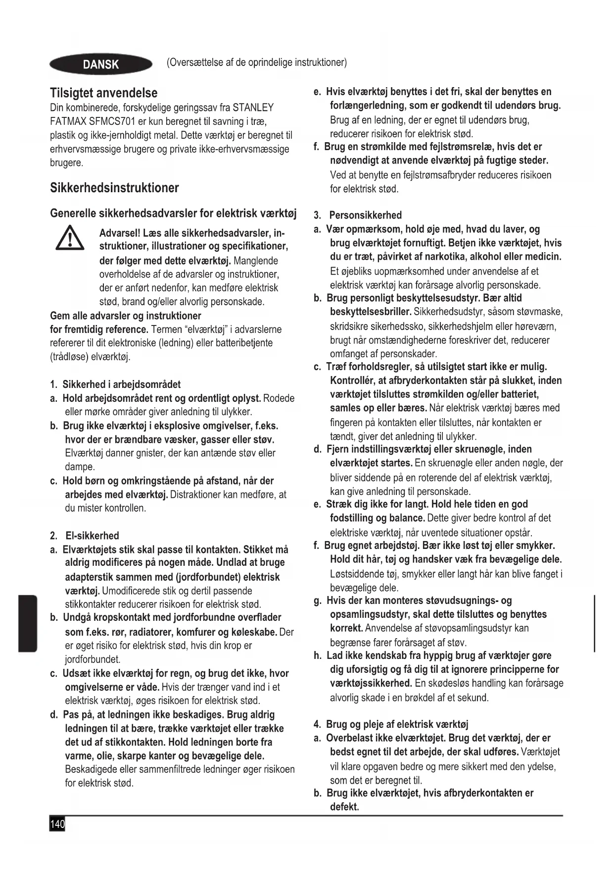 Forsøg ikke at oplade beskadigede batterier. Opladere u Brug kun din Stanley FatMax-lader til at oplade batteriet i det værktøj, som den blev leveret sammen med. Andre batterier kan eksplodere og forårsage personskade og materiel skade. u Forsøg aldrig at oplade ikke-genopladelige batterier. u Udskift straks defekte ledninger. u Laderen må ikke udsættes for fugt. u Laderen må ikke åbnes. u Undersøg ikke laderen.145 (Oversættelse af de oprindelige instruktioner) DANSK