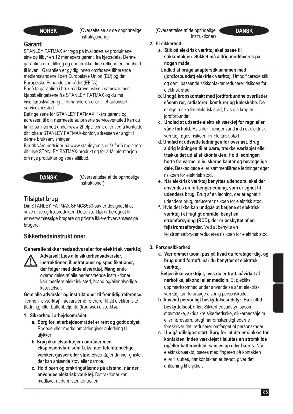 SFMCS550 Rundsav STANLEY FATMAX erklærer, at produkterne beskrevet under “tekniske data” er i overensstemmelse med: EN62841-1:2015 , EN62841-2-5:2014. Disse produkter er endvidere i overensstemmelse med direktiv 2006/42/EF, 2014/30/EU og 2011/65/EU. Kontakt STANLEY FATMAX på nedenstående adresse, eller se vejledningens bagside for at få ere oplysninger. Undertegnede er ansvarlig for udarbejdelsen af den tekniske l og fremsætter denne erklæring på vegne af STANLEY FATMAX. Ed Higgins Direktør – Consumer Power Tools STANLEY FATMAX Europe, Egide Walschaertsstraat 14-18, 2800 Mechelen, Belgien 25/11/2019 Garanti STANLEY FATMAX er sikker på kvaliteten af sine produkter og giver forbrugerne en garanti på 12 måneder fra købsdatoen. Denne garanti er en tilføjelse til dine lovbefalede rettigheder. Garantien er gyldig inden for medlemsstaterne af Den Europæiske Union og Det Europæiske Frihandelsområde. Når du gør krav på garantien, skal kravet være i overensstemmelse med STANLEY FATMAX vilkår og betingelser, og du skal indsende dokumentation for købet til sælgeren eller til en autoriseret reparatør. Vilkår og betingelser for STANLEY FATMAX 1 års garanti og placeringen af dit nærmeste autoriserede serviceværksted kan fås på internettet på www.2helpU.com, eller ved at kontakte dit lokale STANLEY FATMAX kontor på den adresse, der er angivet i denne vejledning. Besøg venligst vores websted www.stanleytools.eu/3 for at registrere dit nye STANLEY FATMAX-produkt og modtage opdateringer om nye produkter og specielle tilbud. (Alkuperäisten ohjeiden käännös) SUOMI Käyttötarkoitus STANLEY FATMAX SFMCS550 -saha on suunniteltu puun ja puutuotteiden sahaamiseen. Työkalu on tarkoitettu sekä ammatti- että yksityiskäyttöön. Turvaohjeet Sähkötyökalun yleiset turvallisuusvaroitukset