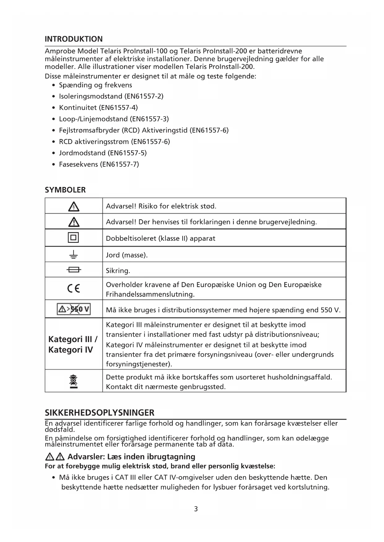 INTRODUKTIONAmprobe Model Telaris ProInstall-100 og Telaris ProInstall-200 er batteridrevne måleinstrumenter af elektriske installationer. Denne brugervejledning gælder for alle modeller. Alle illustrationer viser modellen Telaris ProInstall-200.Disse måleinstrumenter er designet til at måle og teste følgende:• Spænding og frekvens• Isoleringsmodstand (EN61557-2)• Kontinuitet (EN61557-4)• Loop-/Linjemodstand (EN61557-3)• Fejlstrømsafbryder (RCD) Aktiveringstid (EN61557-6)• RCD aktiveringsstrøm (EN61557-6)• Jordmodstand (EN61557-5)• Fasesekvens (EN61557-7)SYMBOLER Advarsel! Risiko for elektrisk stød. Advarsel! Der henvises til forklaringen i denne brugervejledning. Dobbeltisoleret (klasse II) apparat Jord (masse). Sikring. Overholder kravene af Den Europæiske Union og Den Europæiske Frihandelssammenslutning.Må ikke bruges i distributionssystemer med højere spænding end 550 V.Kategori III / Kategori IVKategori III måleinstrumenter er designet til at beskytte imod transienter i installationer med fast udstyr på distributionsniveau; Kategori IV måleinstrumenter er designet til at beskytte imod transienter fra det primære forsyningsniveau (over- eller undergrunds forsyningstjenester). Dette produkt må ikke bortskaffes som usorteret husholdningsaffald. Kontakt dit nærmeste genbrugssted. SIKKERHEDSOPLYSNINGER En advarsel identificerer farlige forhold og handlinger, som kan forårsage kvæstelser eller dødsfald.En påmindelse om forsigtighed identificerer forhold og handlinger, som kan ødelægge måleinstrumentet eller forårsage permanente tab af data. W Advarsler: Læs inden ibrugtagning For at forebygge mulig elektrisk stød, brand eller personlig kvæstelse:• Må ikke bruges i CAT III eller CAT IV-omgivelser uden den beskyttende hætte. Den beskyttende hætte nedsætter muligheden for lysbuer forårsaget ved kortslutning.4
