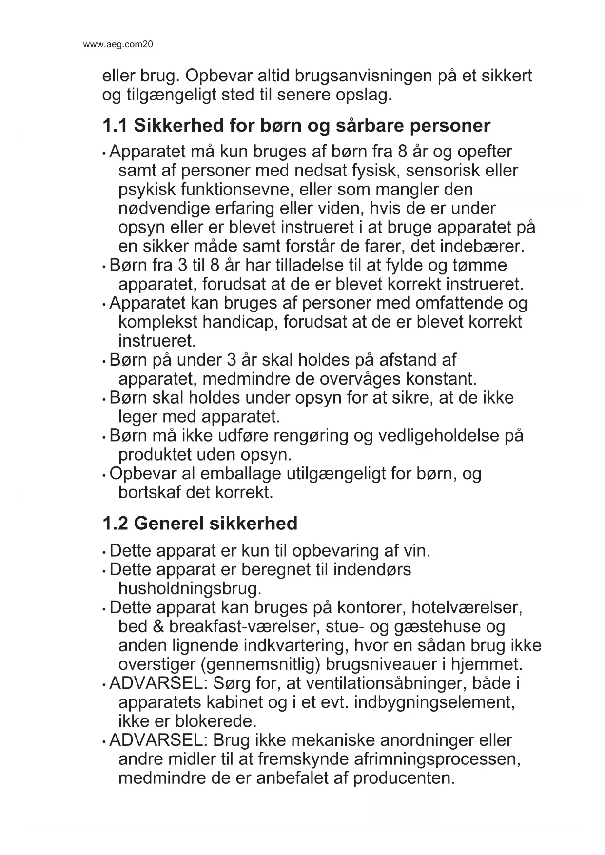 - ADVARSEL: Brug ikke mekaniske anordninger eller andre midler til at fremskynde afrimningsprocessen, medmindre de er anbefalet af producenten. www.aeg.com20• ADVARSEL: Undlad at beskadige kølekredsløbet.